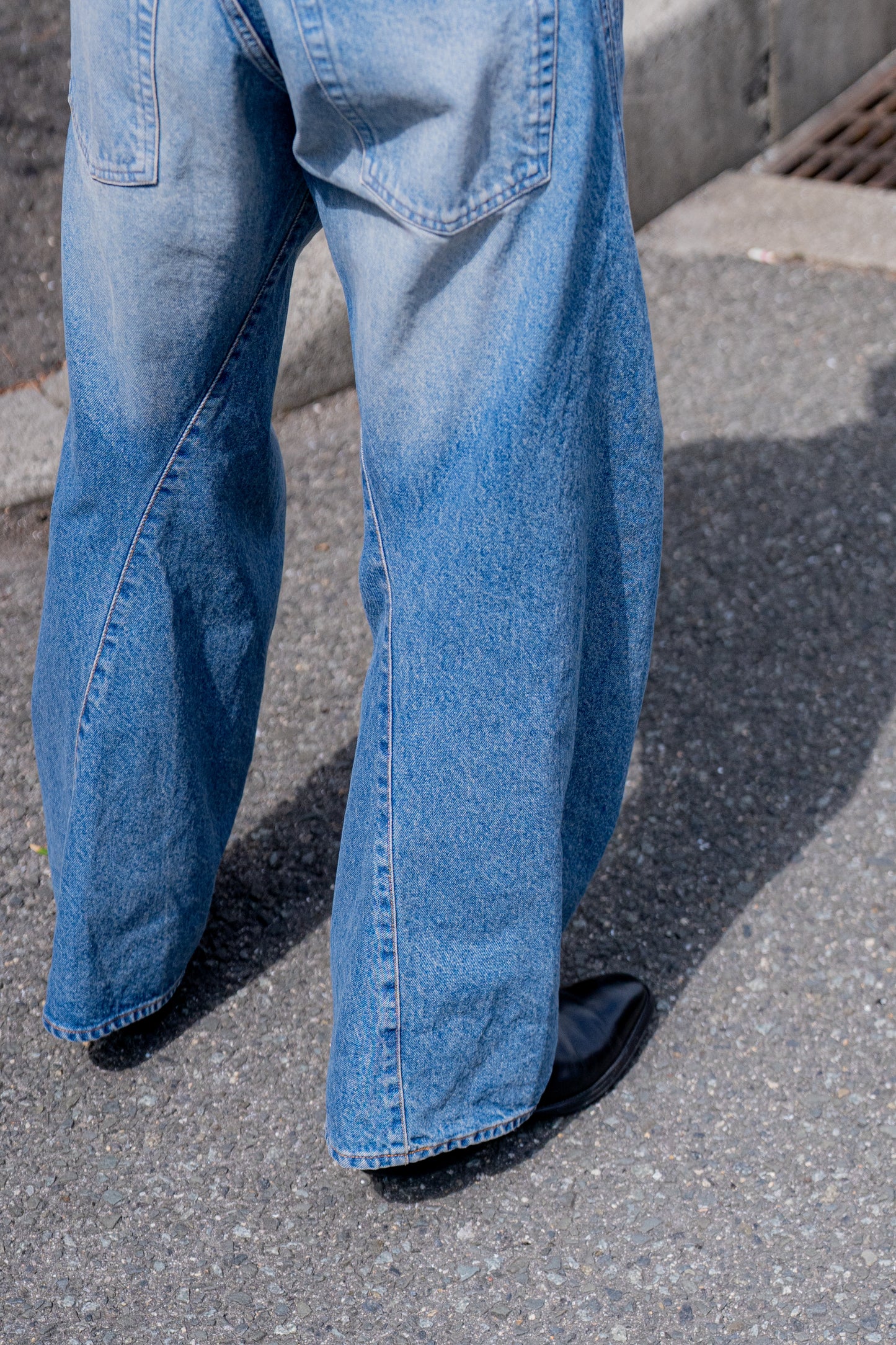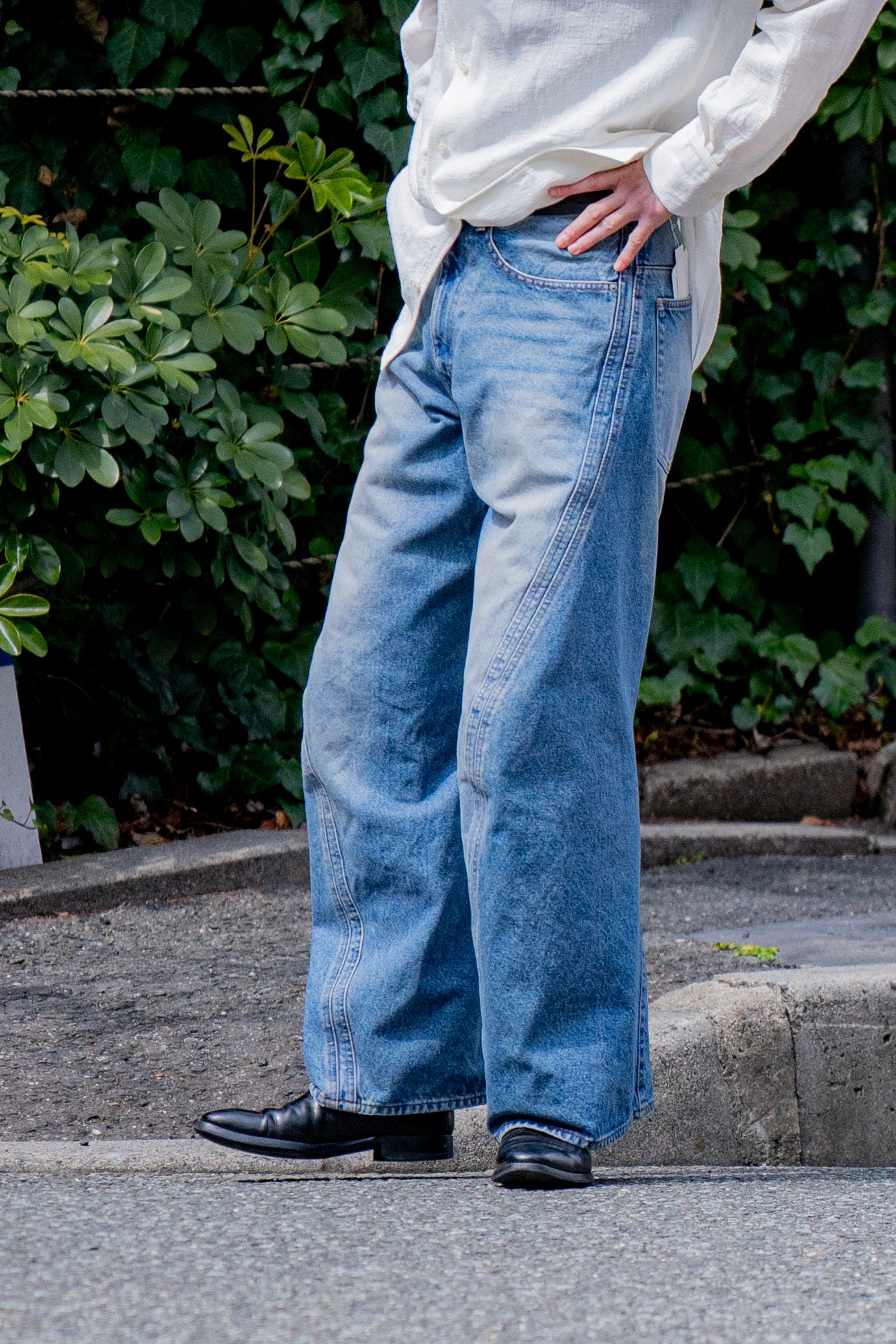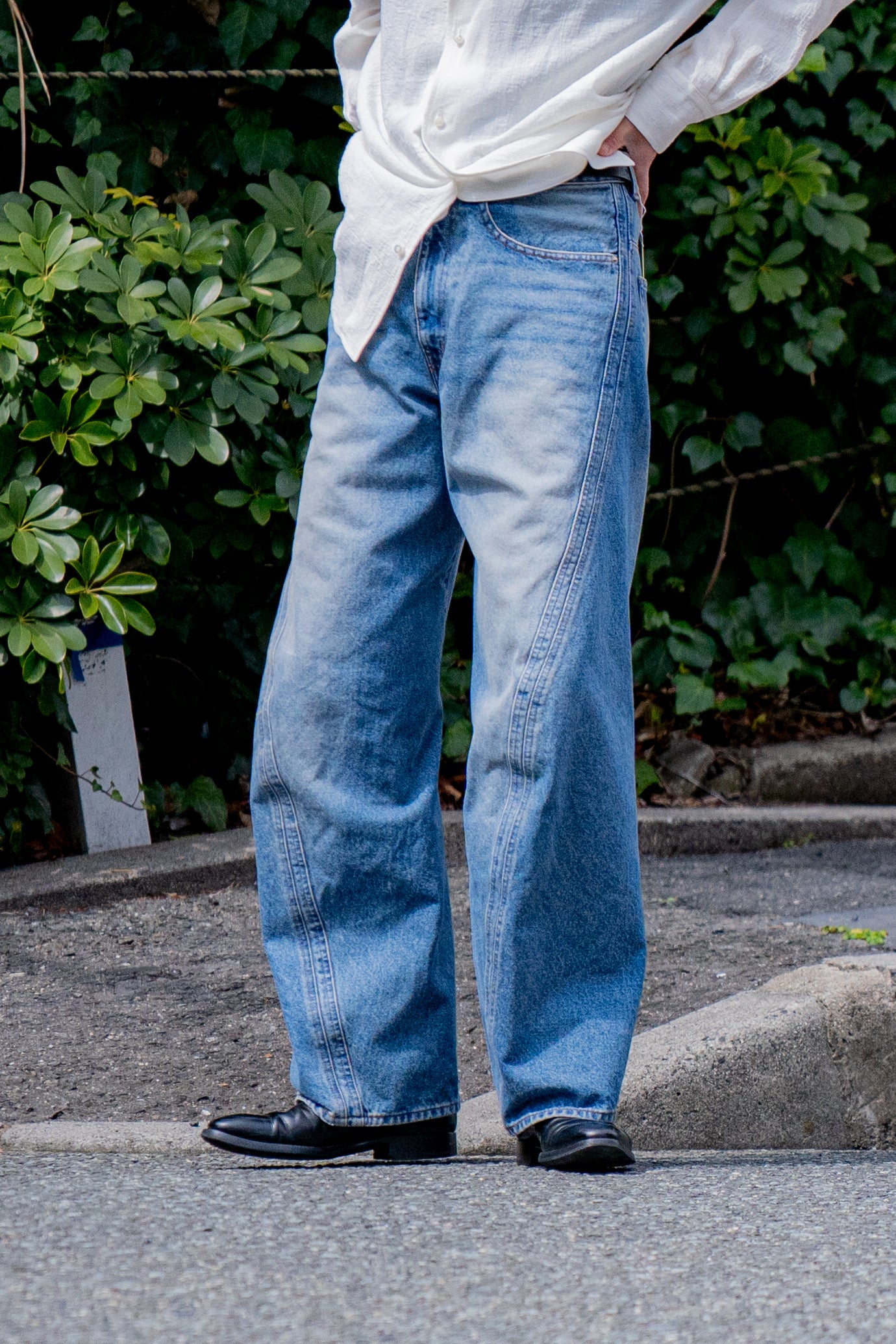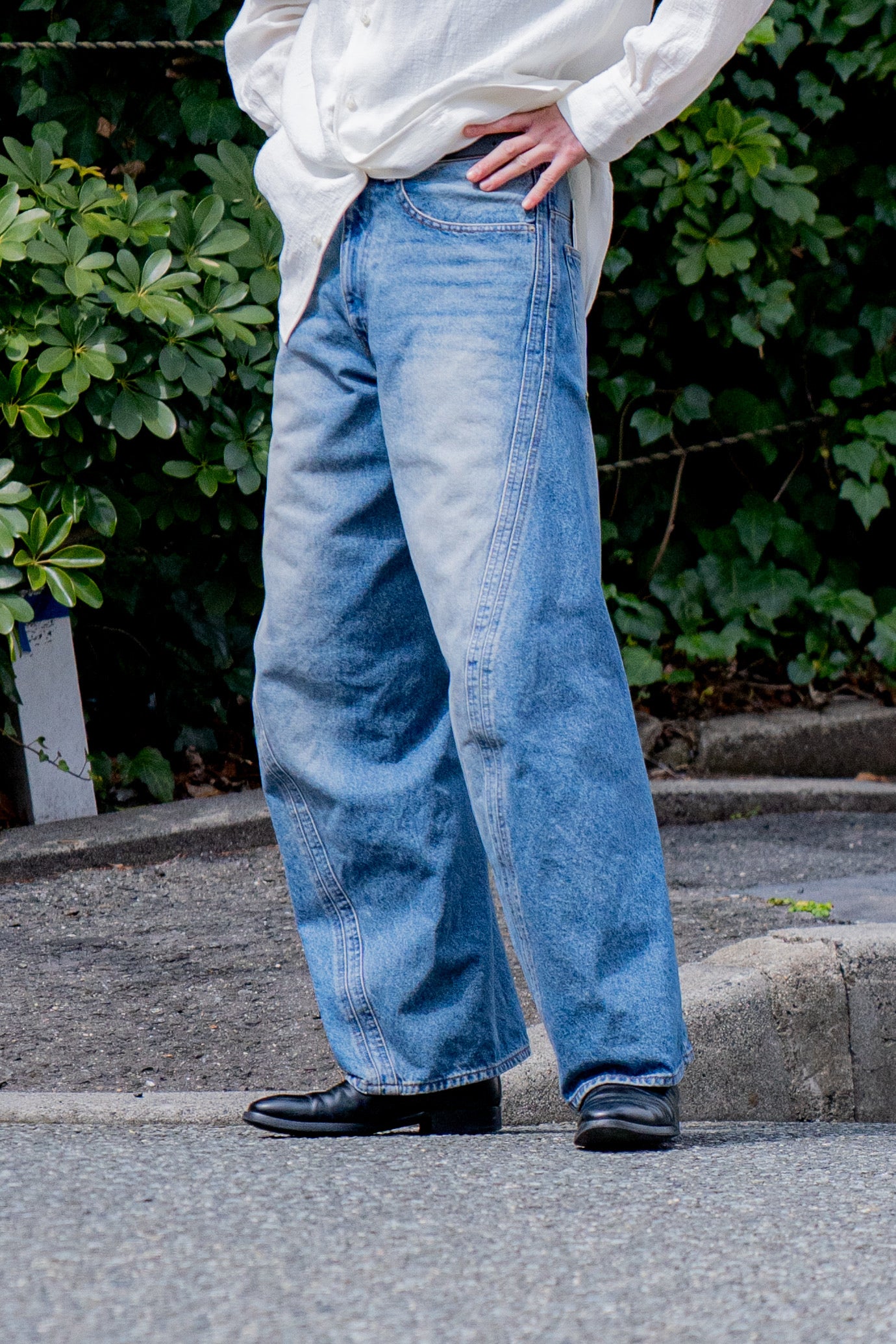 14ozのムラ糸空紡糸によるインディゴデニムを使用したワイドシルエット立体裁断ジーンズ。ヴィンテージウォッシュ加工。00's初期に見られた立体裁断ジーンズから着想し現代的なシルエットにアップデート。