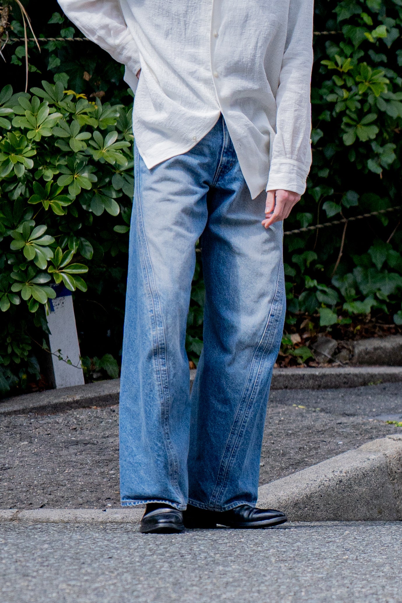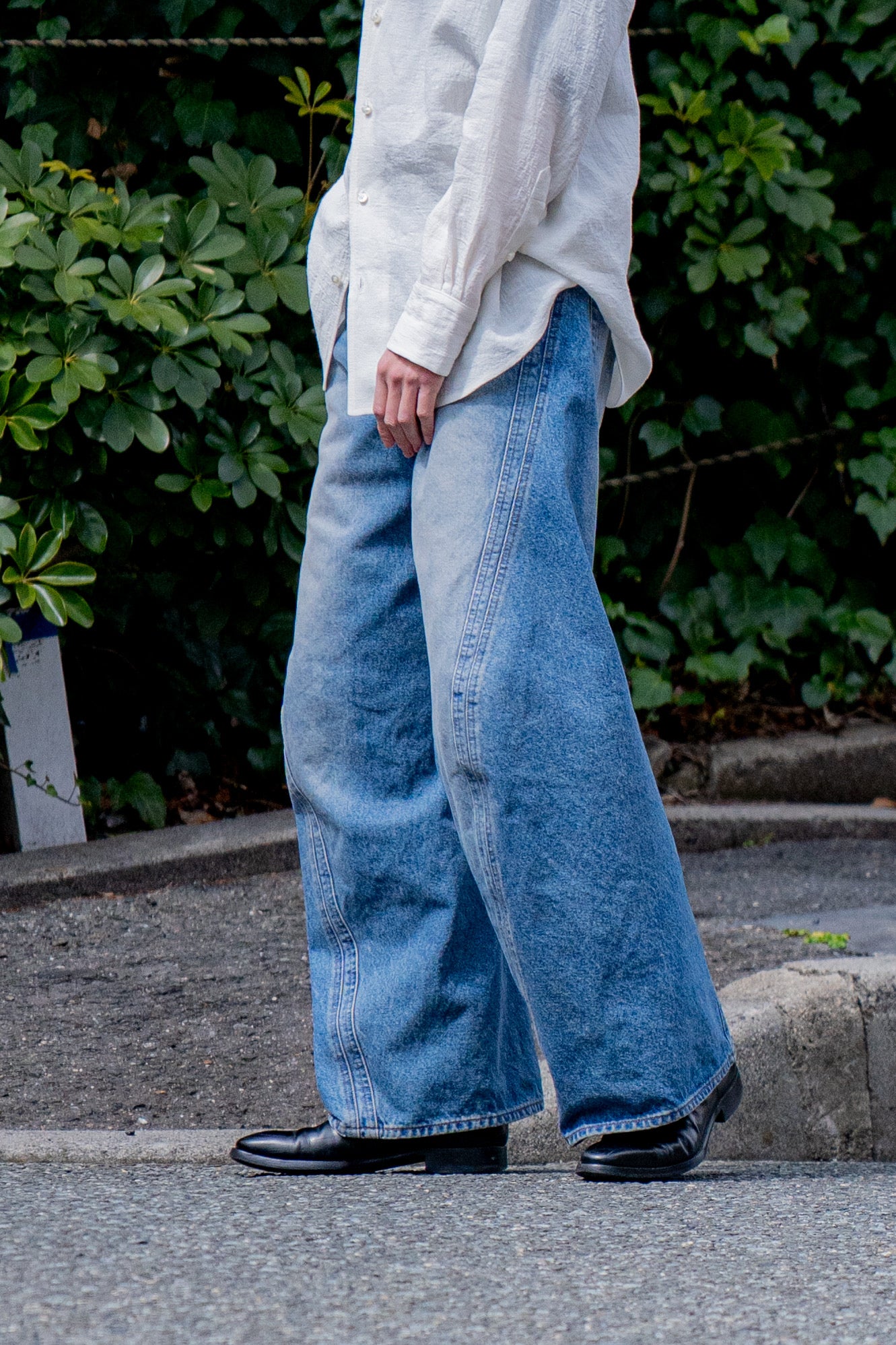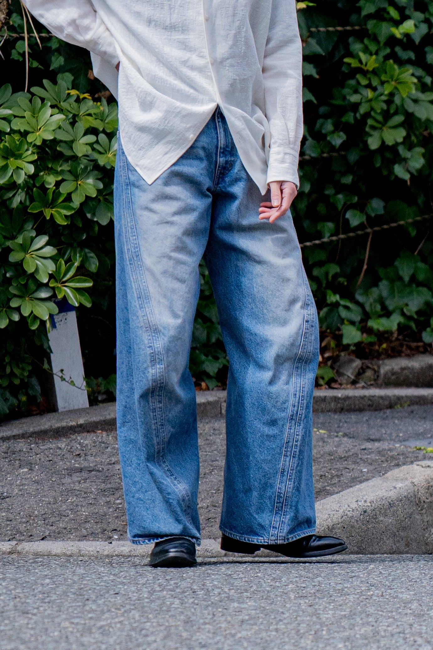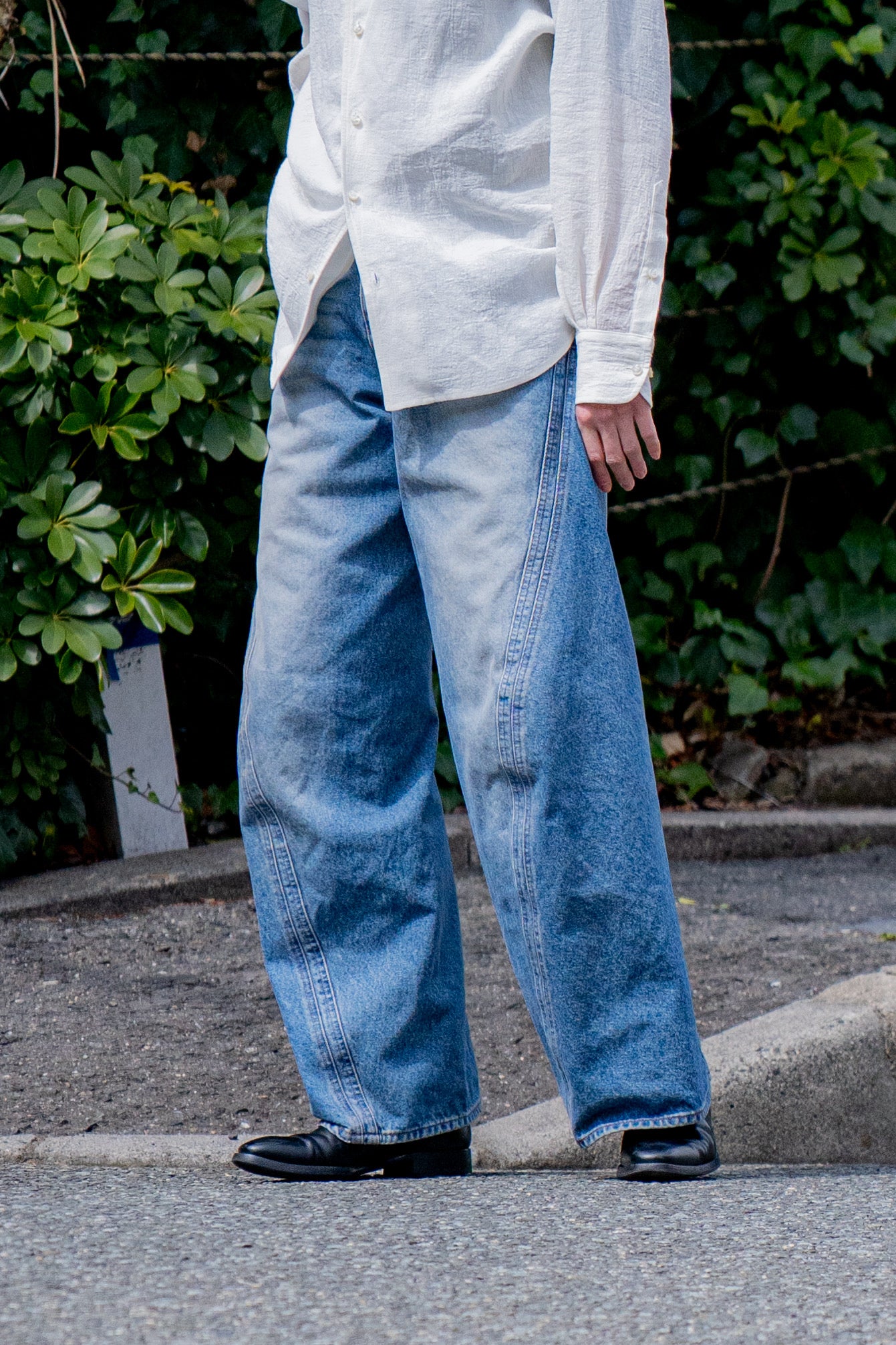 14ozのムラ糸空紡糸によるインディゴデニムを使用したワイドシルエット立体裁断ジーンズ。ヴィンテージウォッシュ加工。00's初期に見られた立体裁断ジーンズから着想し現代的なシルエットにアップデート。