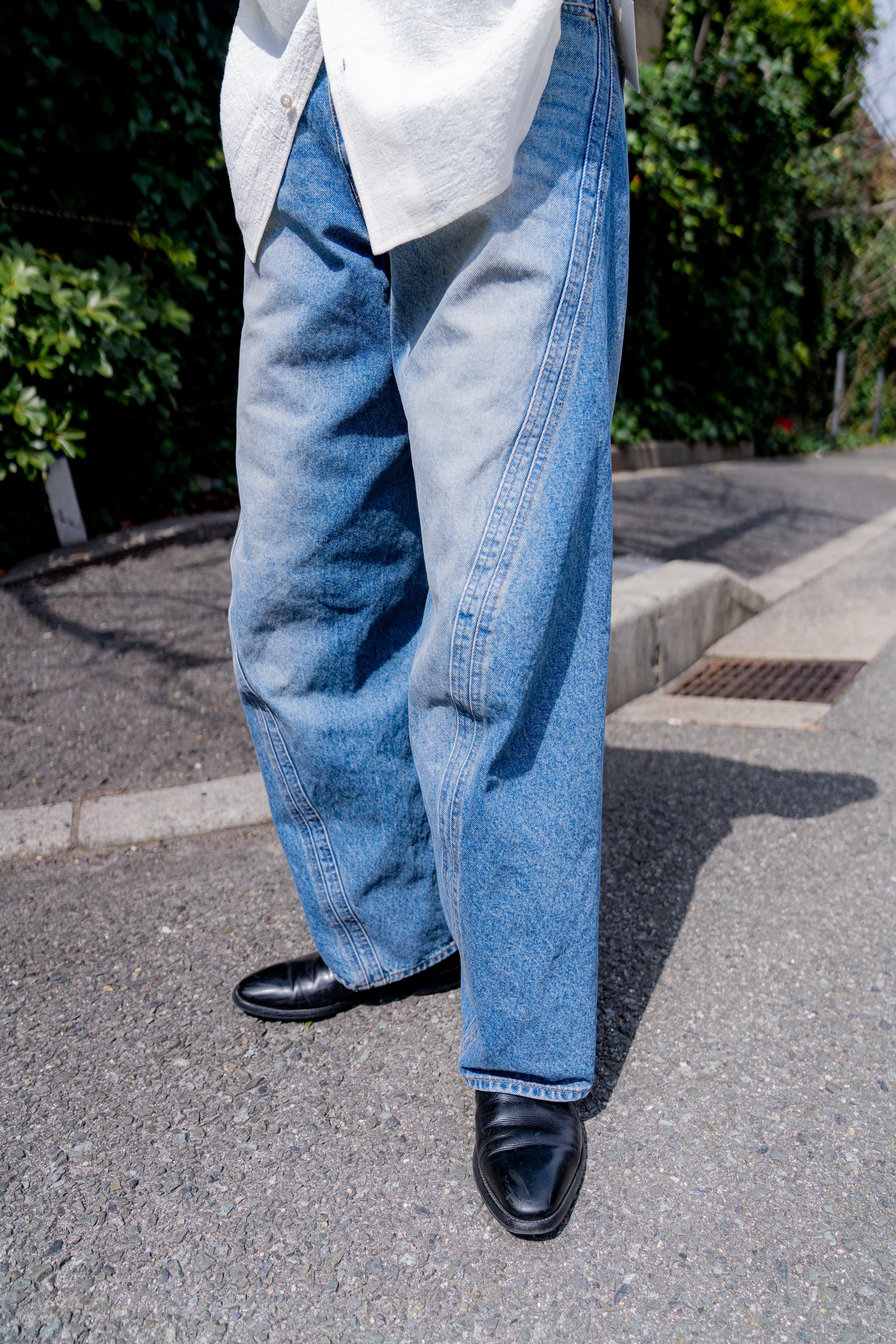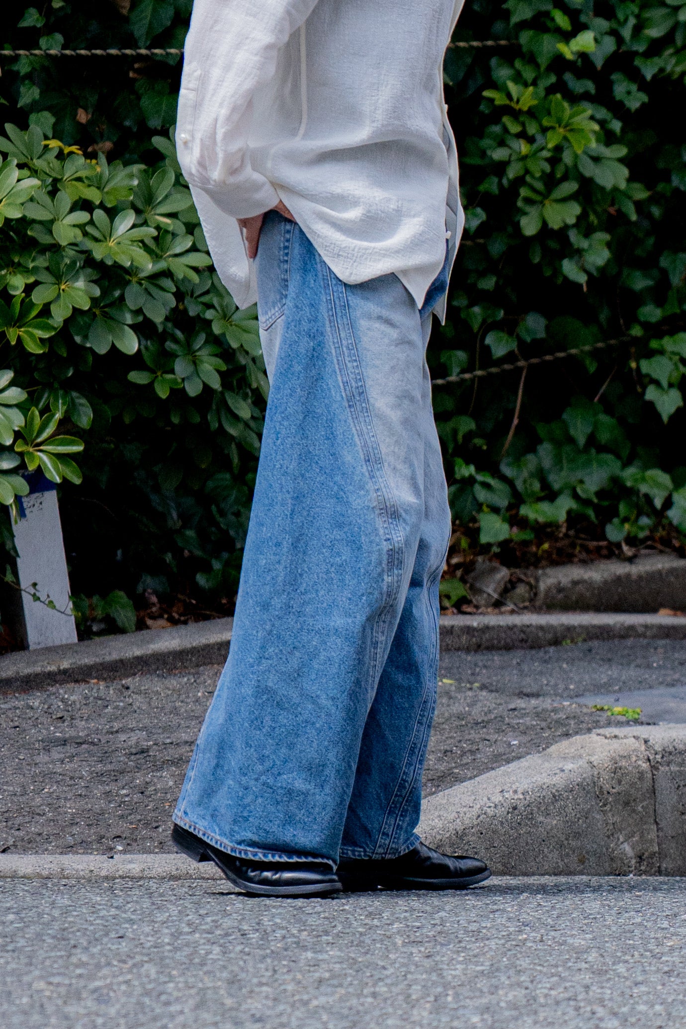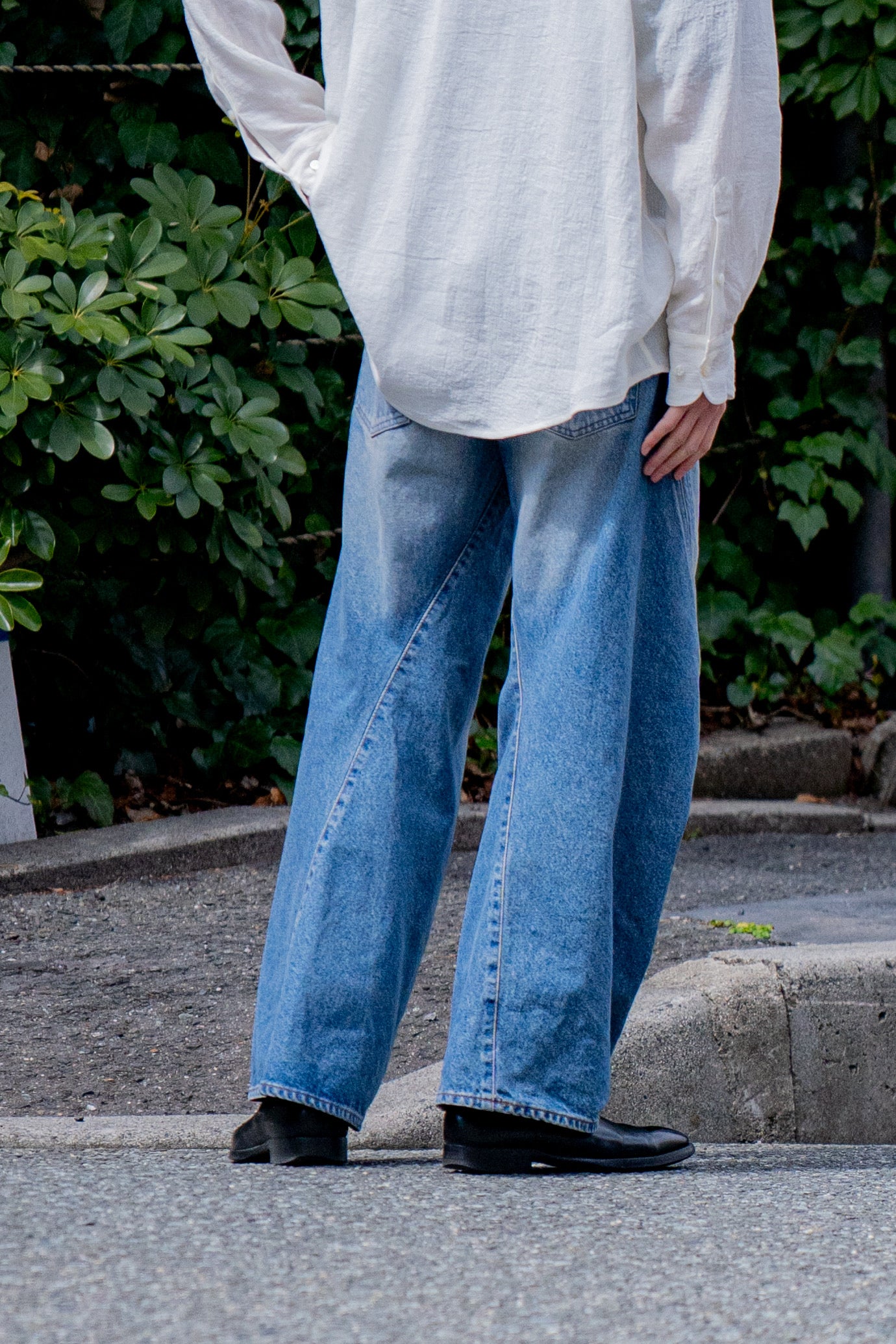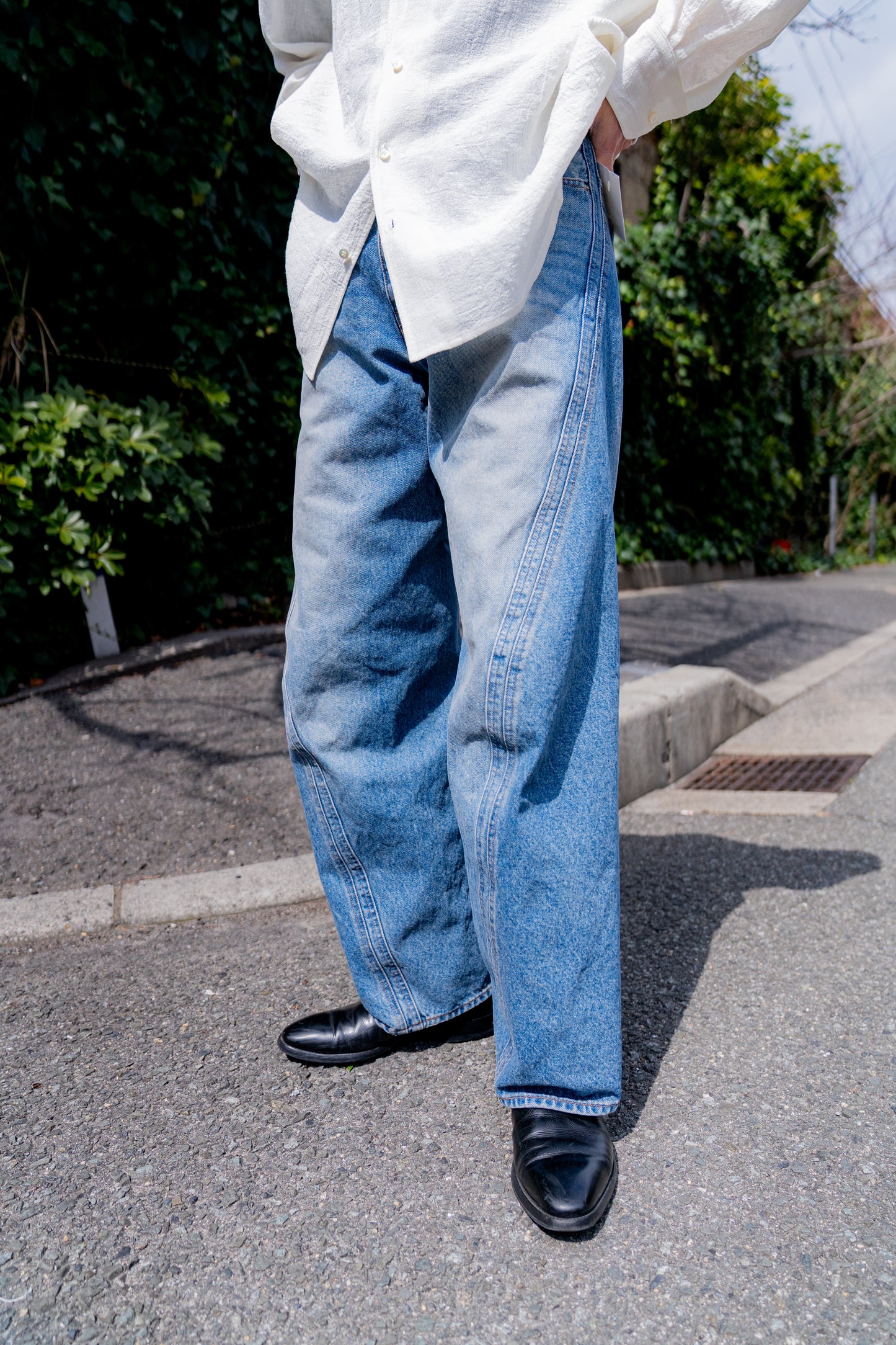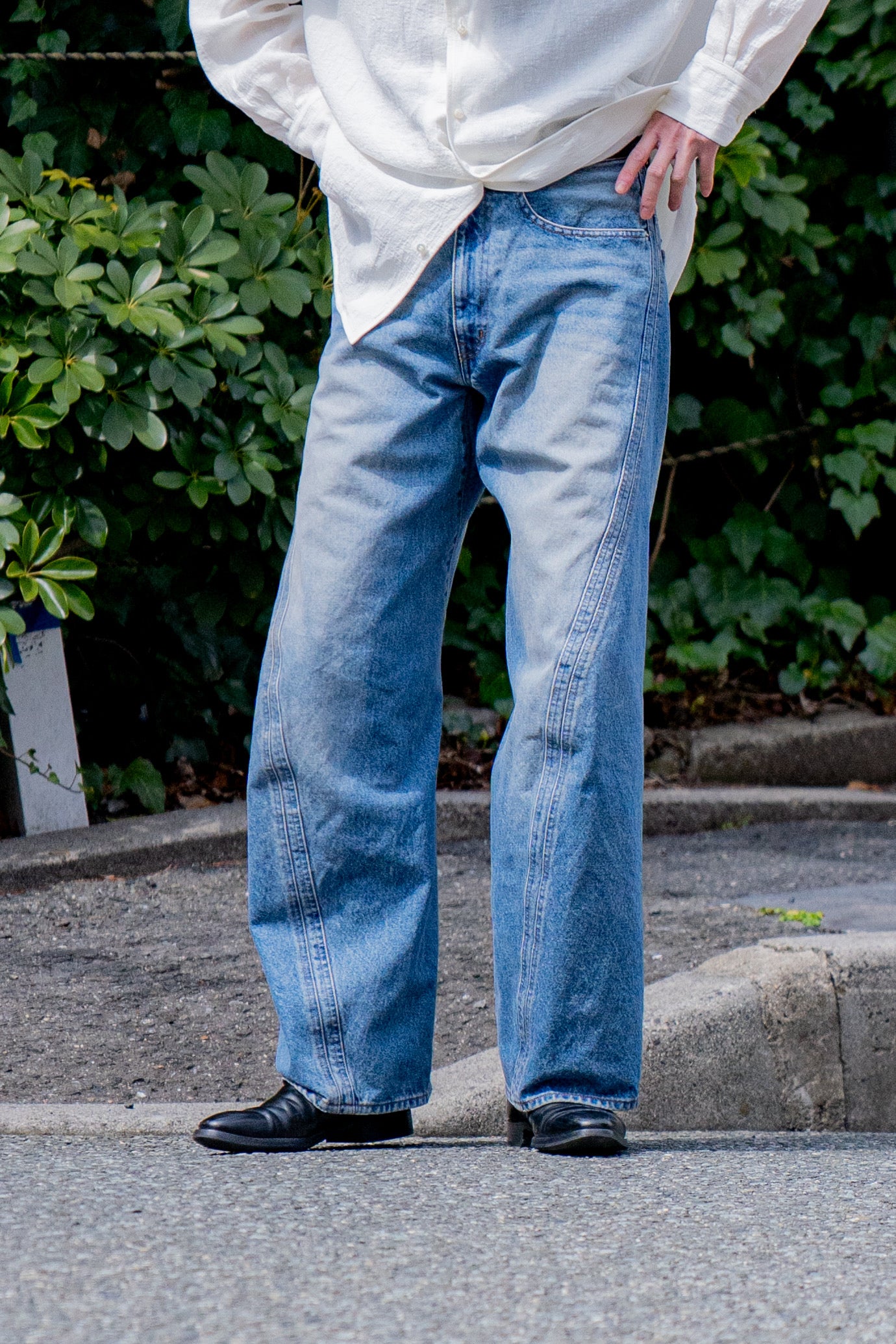 14ozのムラ糸空紡糸によるインディゴデニムを使用したワイドシルエット立体裁断ジーンズ。ヴィンテージウォッシュ加工。00's初期に見られた立体裁断ジーンズから着想し現代的なシルエットにアップデート。
