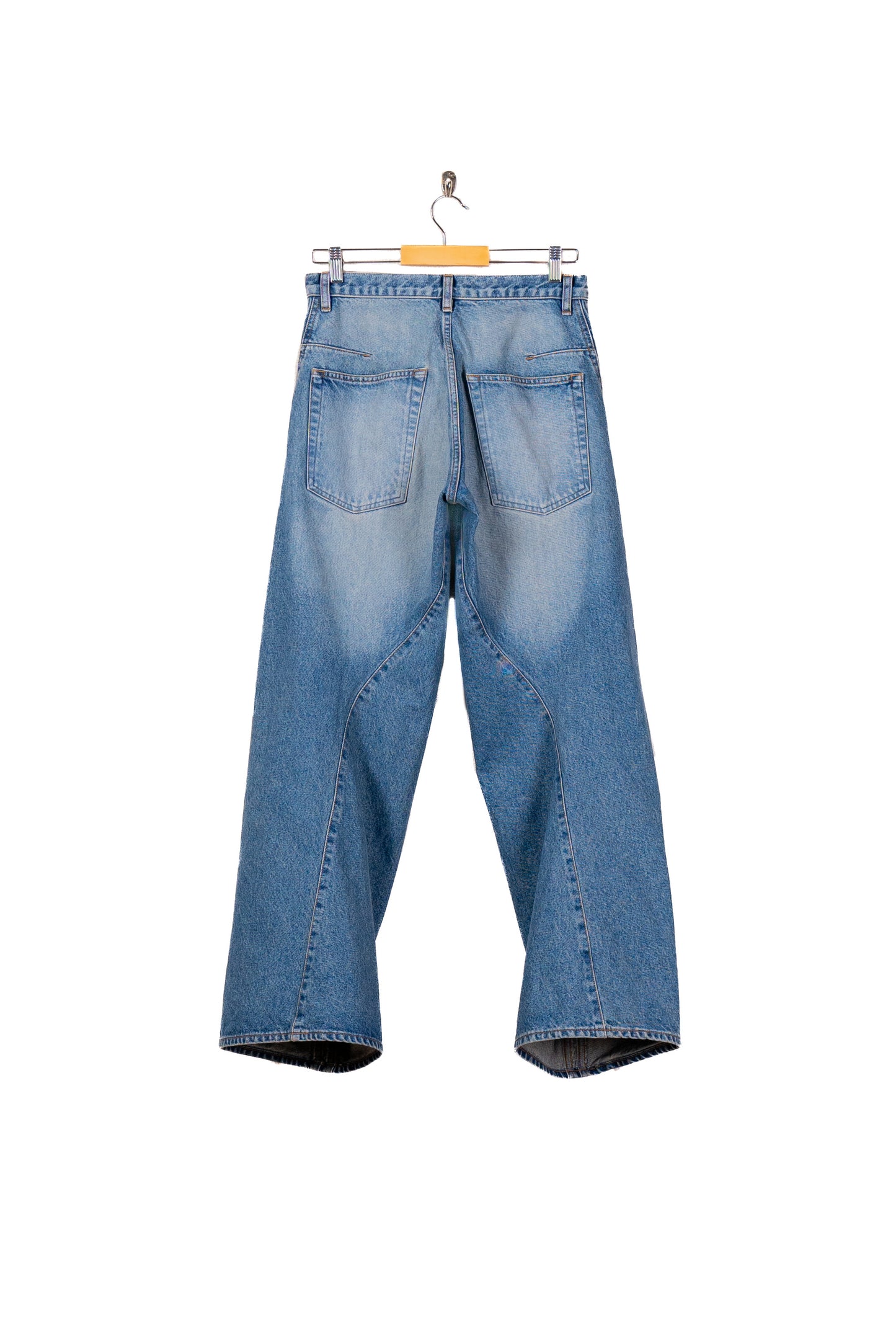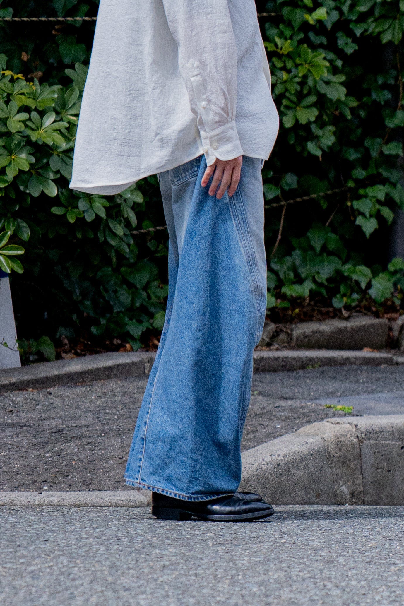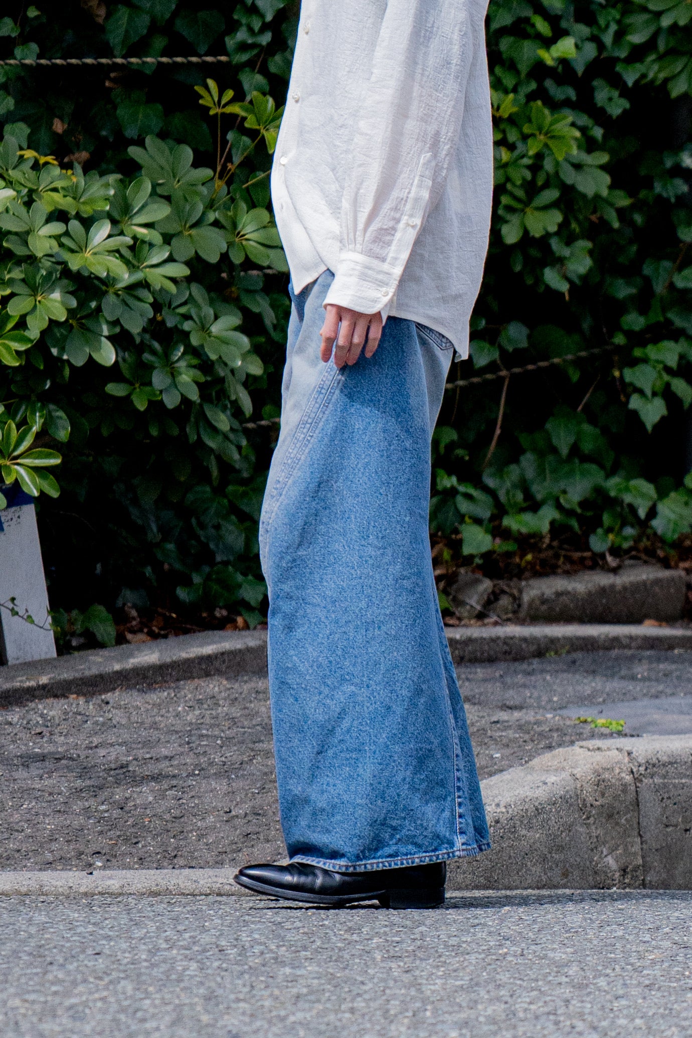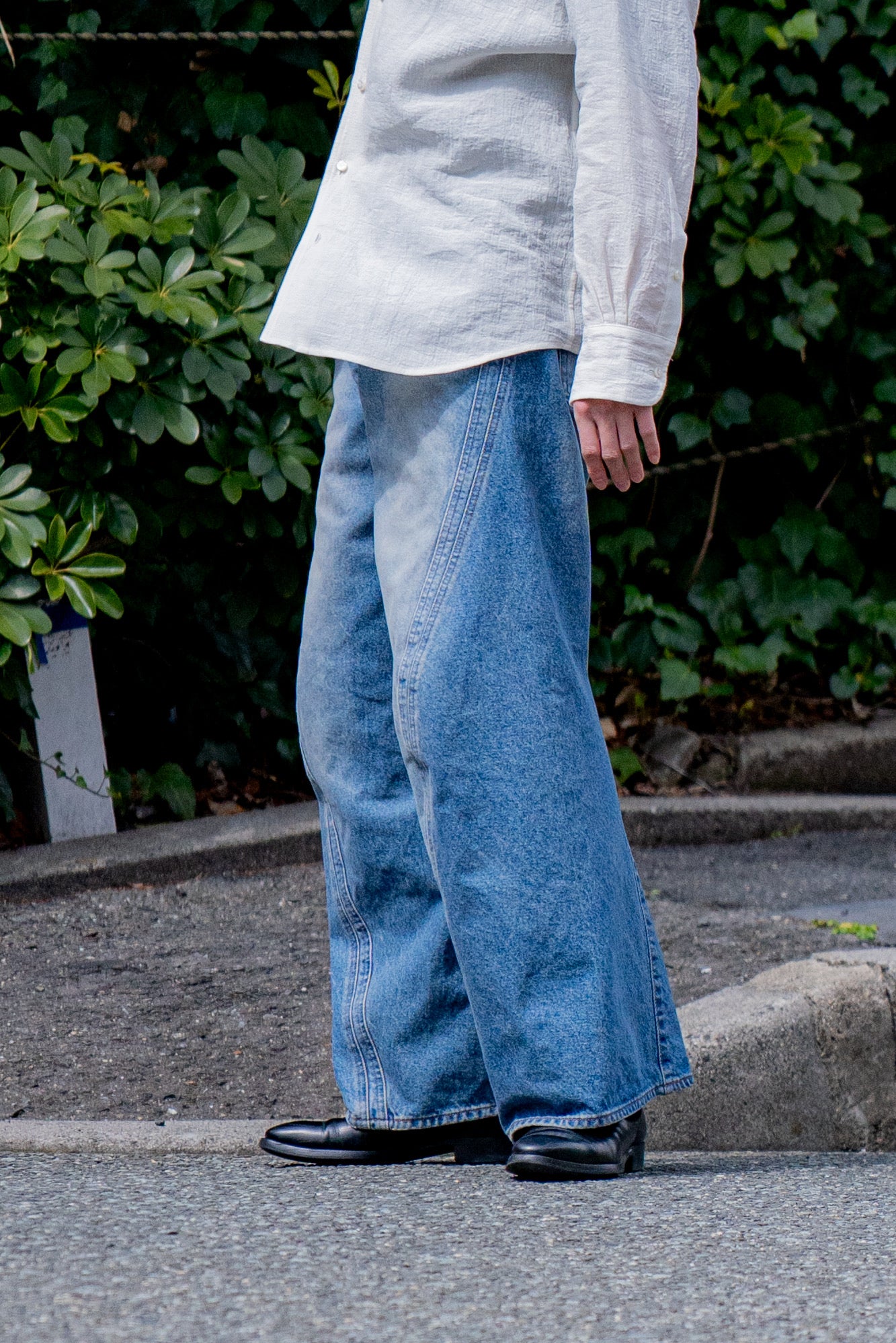 14ozのムラ糸空紡糸によるインディゴデニムを使用したワイドシルエット立体裁断ジーンズ。ヴィンテージウォッシュ加工。00's初期に見られた立体裁断ジーンズから着想し現代的なシルエットにアップデート。