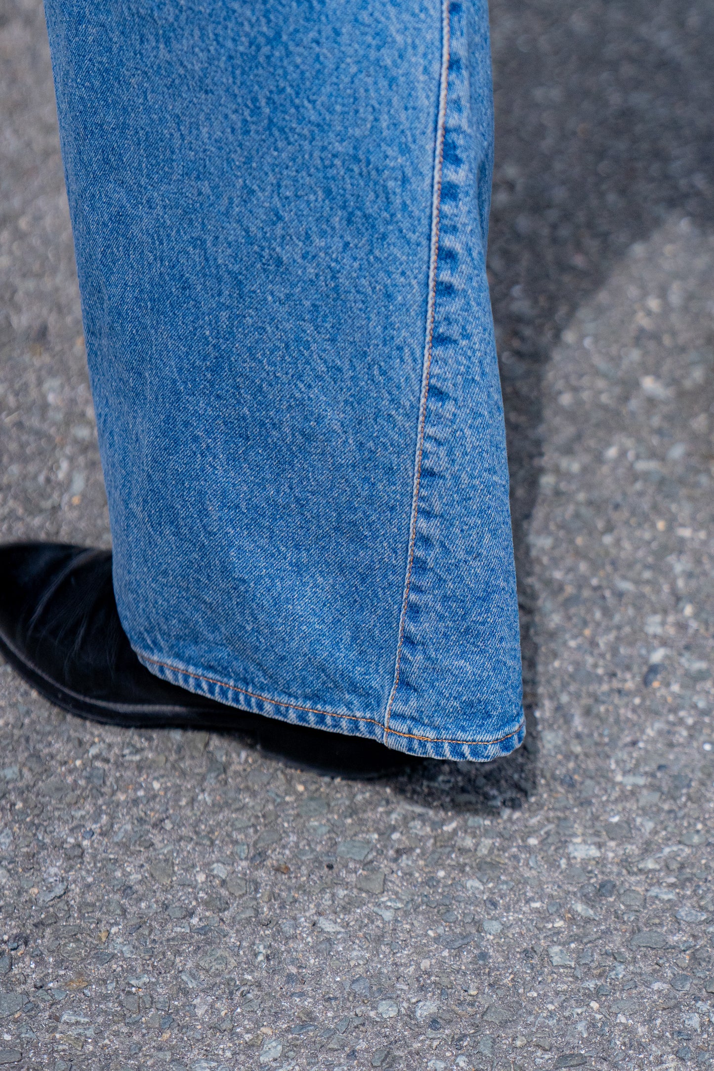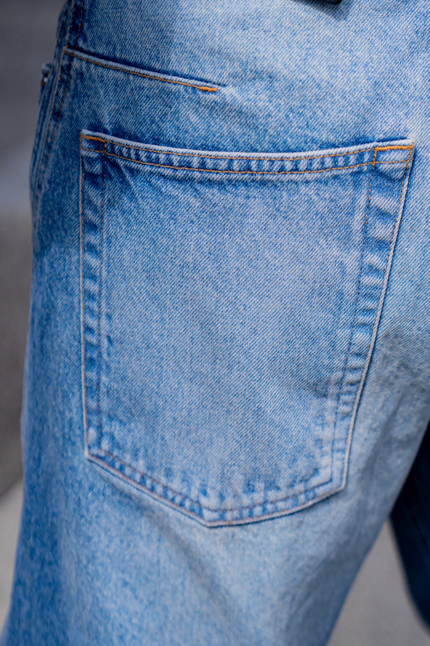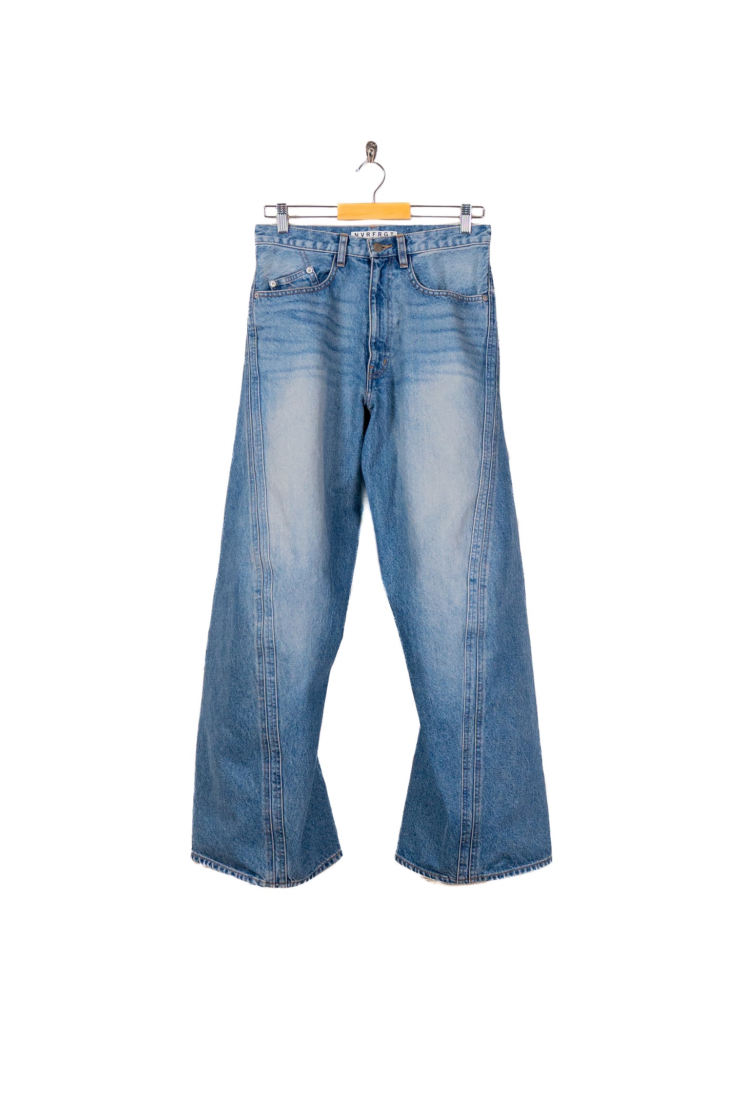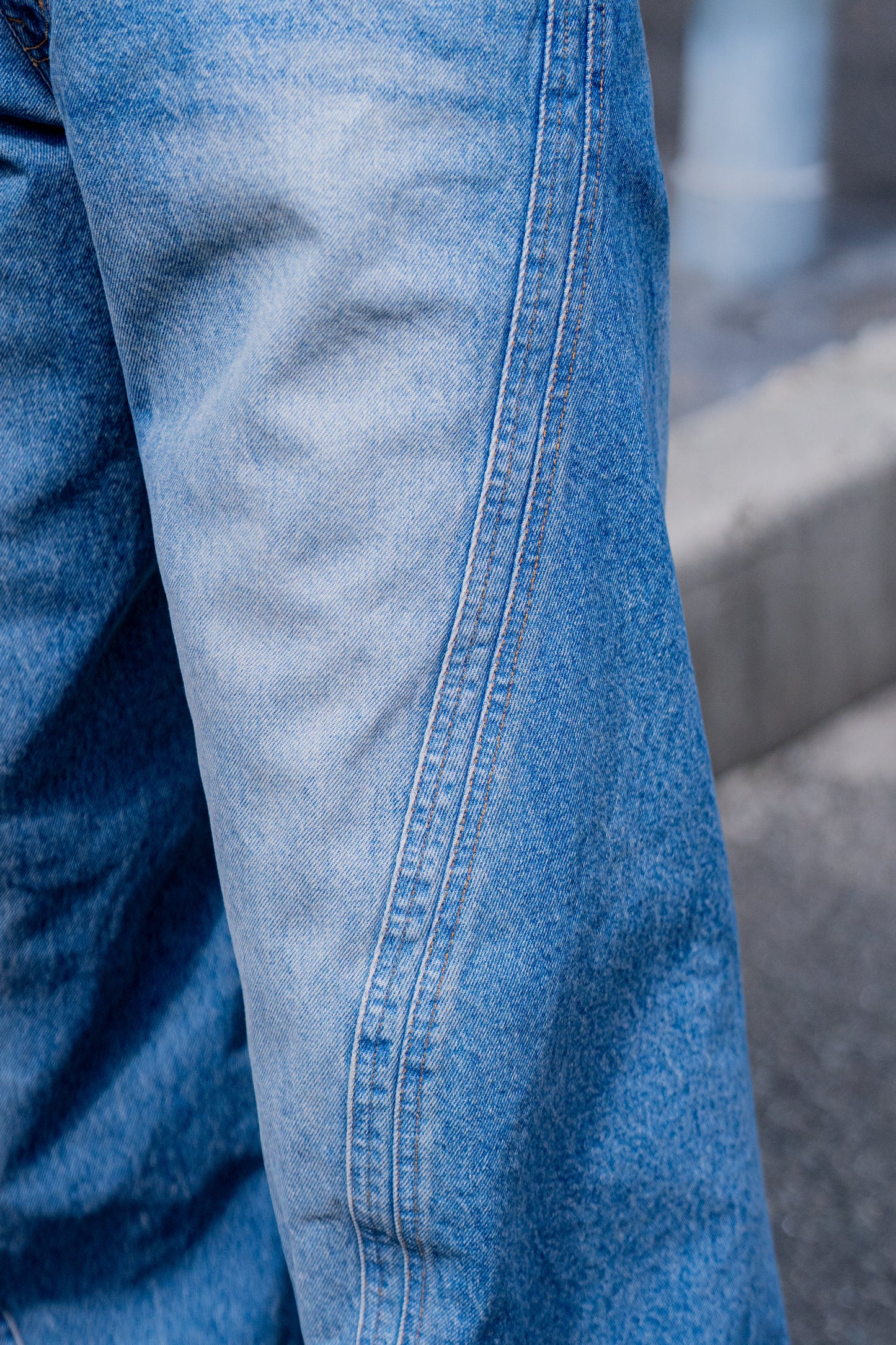 14ozのムラ糸空紡糸によるインディゴデニムを使用したワイドシルエット立体裁断ジーンズ。ヴィンテージウォッシュ加工。00's初期に見られた立体裁断ジーンズから着想し現代的なシルエットにアップデート。