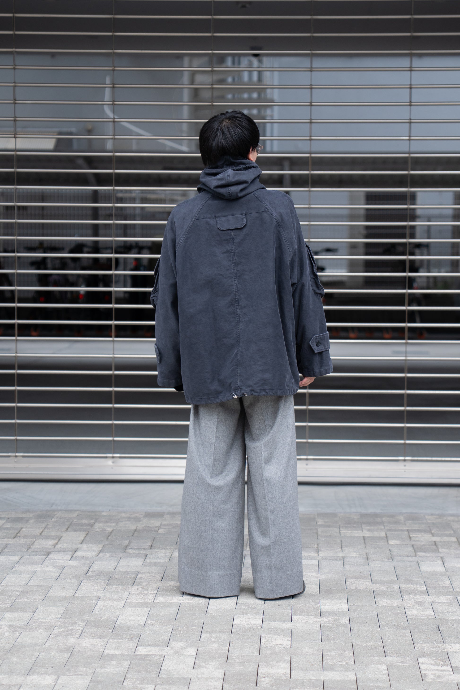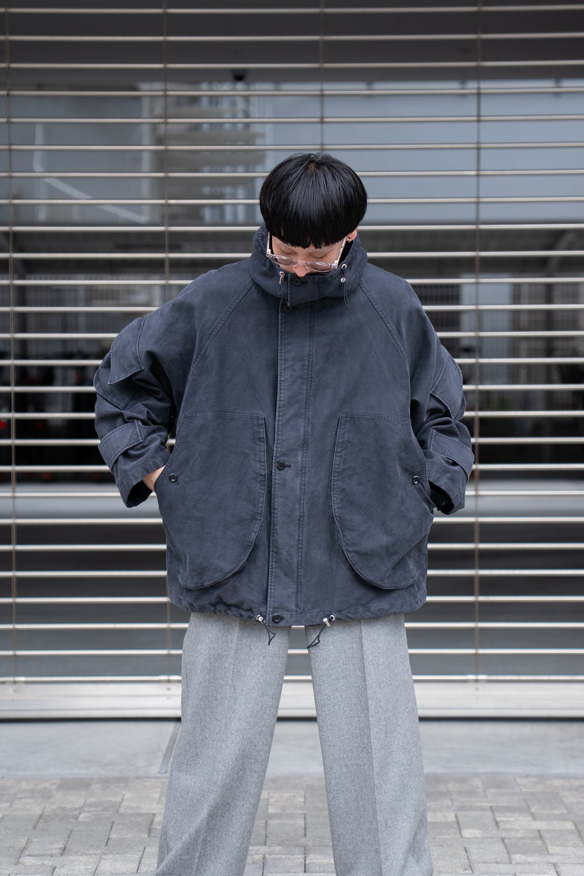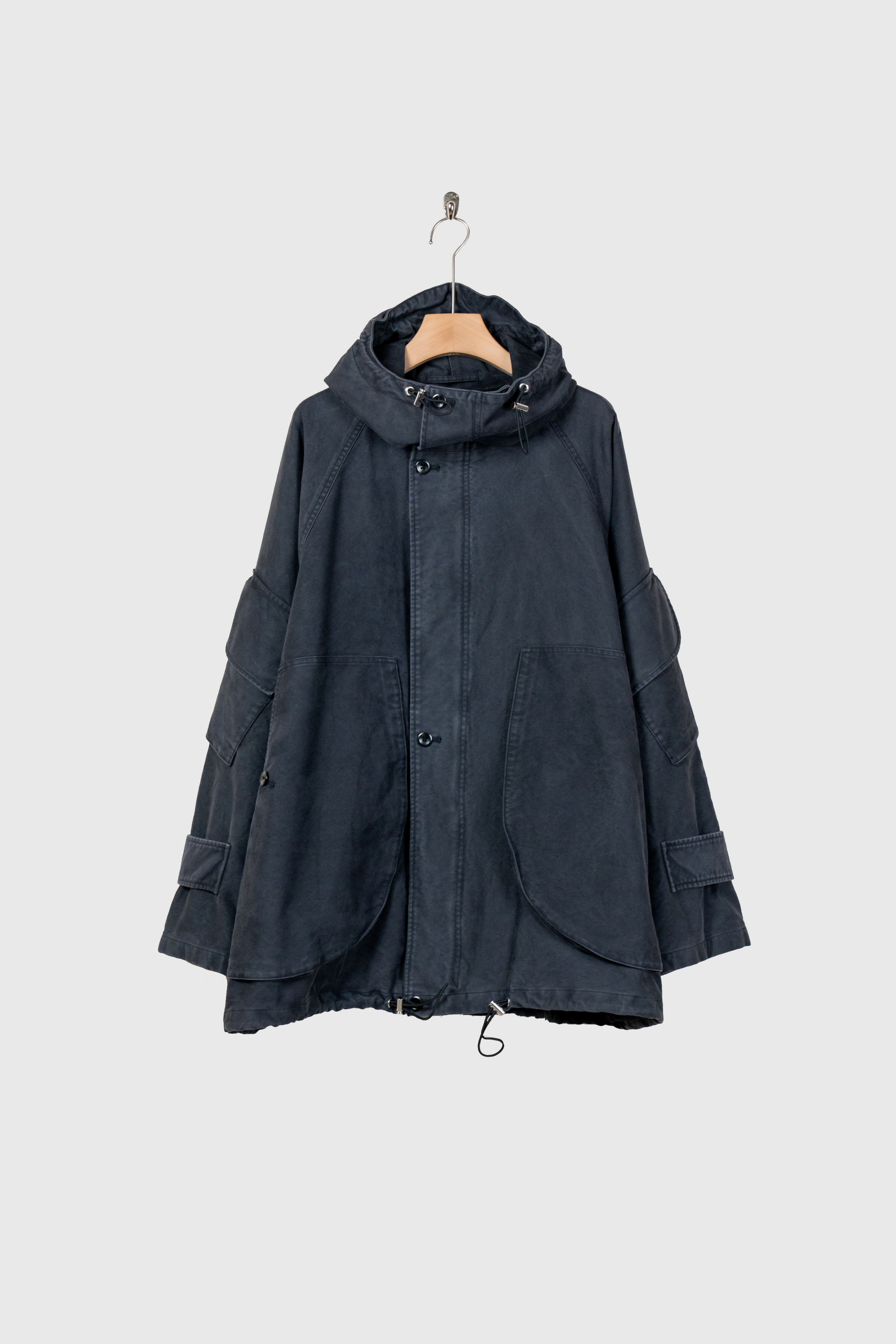 高密度に織り上げた日本製オーガニックコットン・モールスキンを硫化染めし、大きなフーデッドジャケットに仕立てたアイテム。