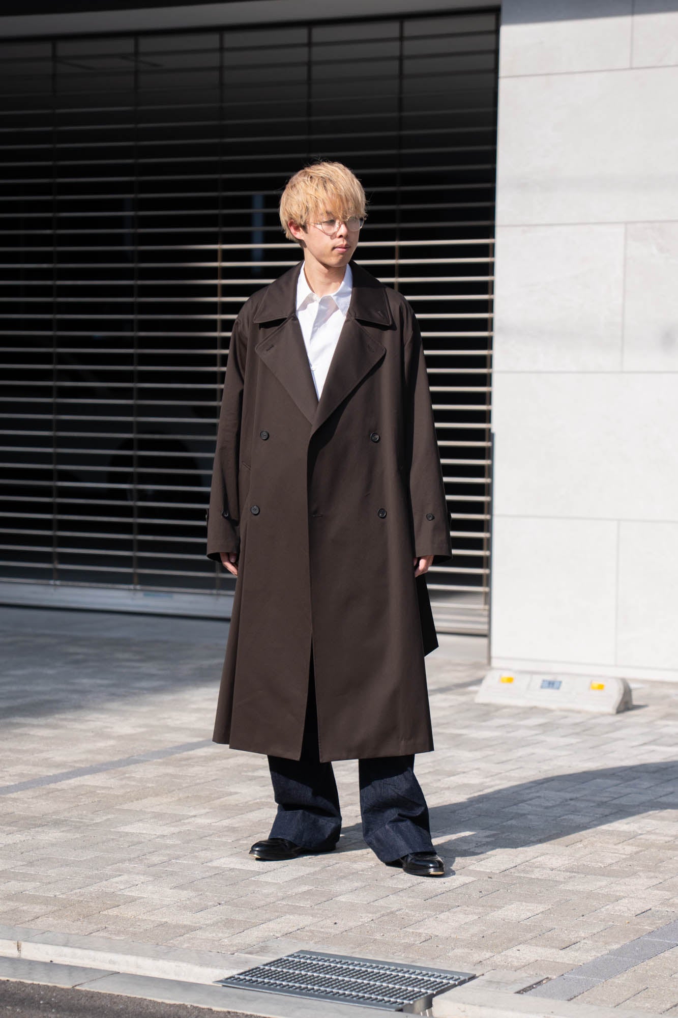 REGGIANI社AZETA極細番手の80/2コーマ糸をタテヨコに使用し、タテ84本・ヨコ36本/cmという非常に高密度で織り上げた100%コットンのダブルサテンを使用したダブルブレステッドコート。