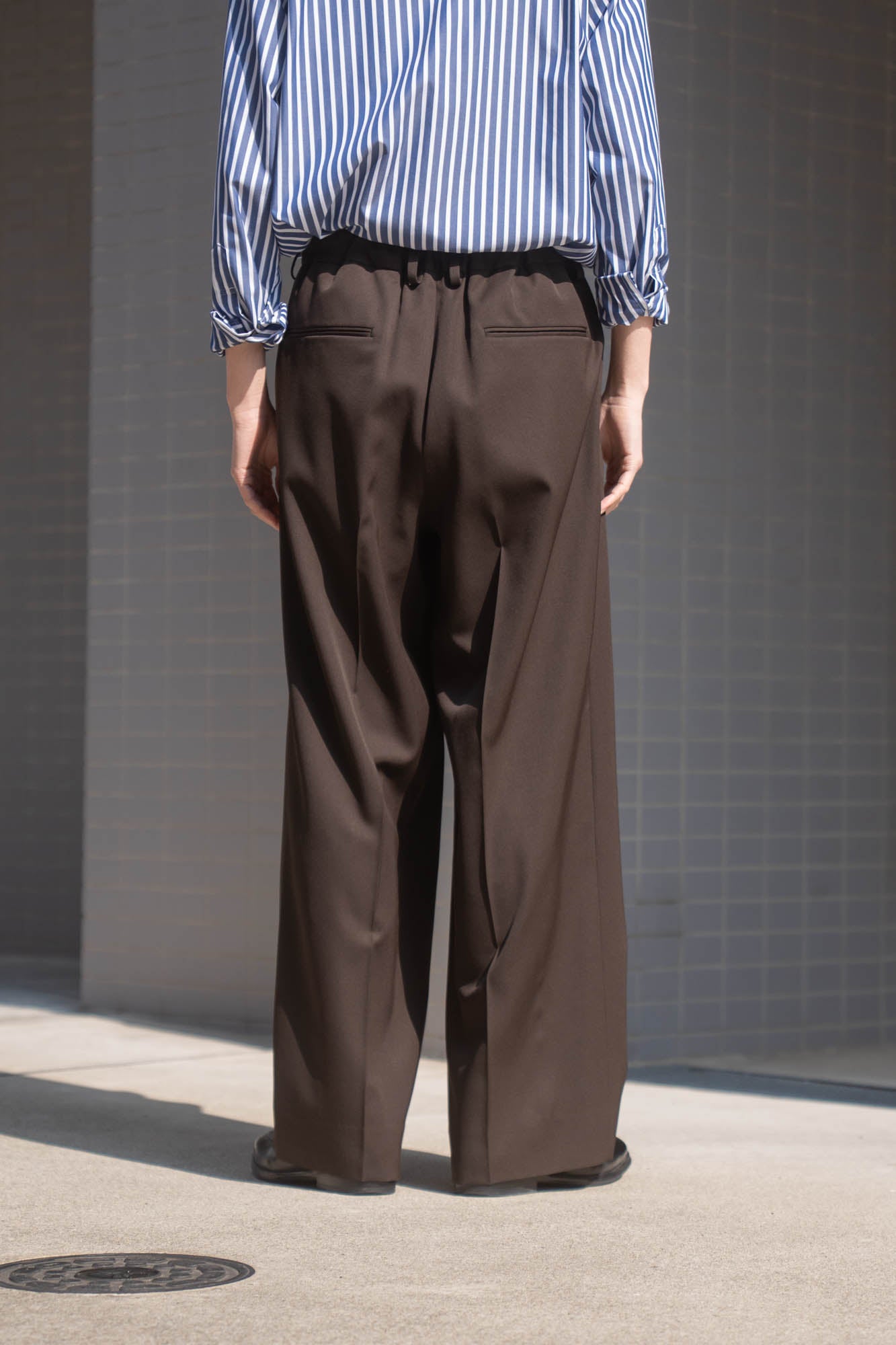 わたり幅から裾幅までワイドに設定したツータックイージートラウザーズ。