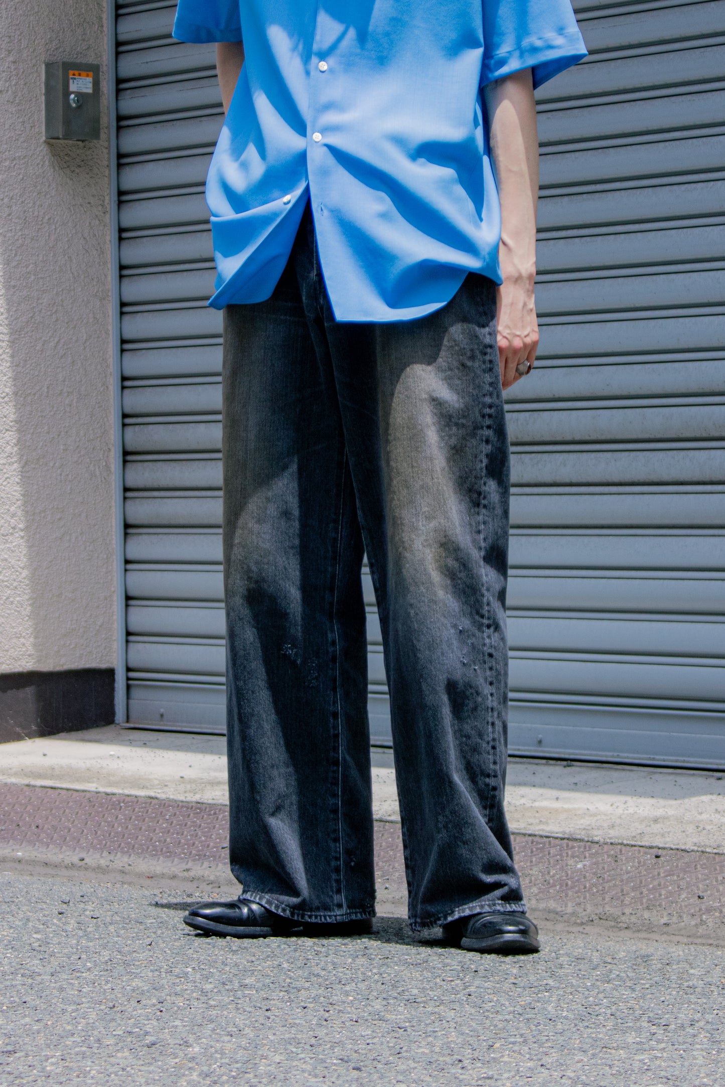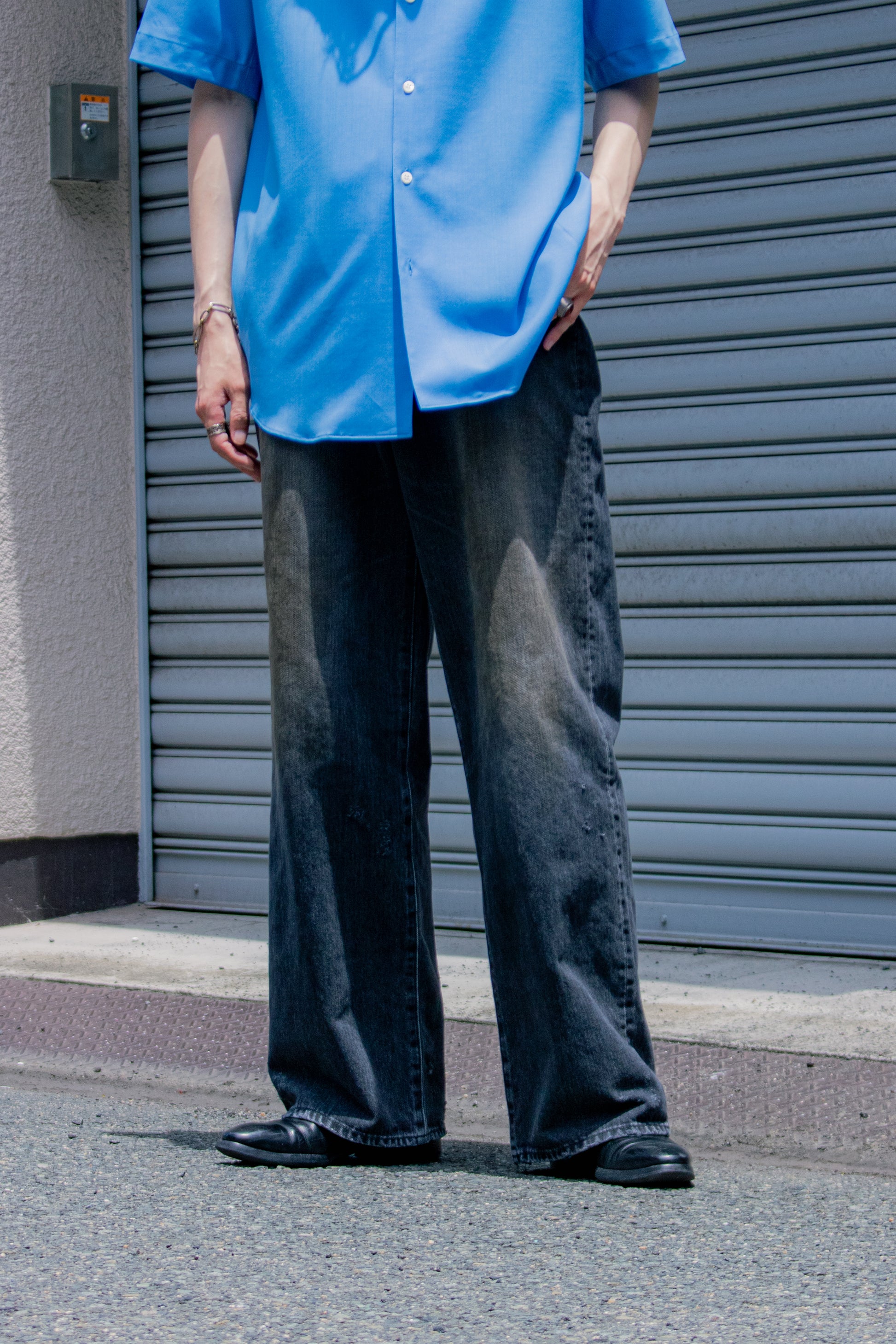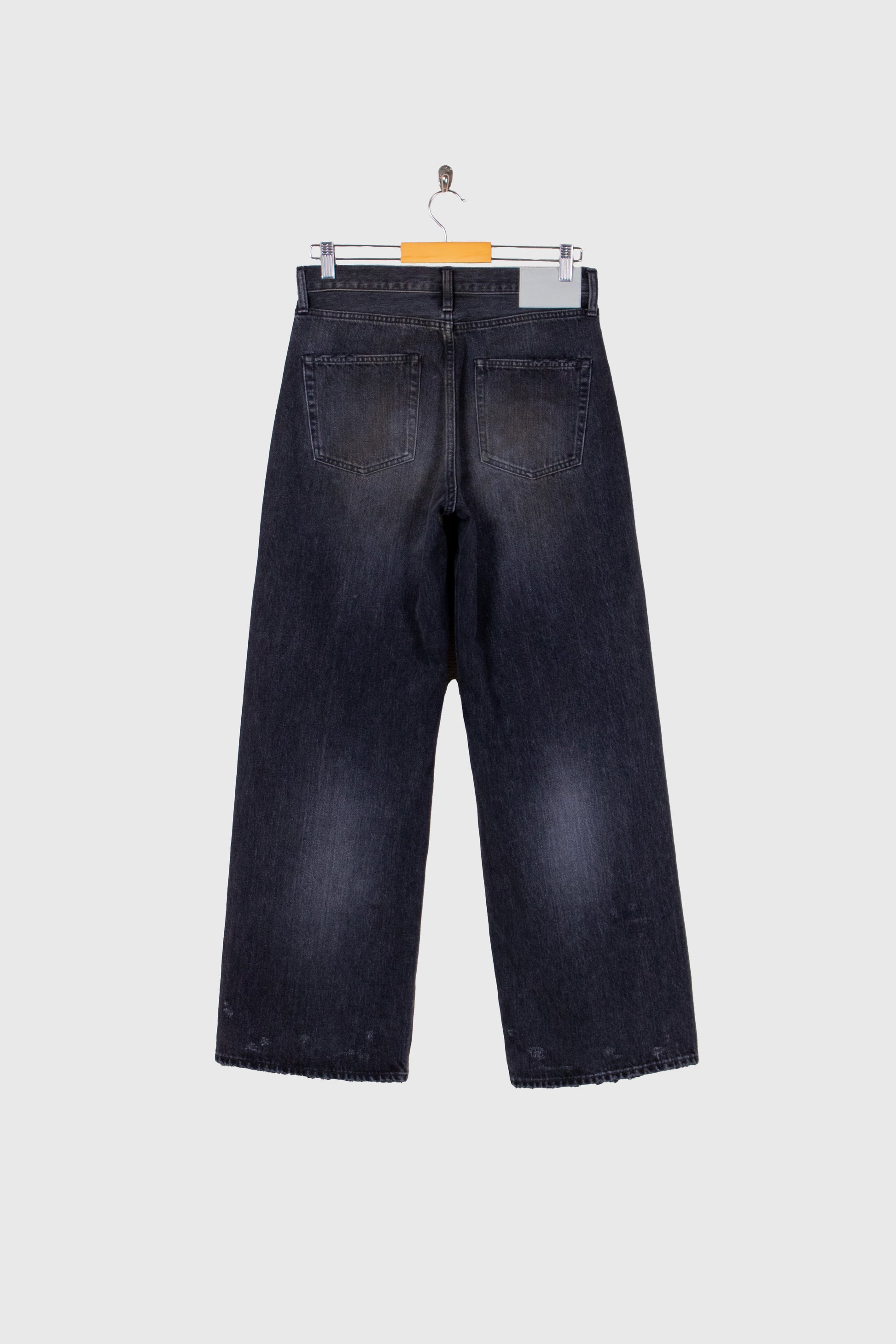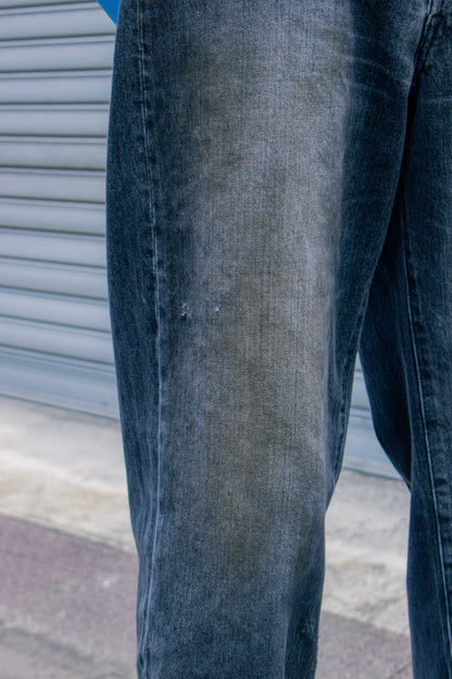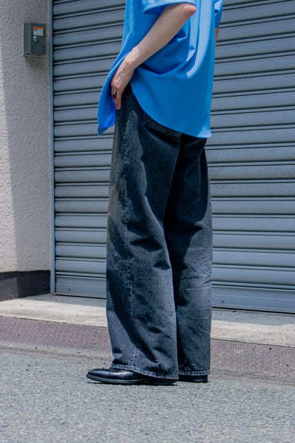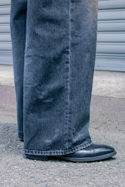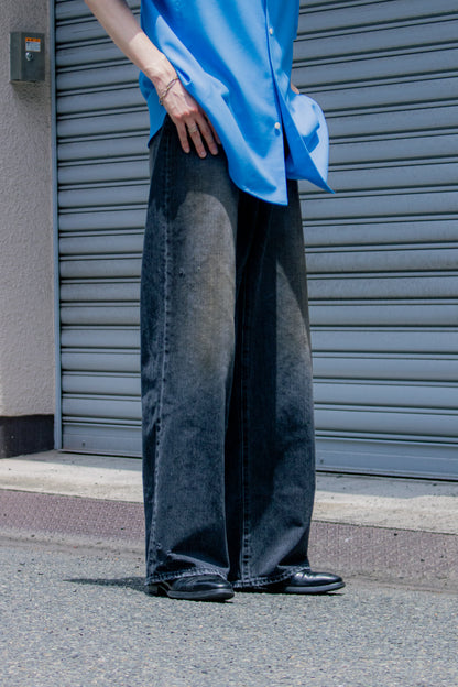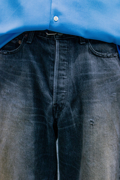 独特の加工感が特徴のストレートデニム。 ストーンウォッシュ、ブリーチ、オーバーダイ、吹付け、手作業によるダメージ感等様々な加工過程を施し奥行きのあるデニムの表情。