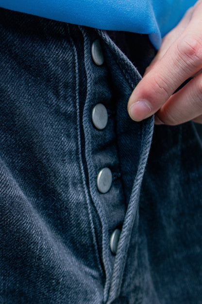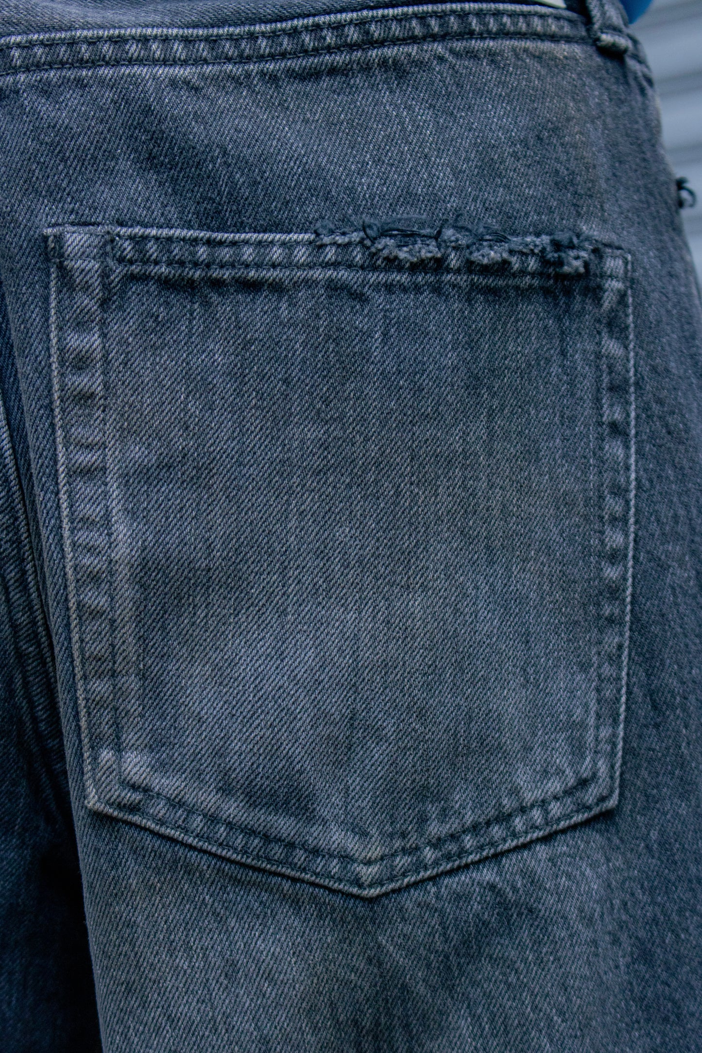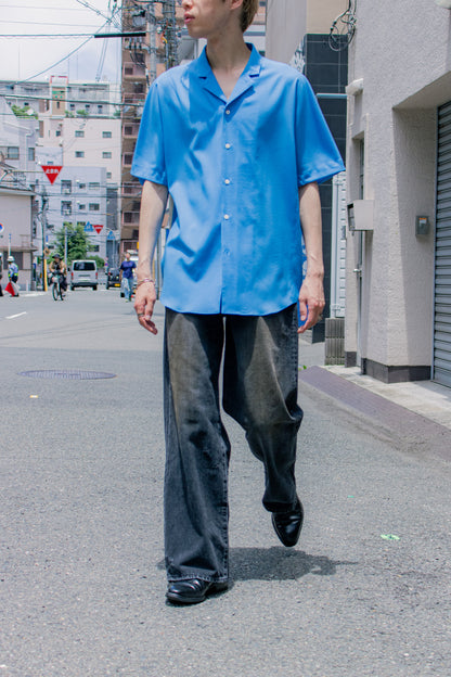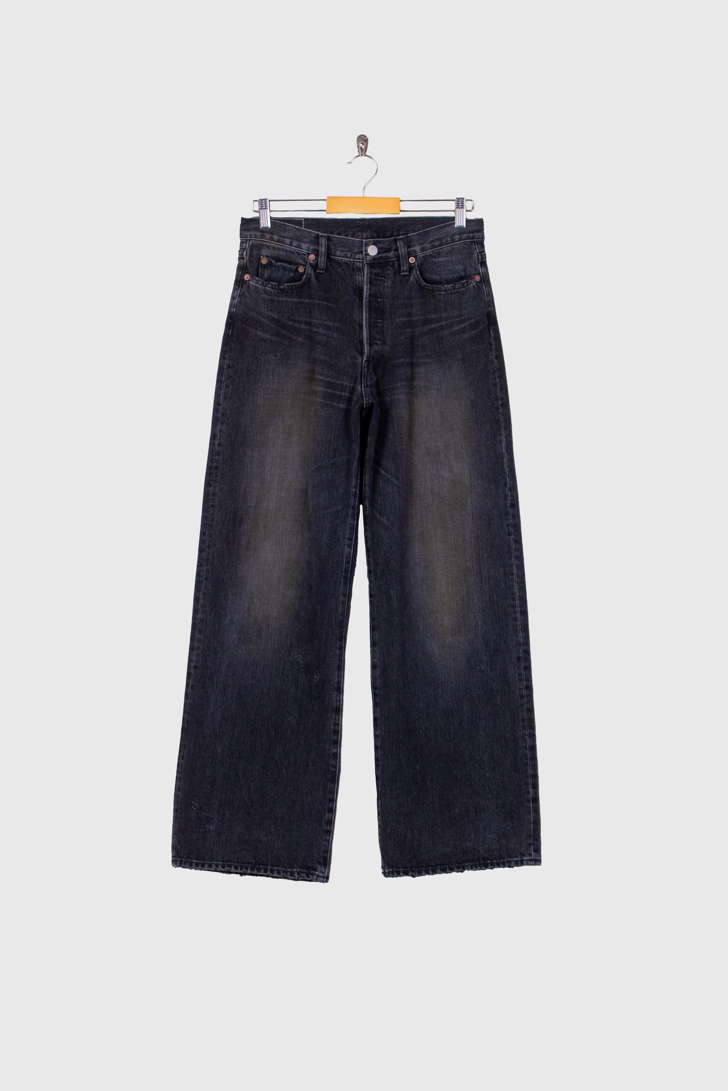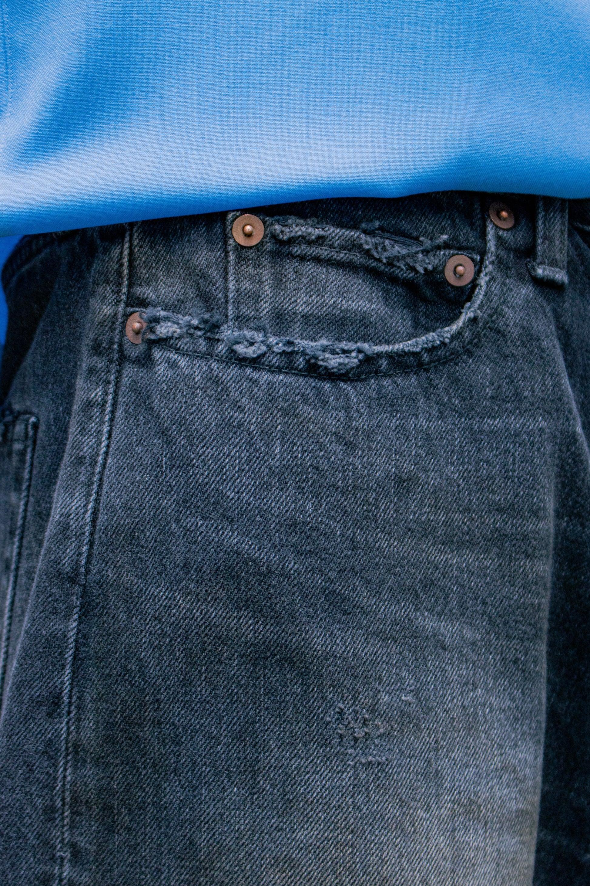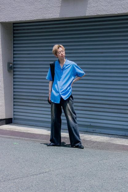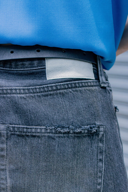 独特の加工感が特徴のストレートデニム。 ストーンウォッシュ、ブリーチ、オーバーダイ、吹付け、手作業によるダメージ感等様々な加工過程を施し奥行きのあるデニムの表情。