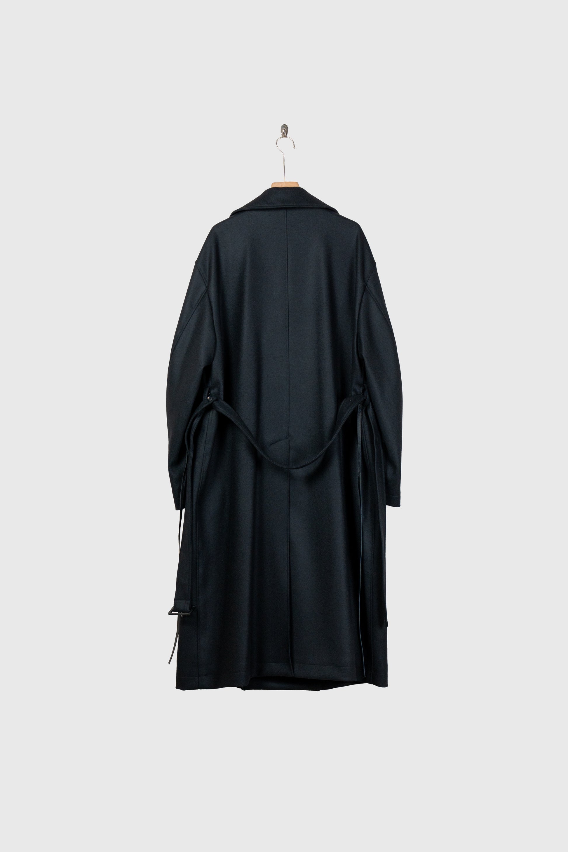 super 120’s原料の上質な2/90梳毛から成るしなやかさと、仕上げでしっかりと毛羽感を抑えたことによる上質な光沢感のある表情が特徴の二重織メルトンを使用したダブルブレステッドコート。