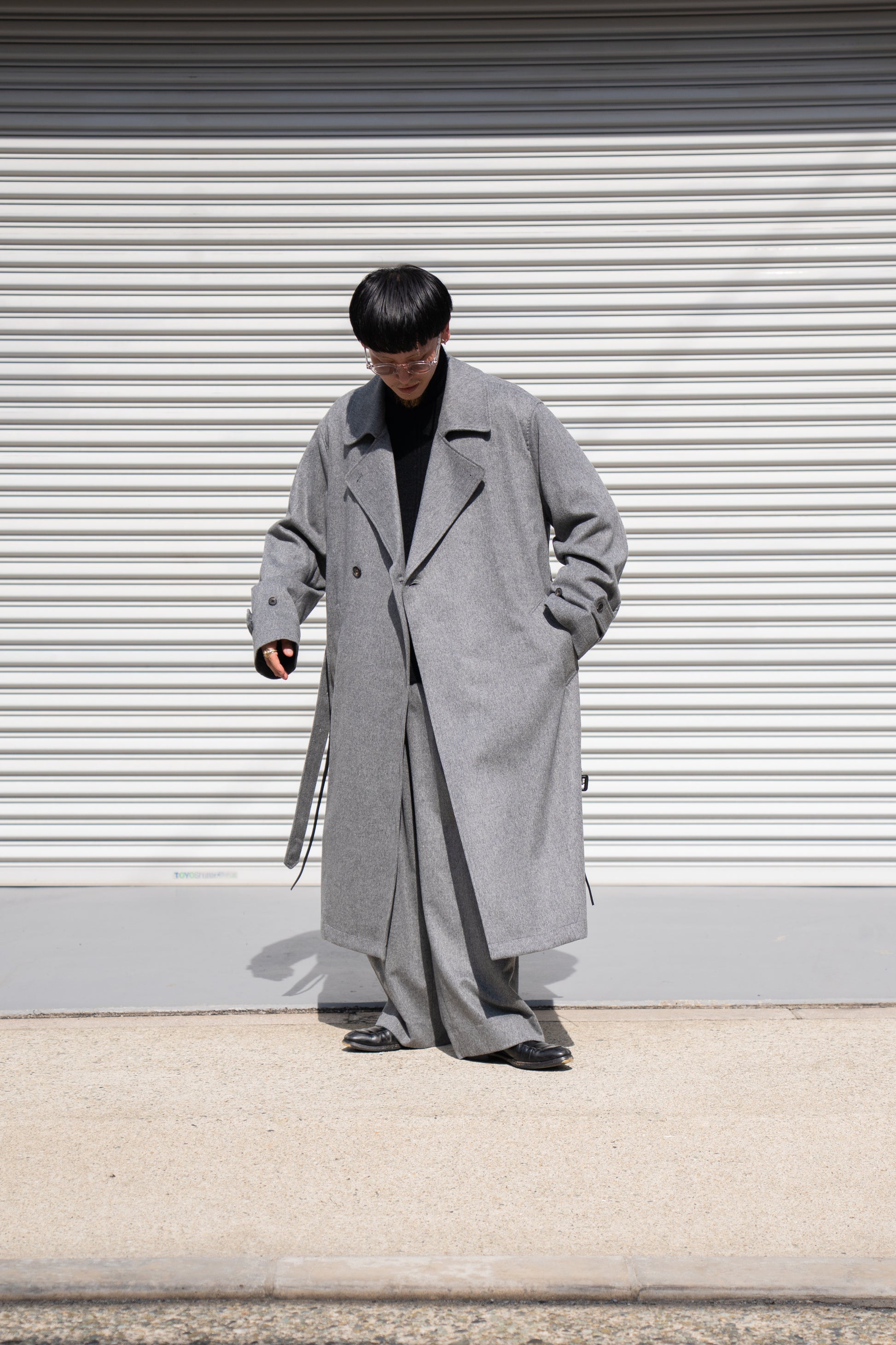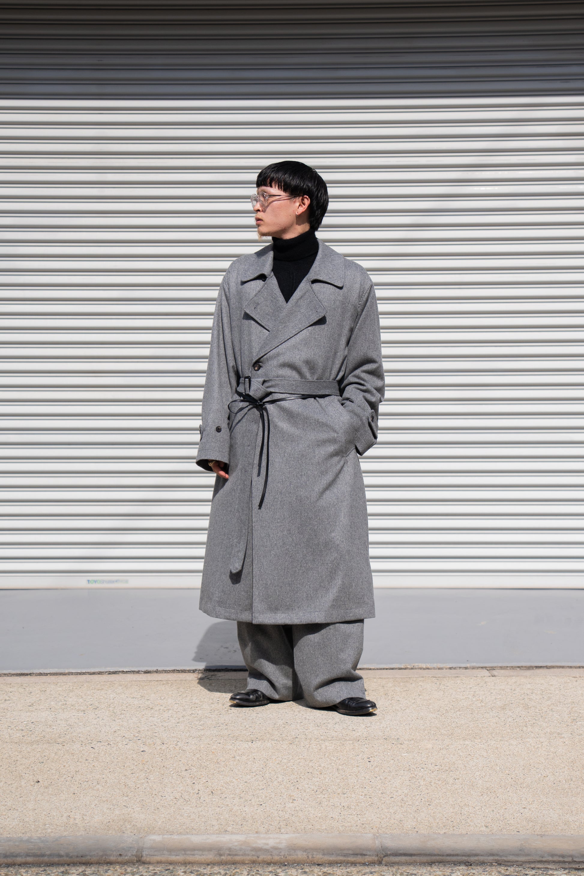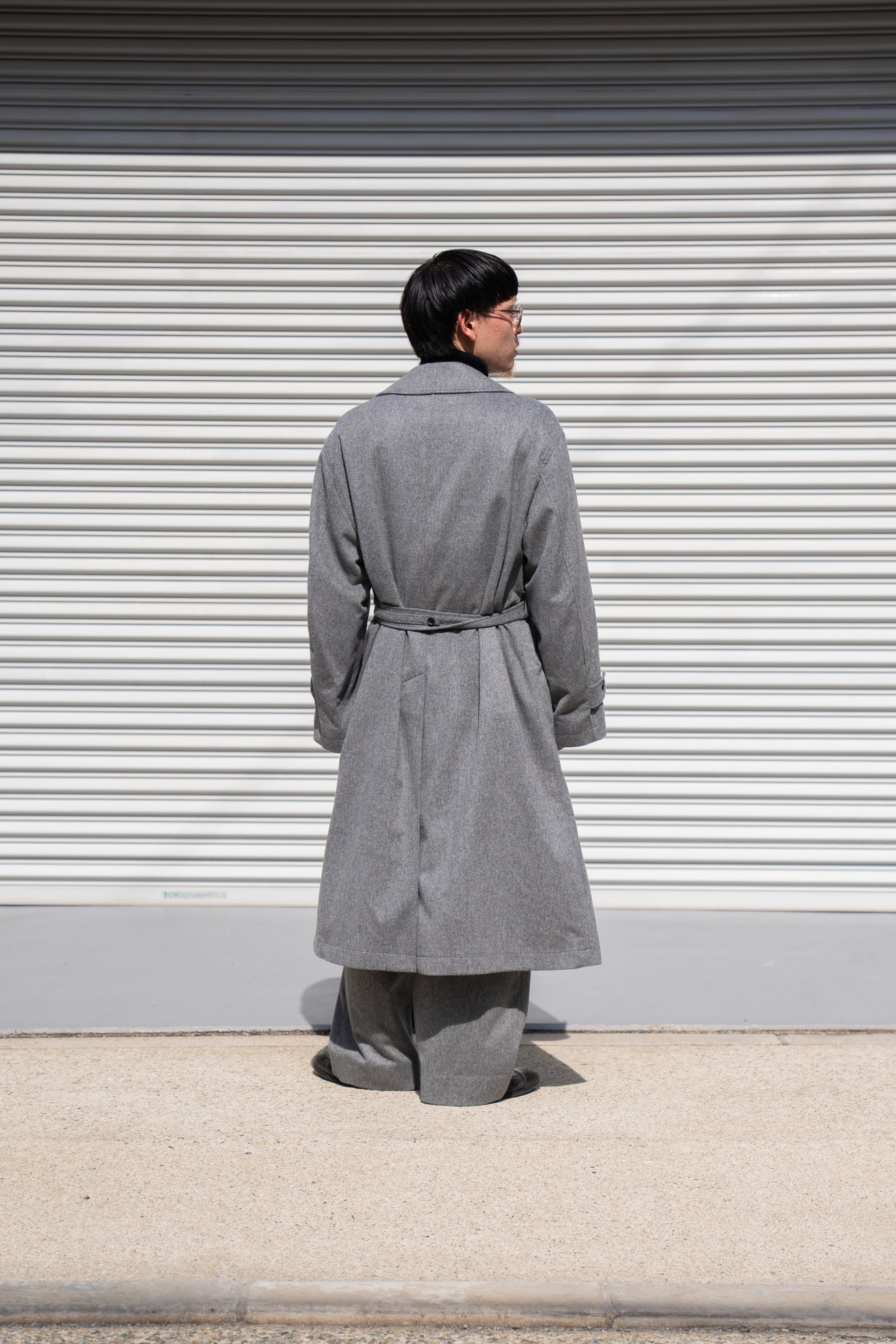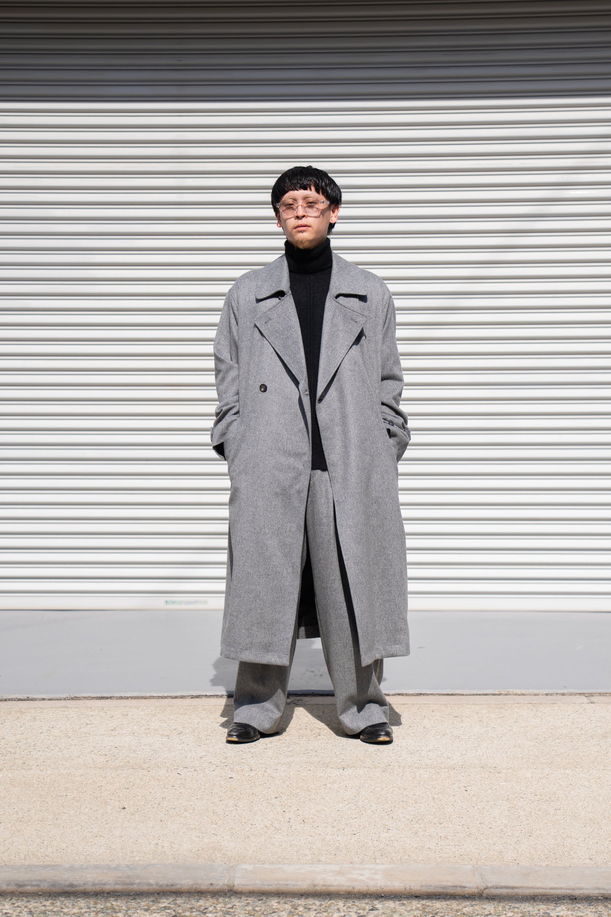 17.5μのジーロンラム原料に、内蒙古産のカシミヤをブレンドした混紡糸を極限まで薄く織り、シャルムビーバー加工を施した素材を使用したダブルブレステッドコート。