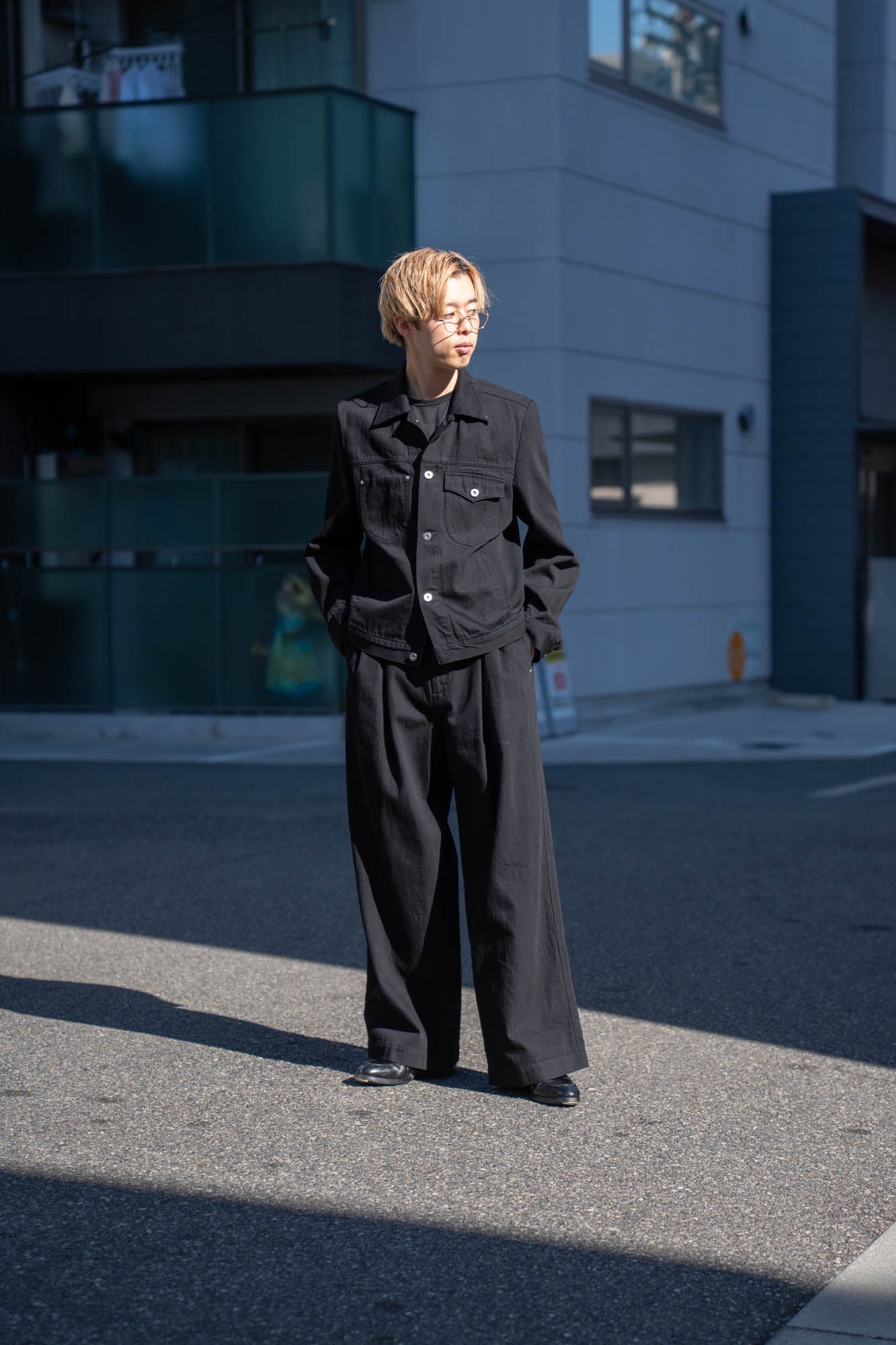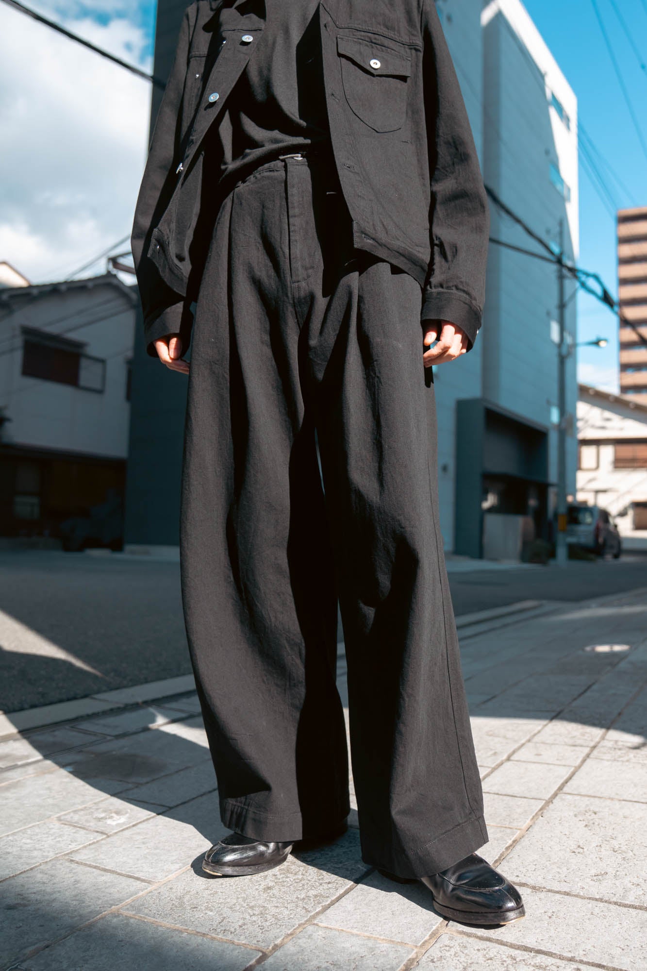 強撚ブラックデニム素材を使用した、一重仕立てツータックバギーパンツ。