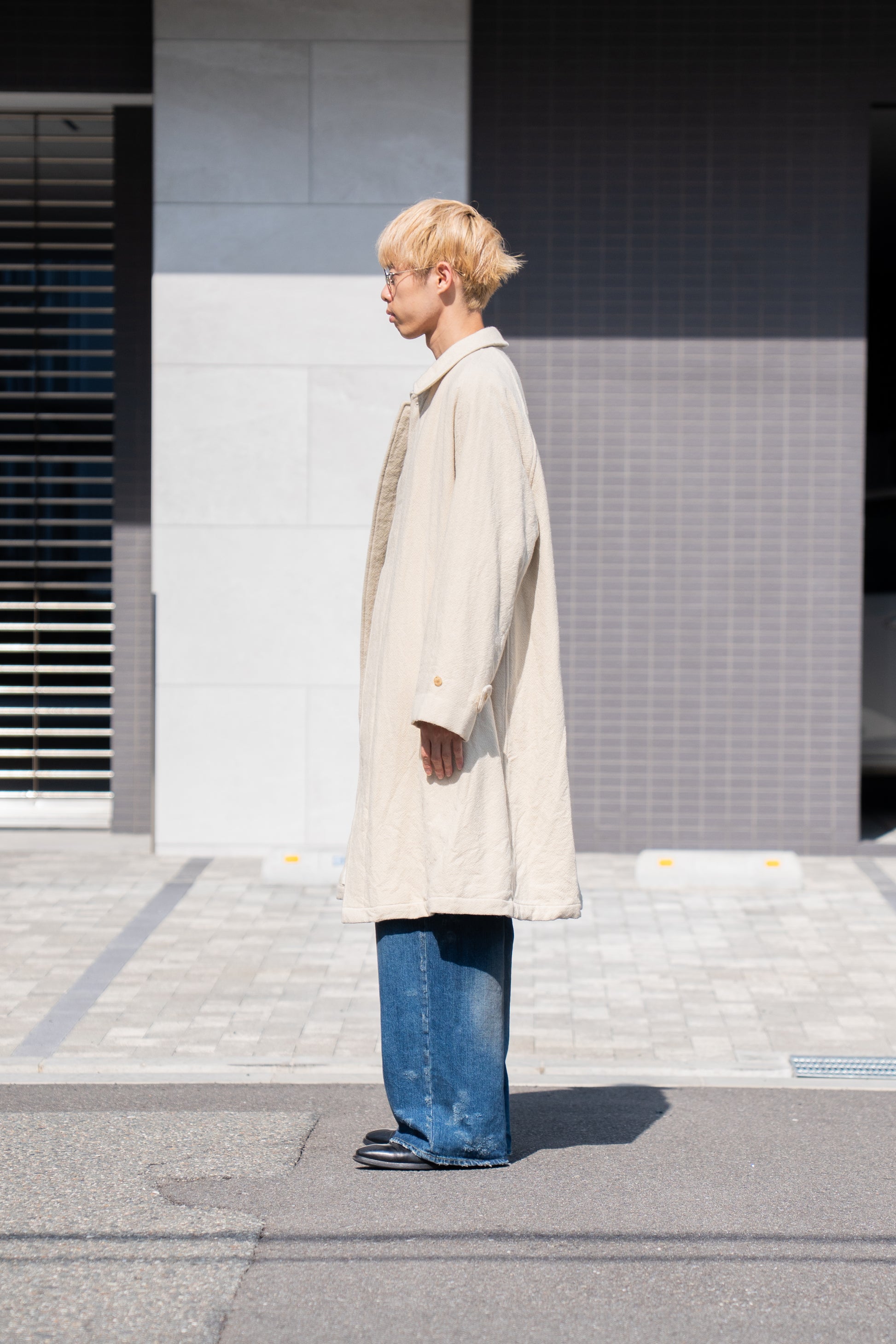 英国羊毛をブレンドした、昔ながらのヘビーウェイトのウール生地を洗い、毛羽立たせ不揃いな表面感、シワ感が特徴です。