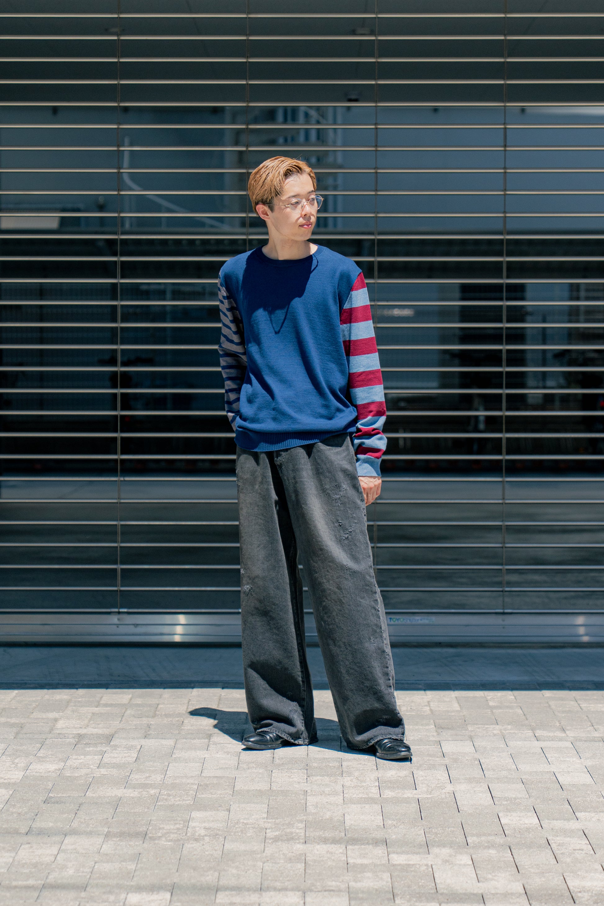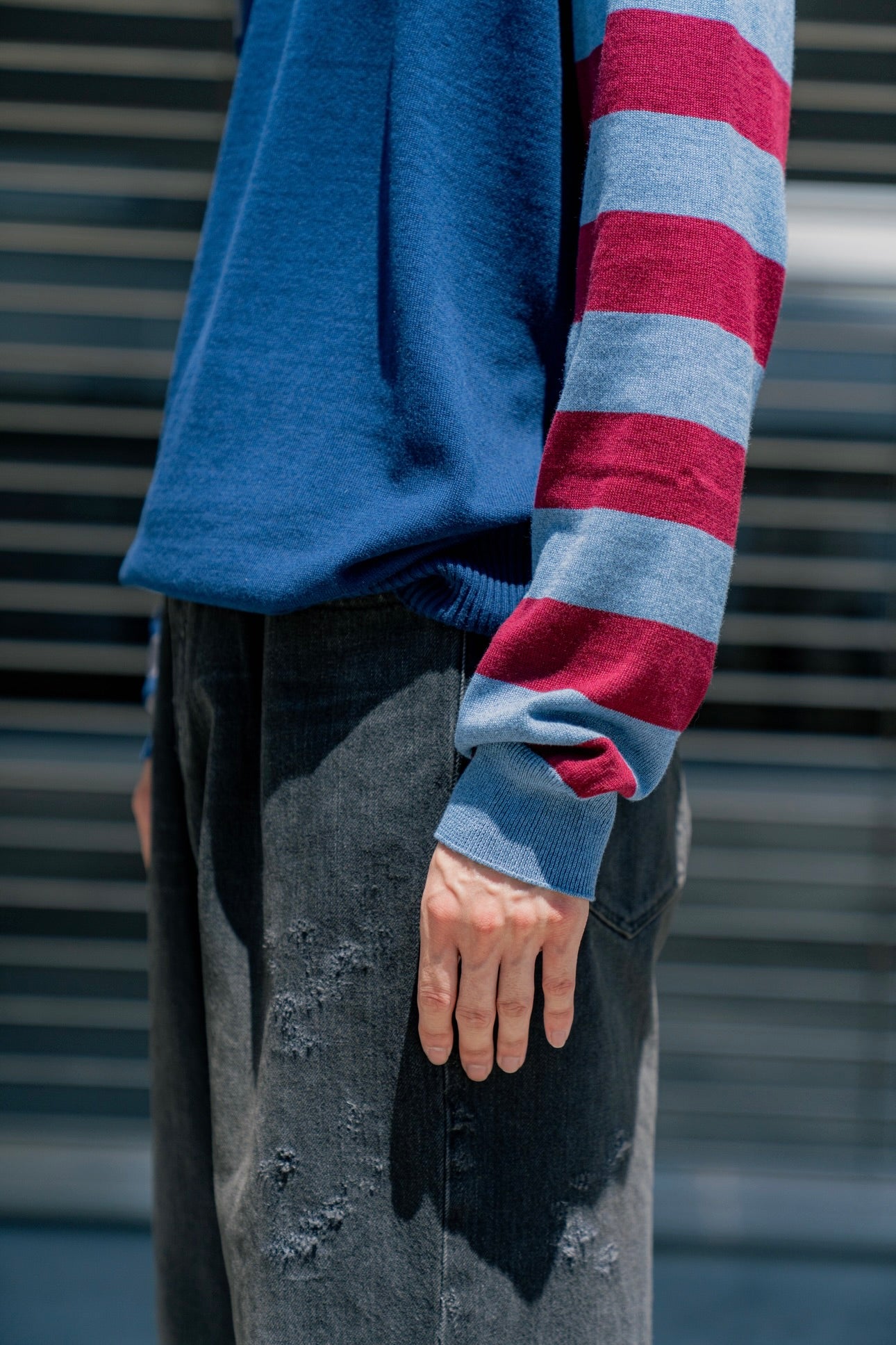 COTTON CASHMERE BORDER SLEEVE SWEATER