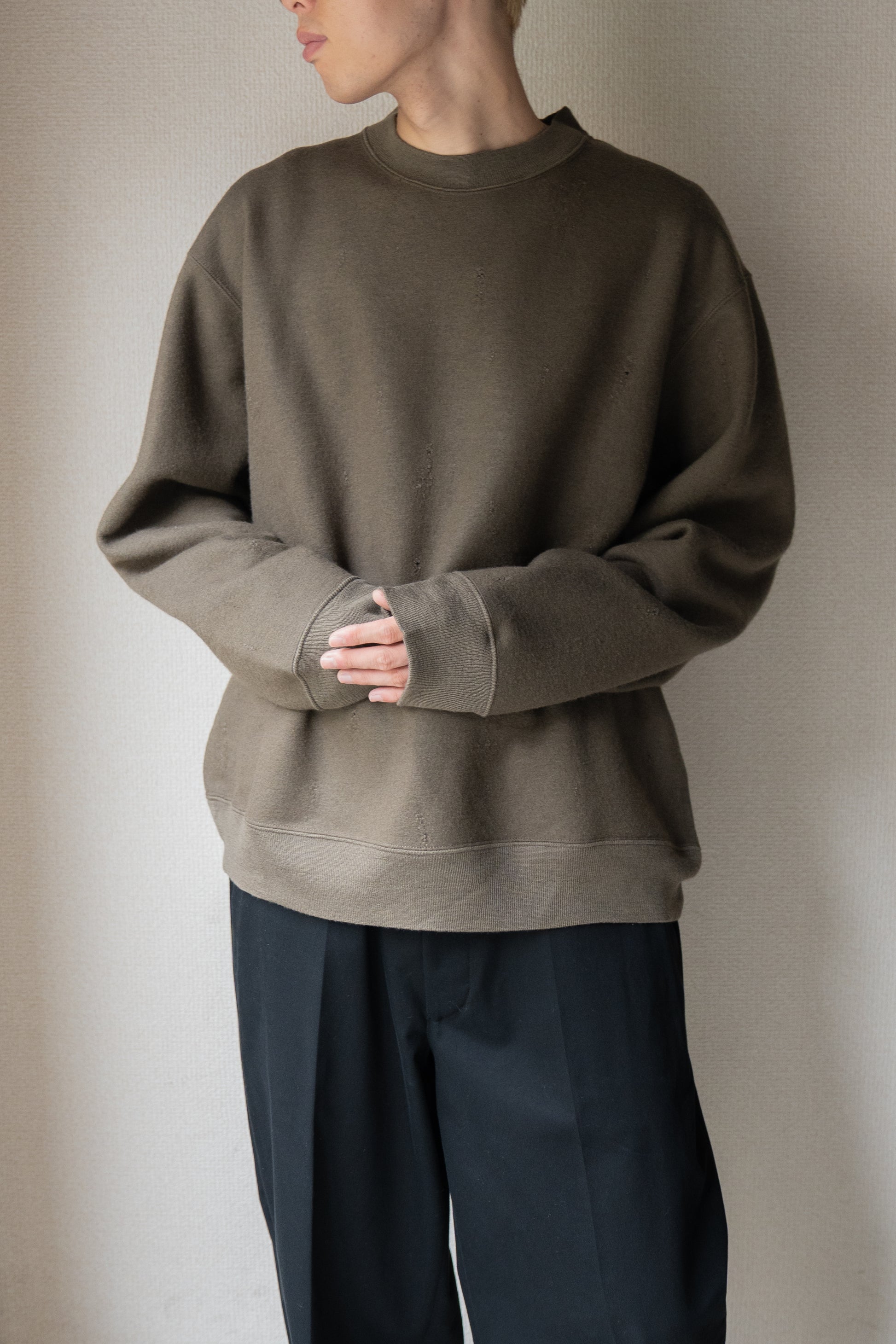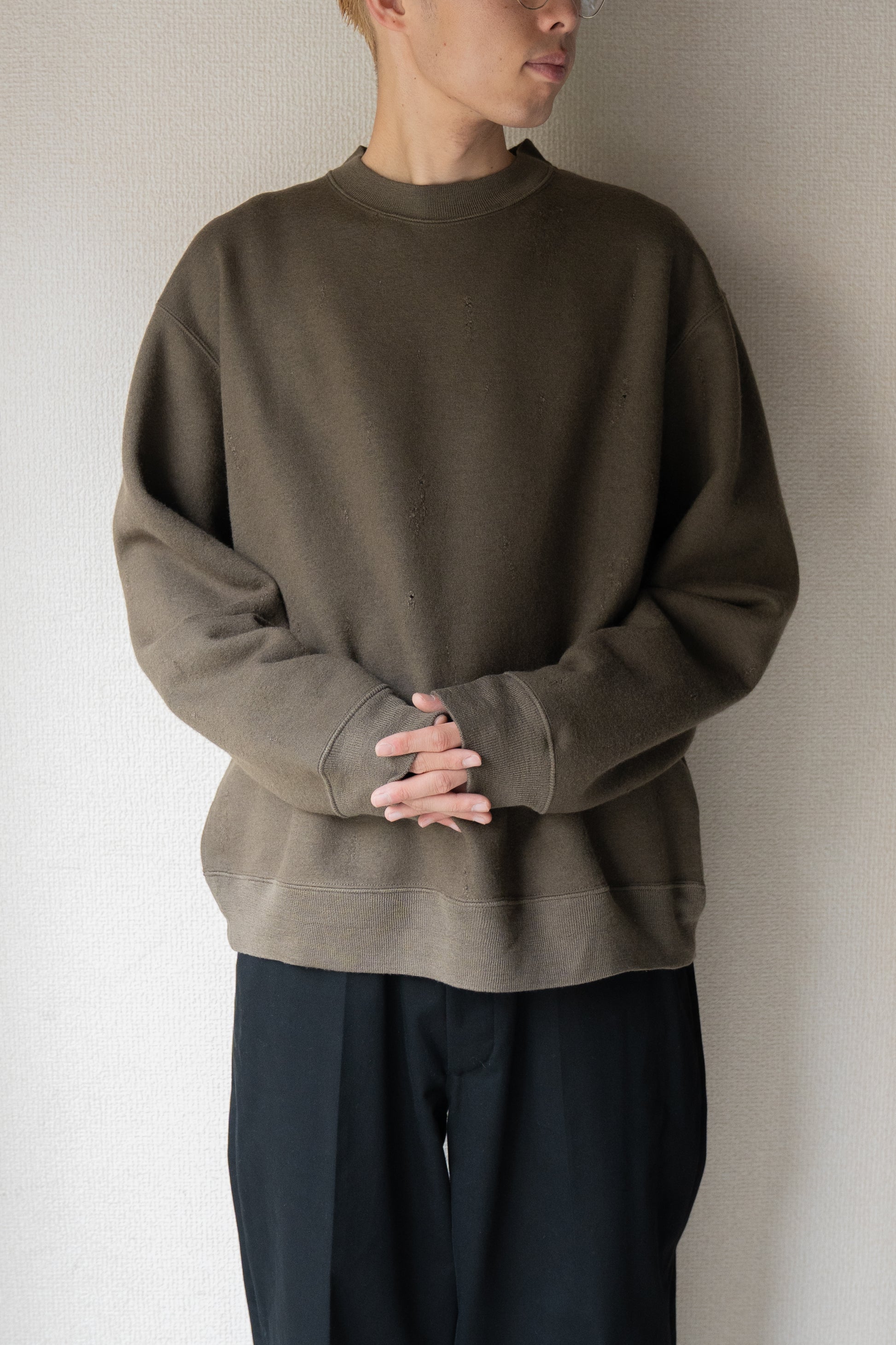 ダメージ加工を施したような裏毛のクルーネックセーター。