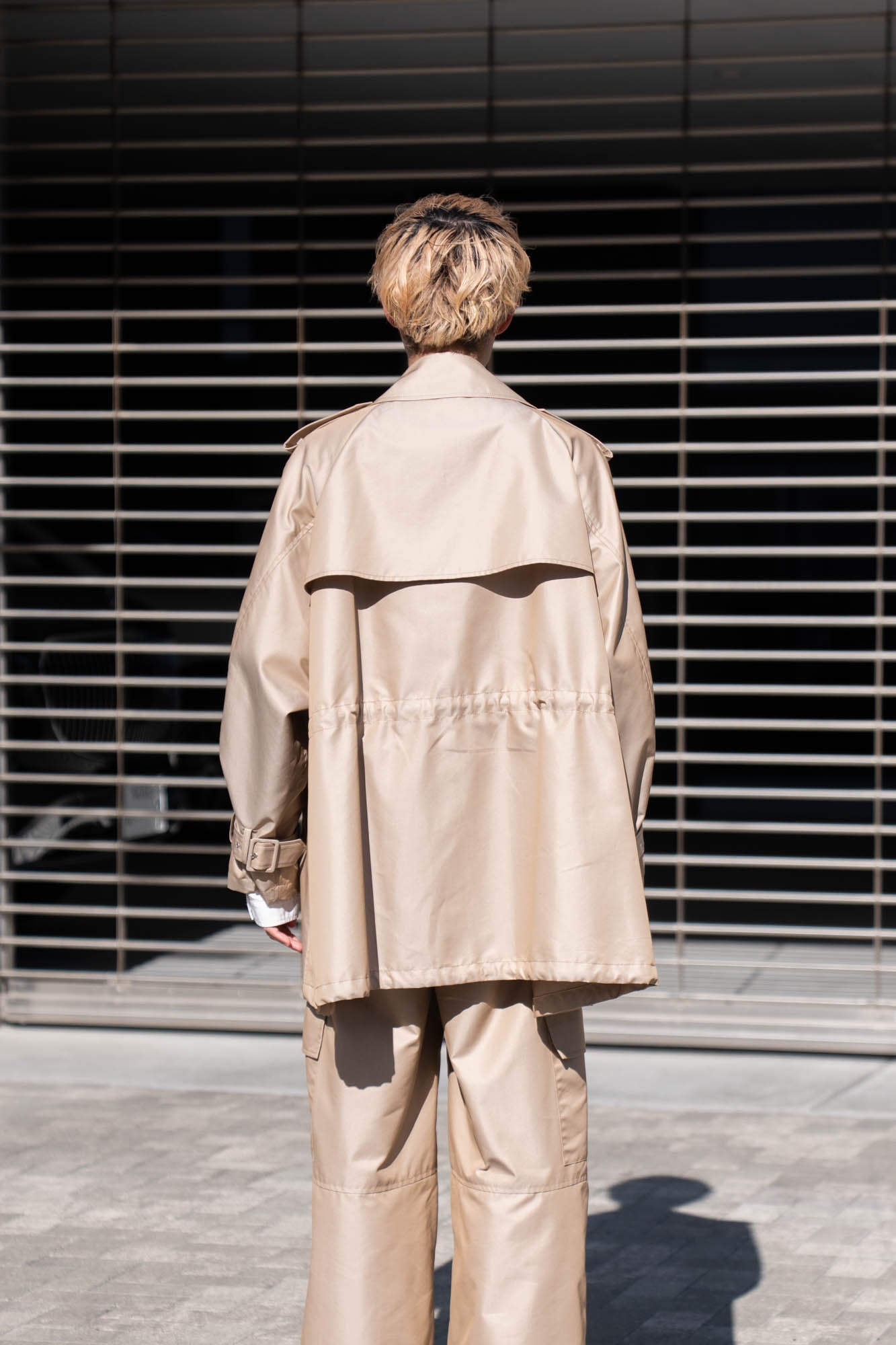 コレクションの中でもひときわ存在感を放つ、ミッド丈のトレンチコート。