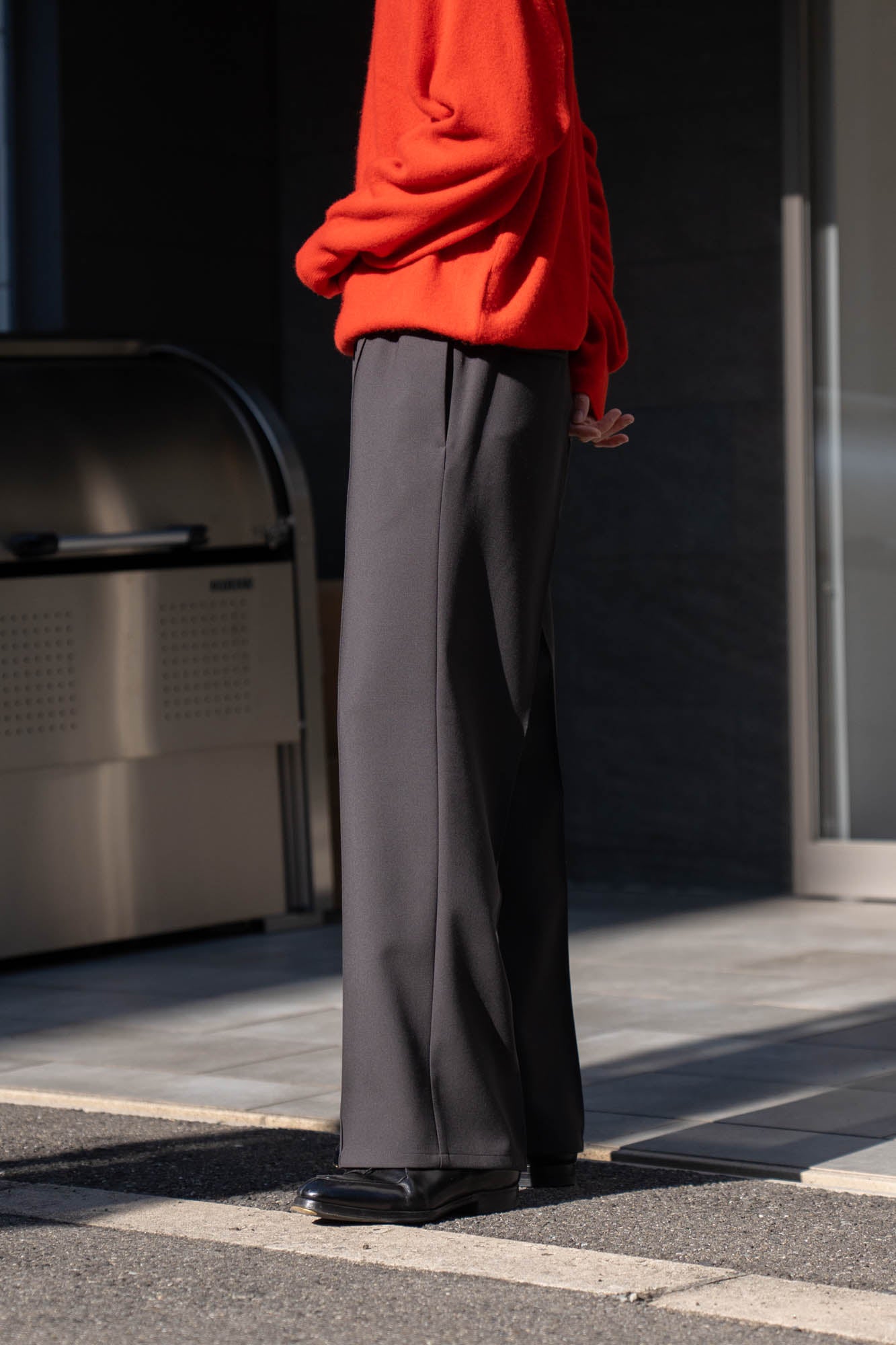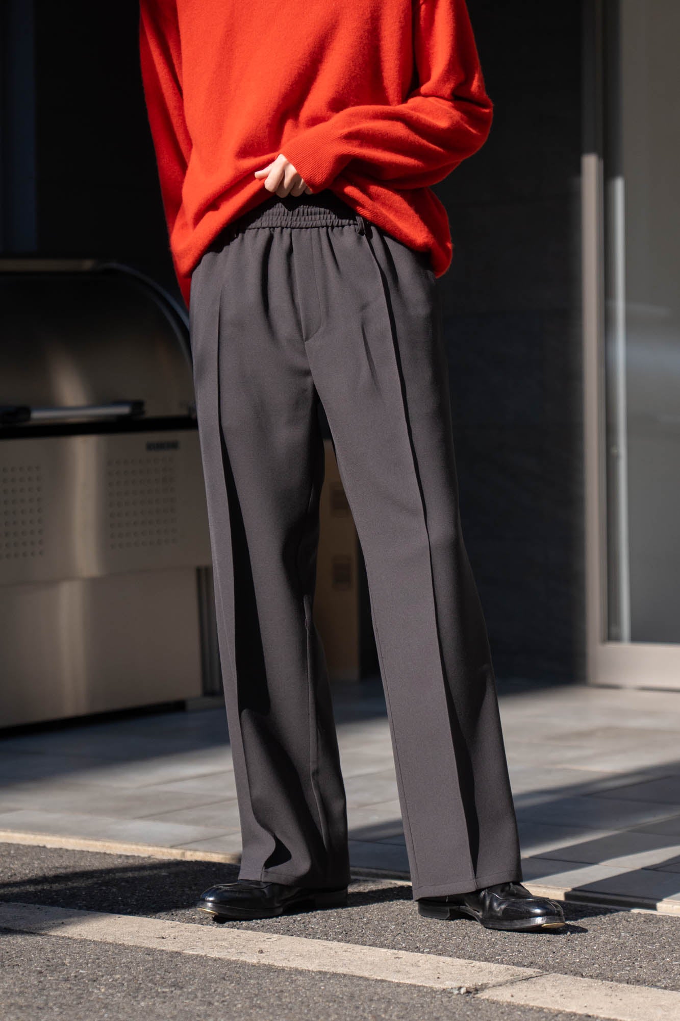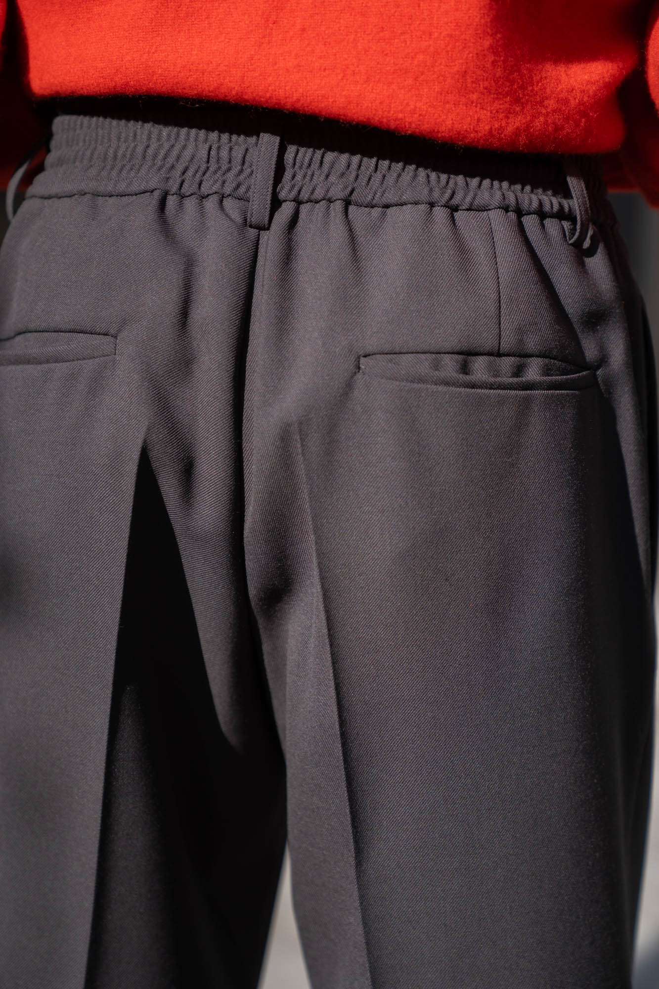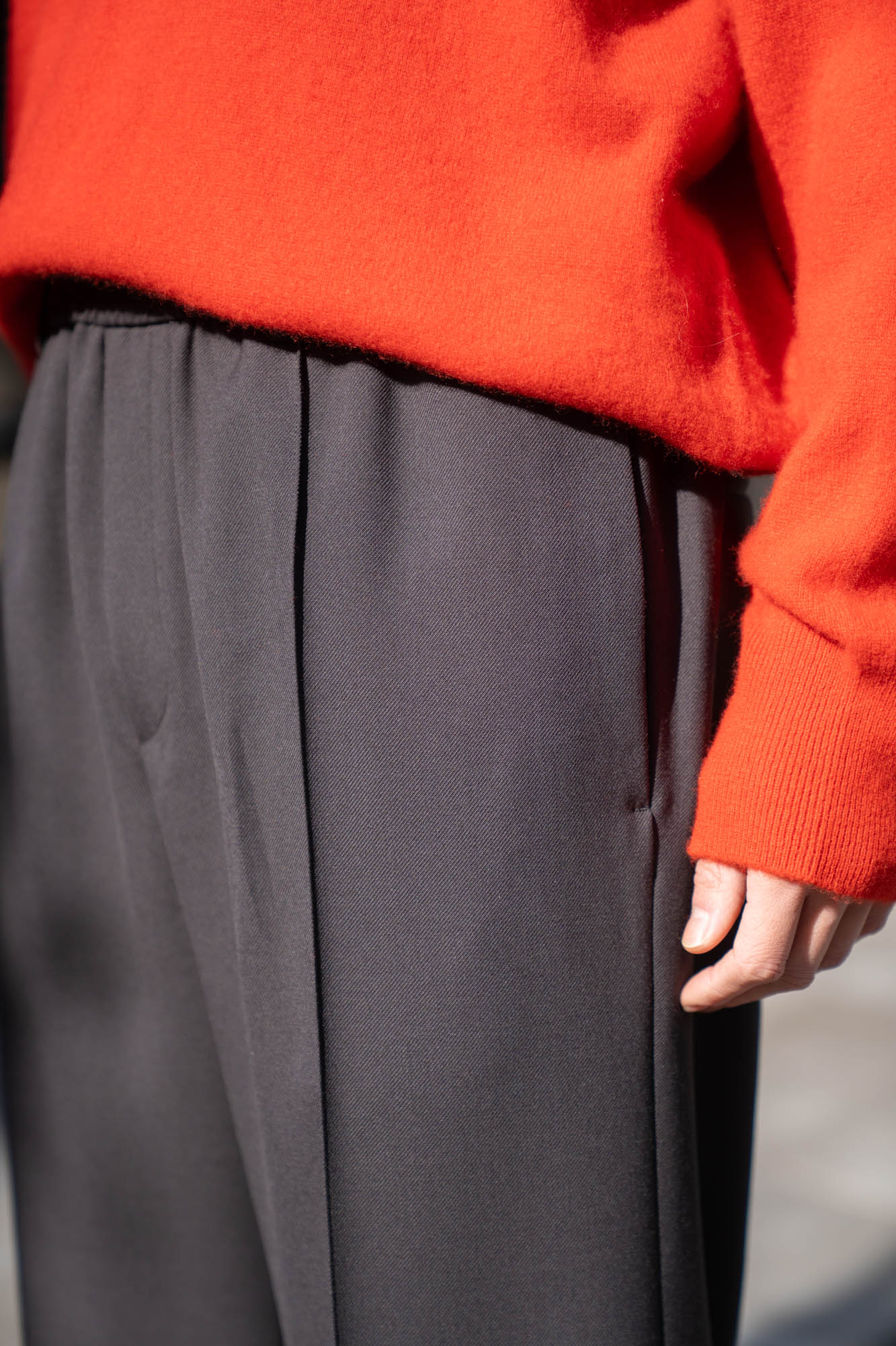 ウエストは紐付きゴム仕様。トップスをアウトしてきた時にスラックスを履いているように見えるよう、ウエストとヒップ寸のバランスを追求。