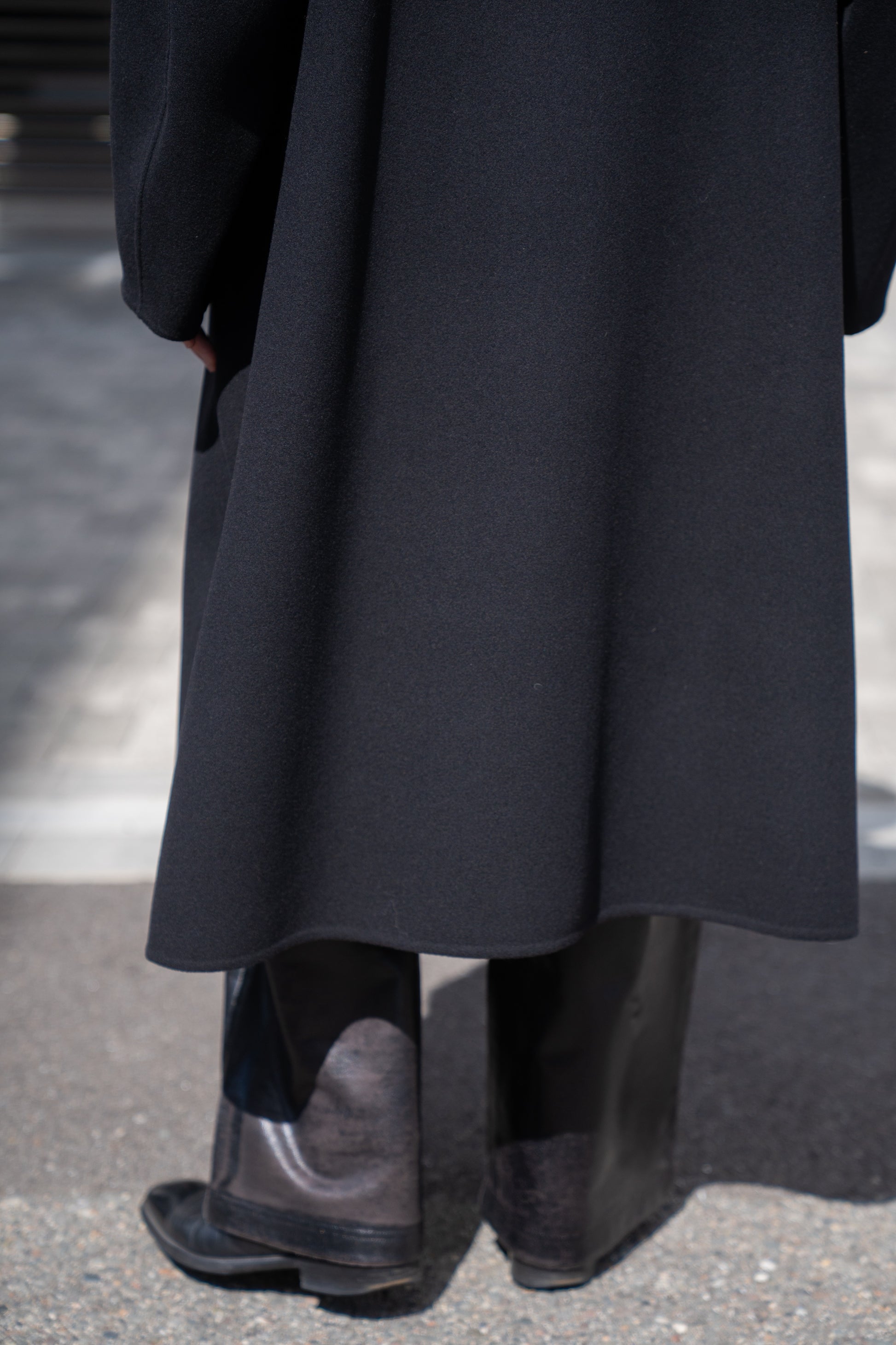 職人の手まつりによる“リバー縫製”で仕立て上げシームのストレスがなく、軽くてシンプルな作りを追求した。包み込むようなゆったりとしたボリュームを直線的なラインで設計することで、着用時に余った分量が程よいドレープになり、美しいシルエットを生みます。