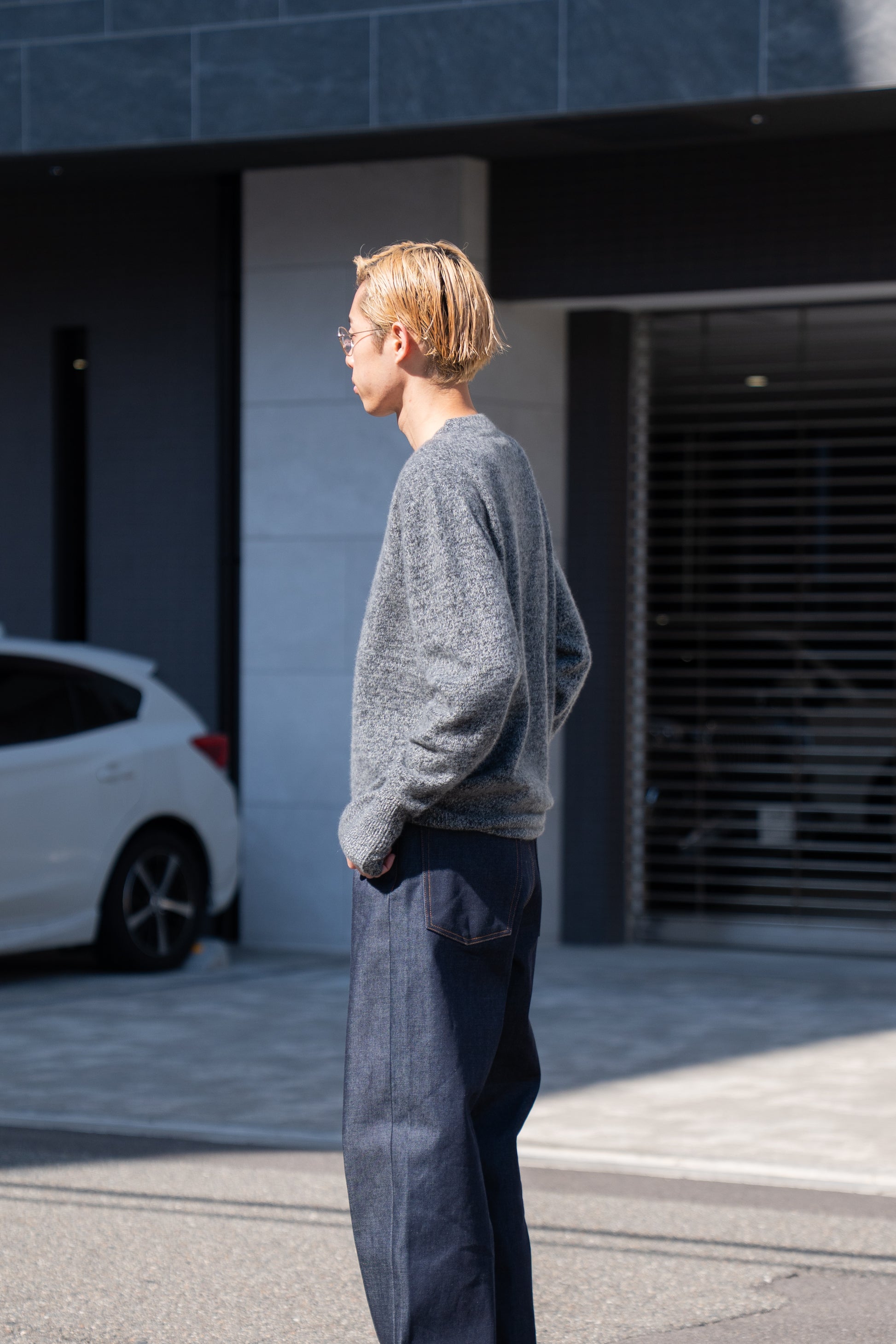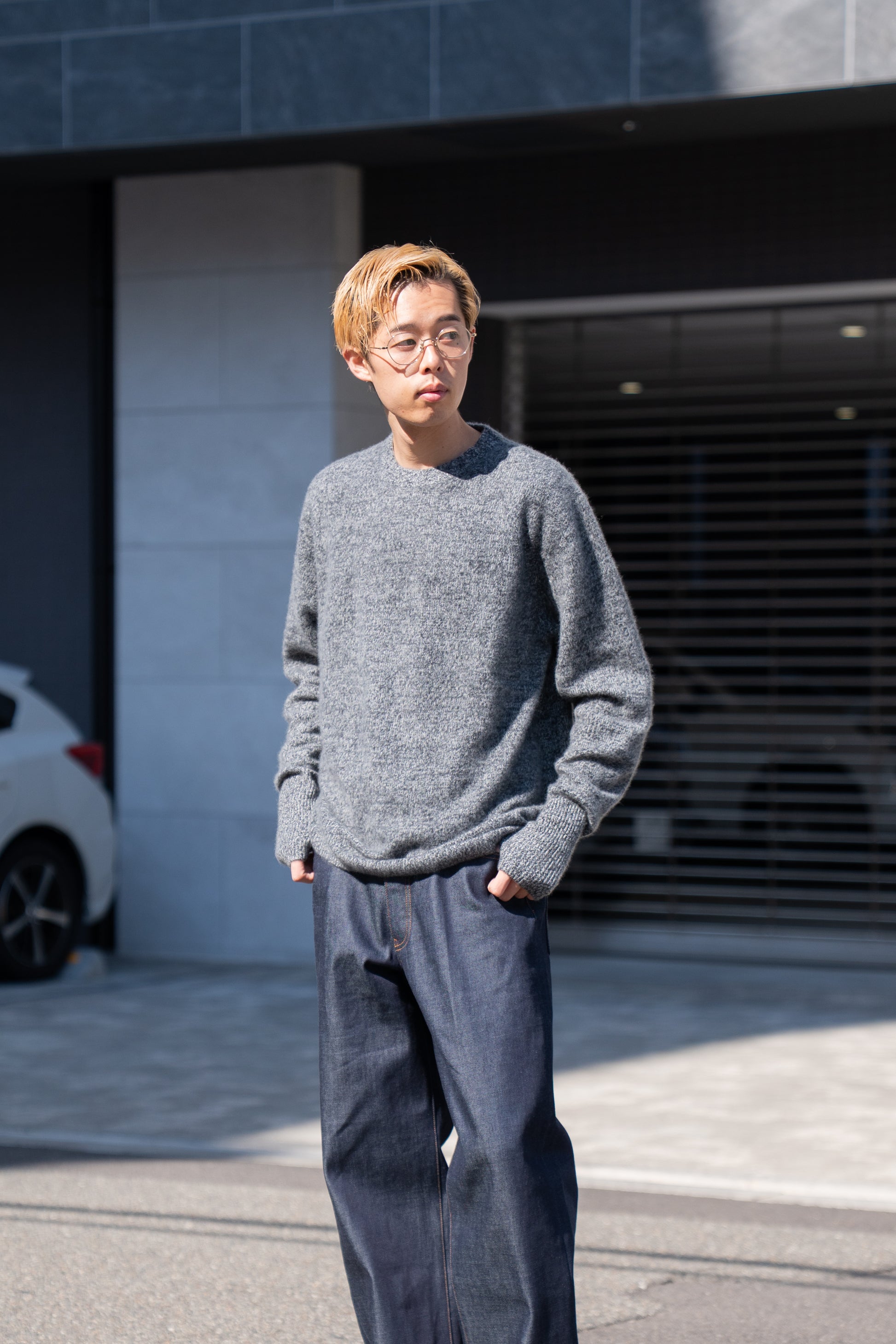 空気をたっぷりと含んだベビーカシミヤの極細糸を2本どりで緩く甘く編み立てたあと、製品仕上げ工程で強縮絨を施した5ゲージ天竺素材。