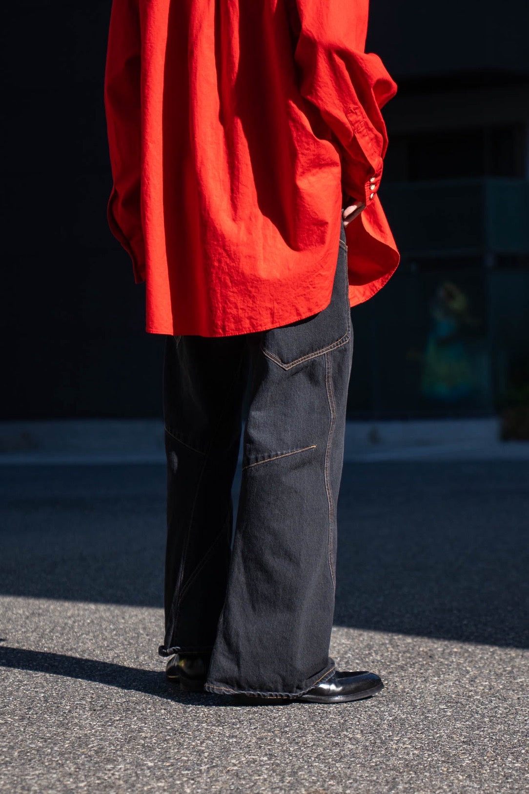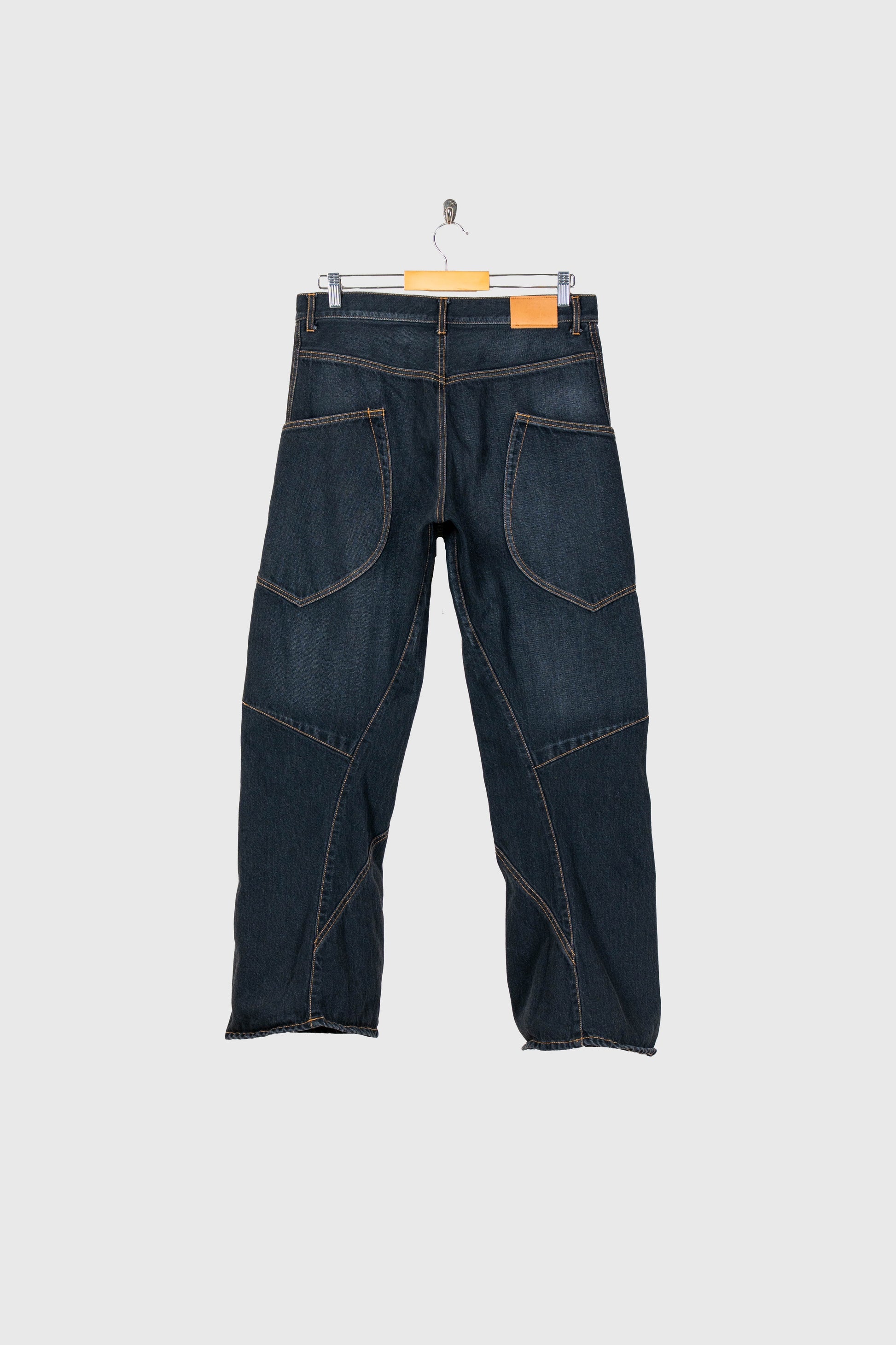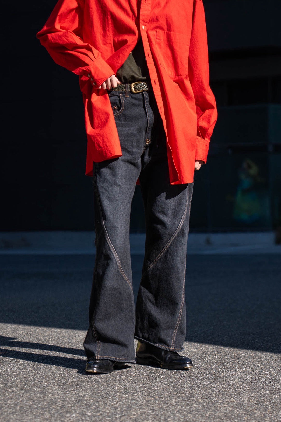 変則的なパターンカッティングによって製作された、フレアカットのデニムパンツ。