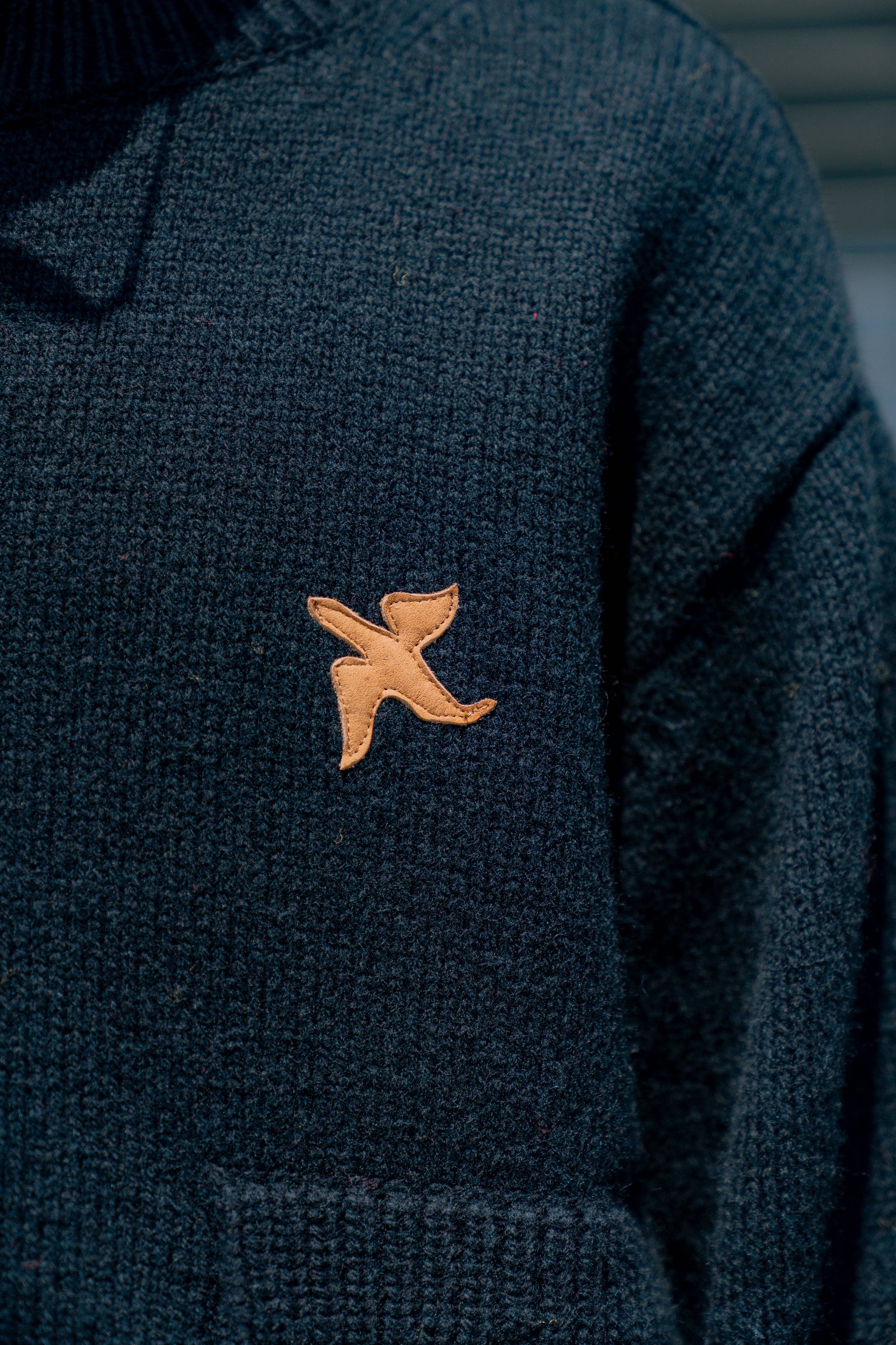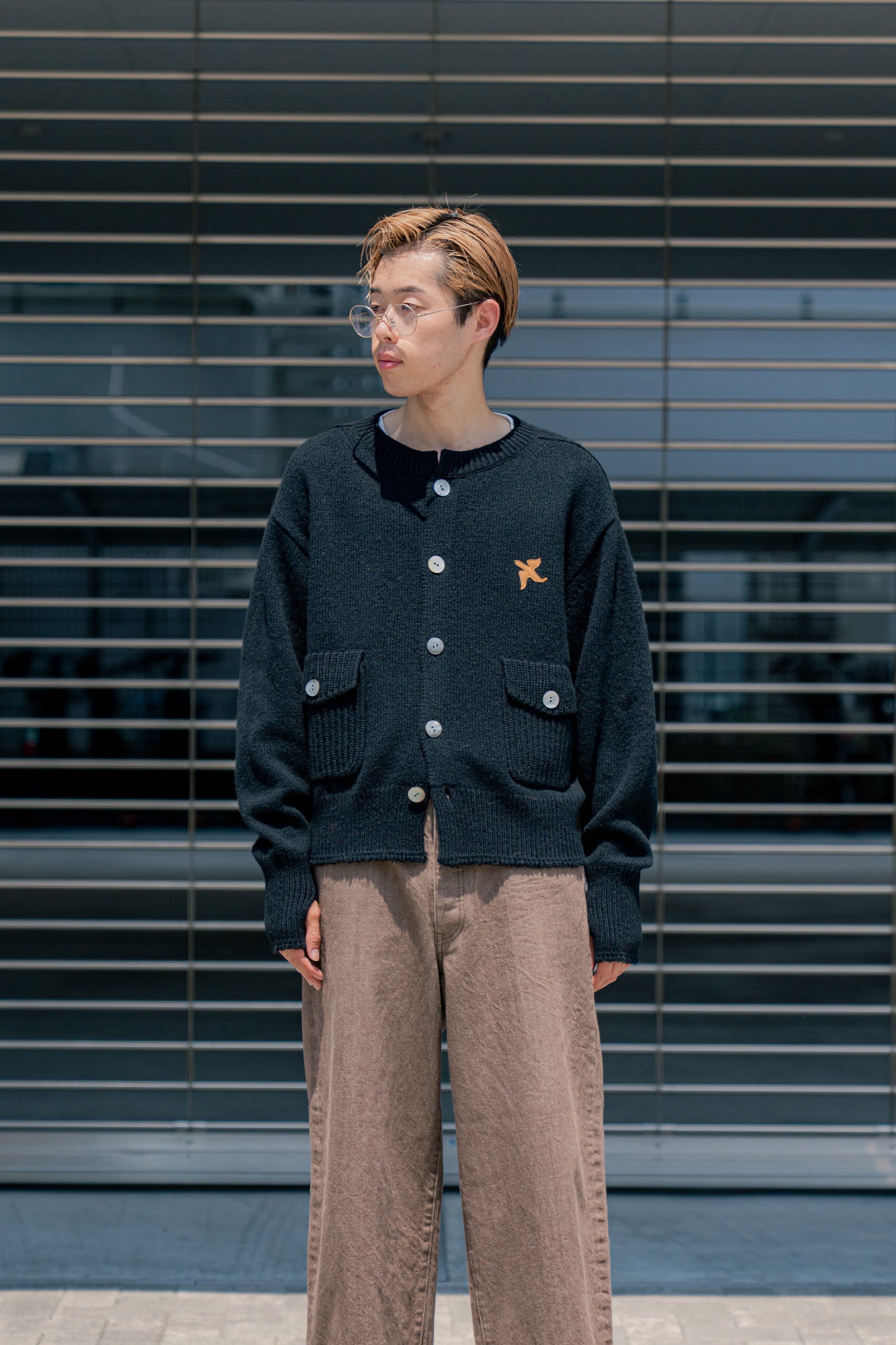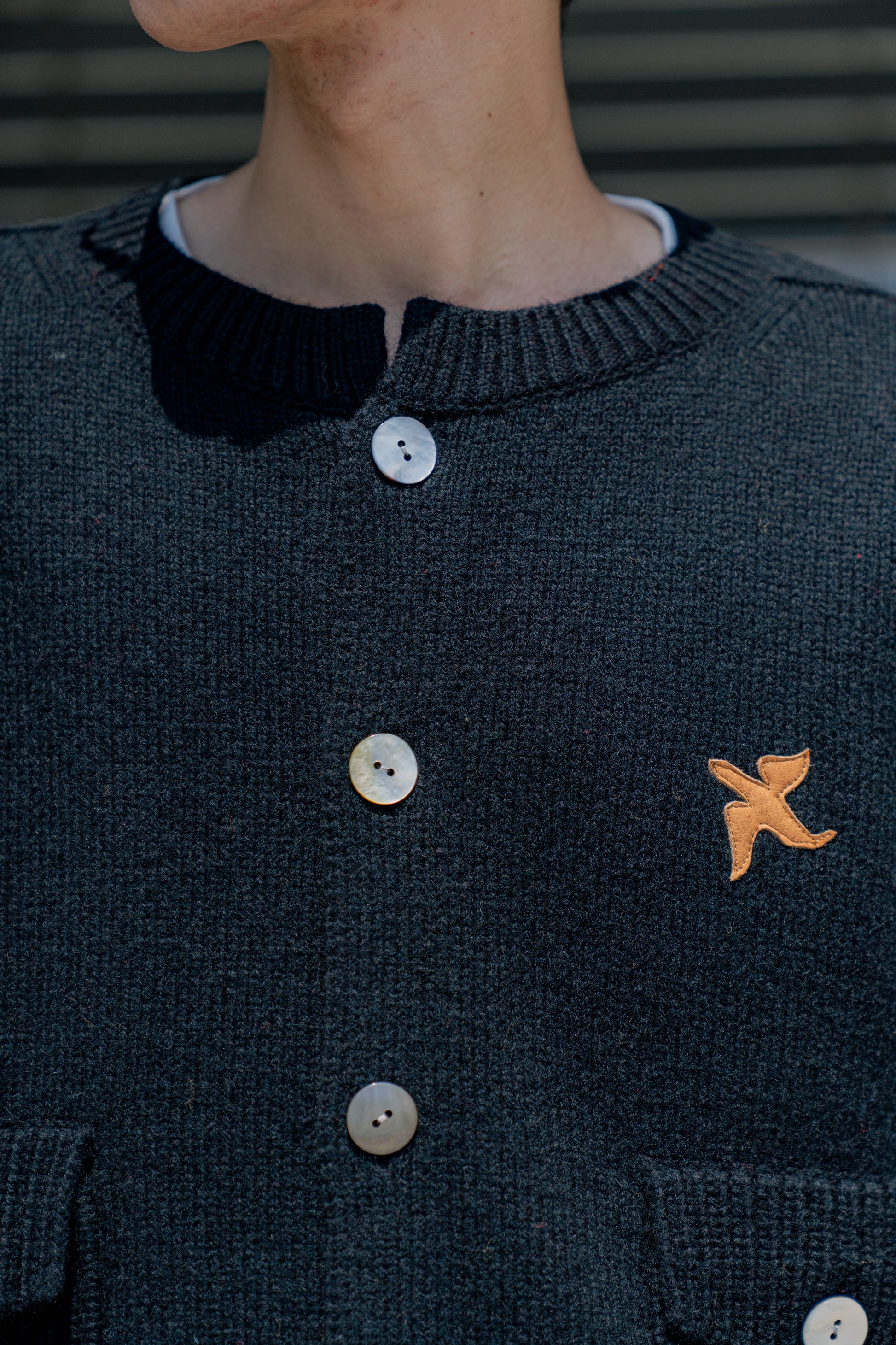 表にシェットランドウール、肌側にコットンを使用したクルーネックのカーディガン。