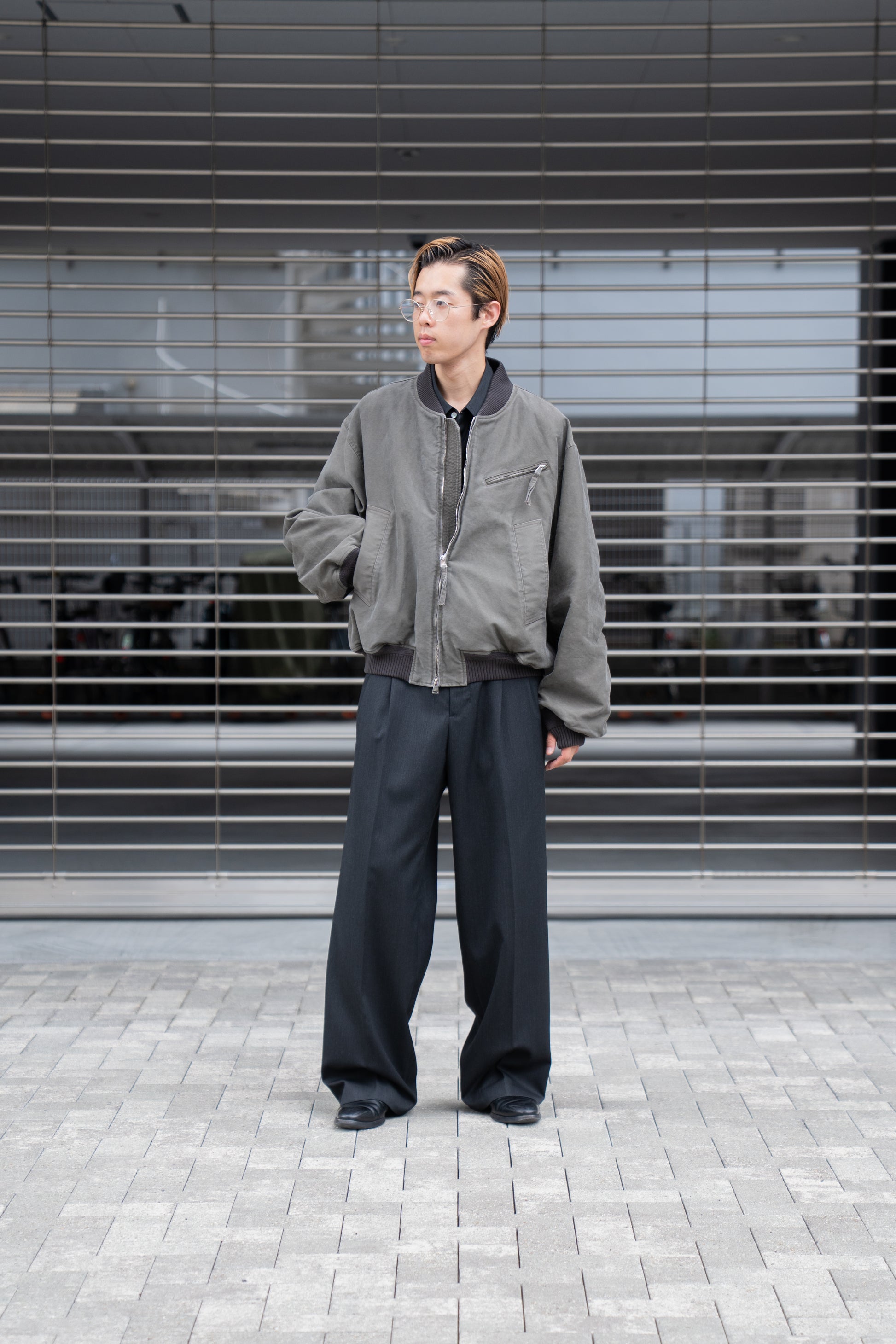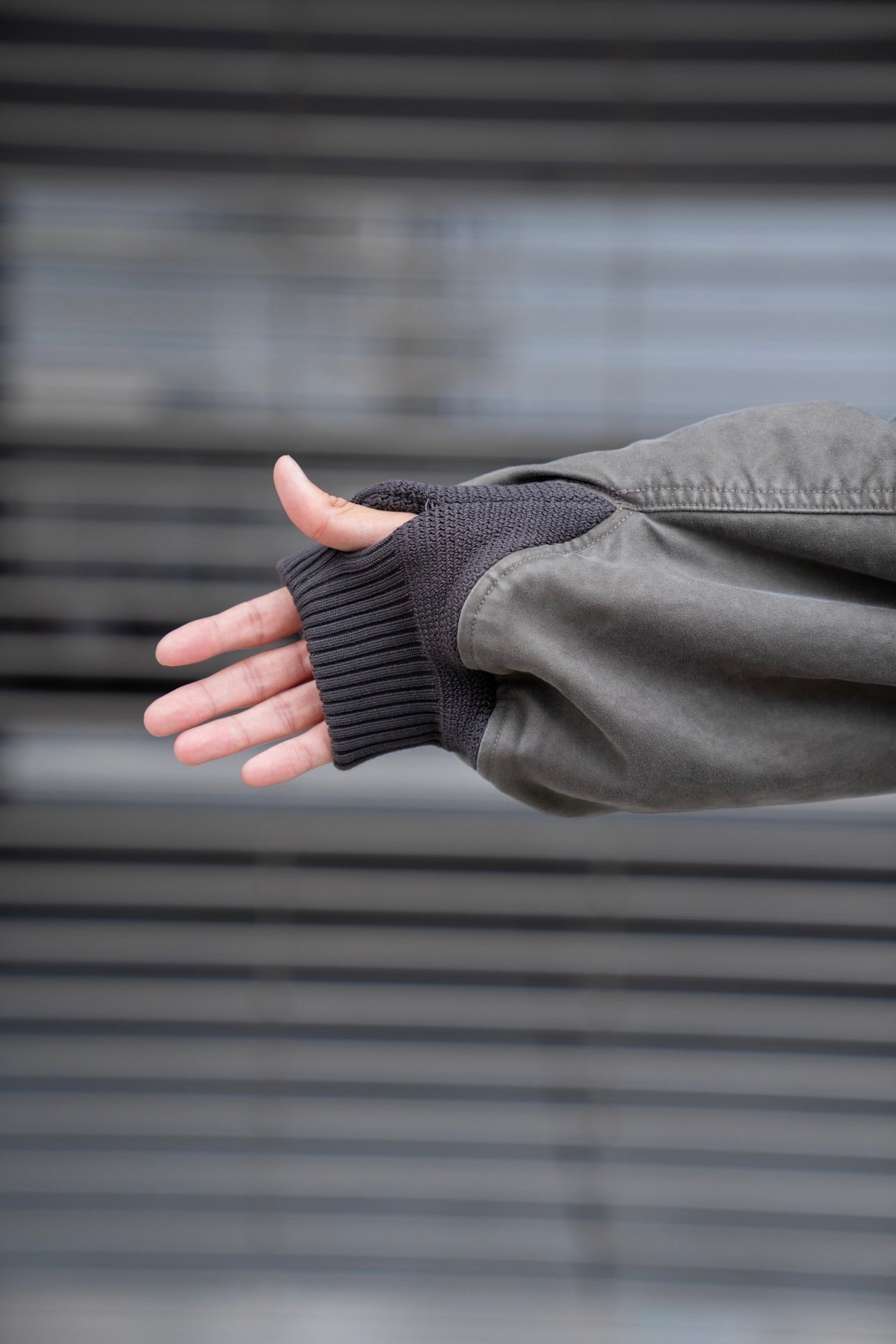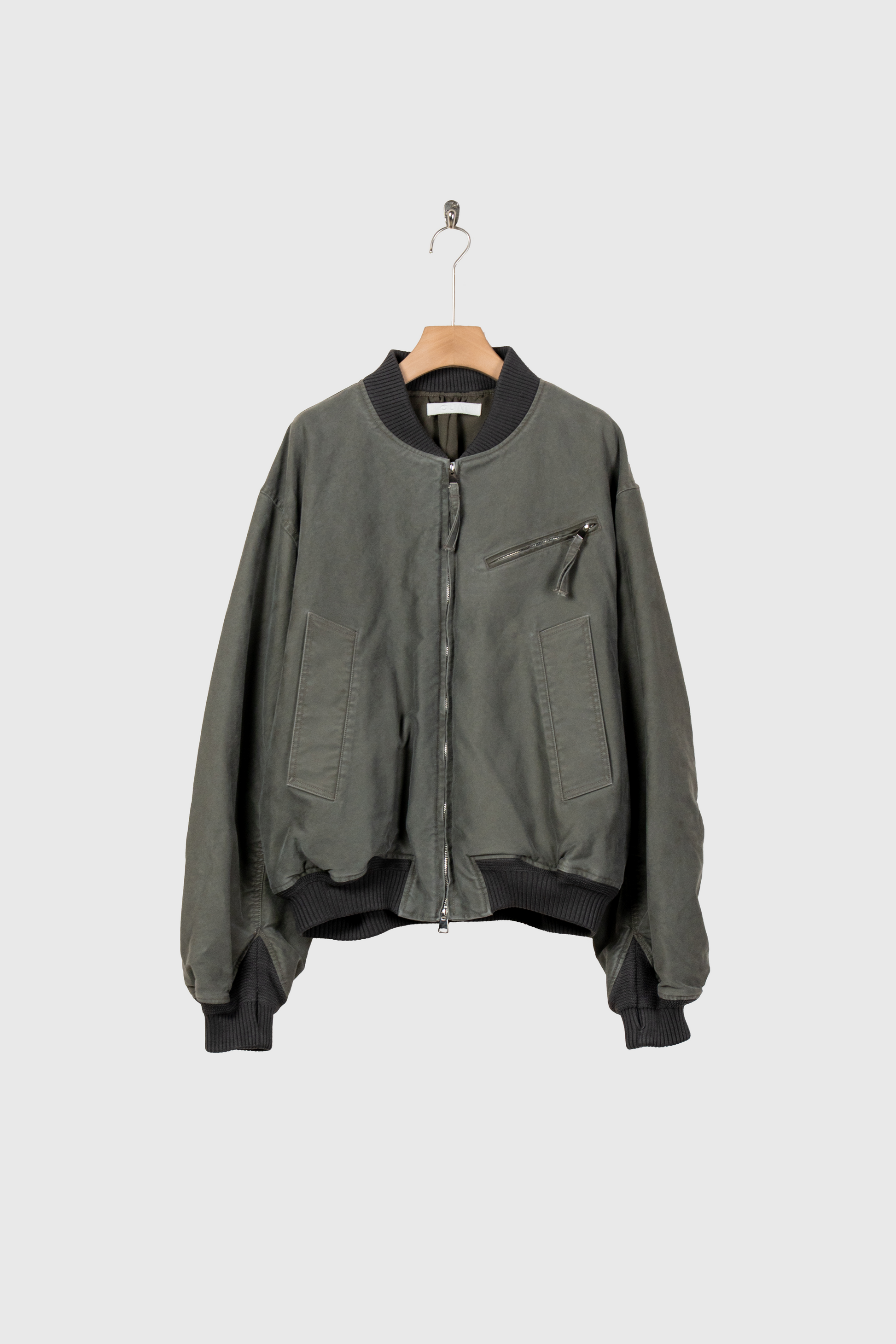 高密度に織り上げた日本製オーガニックコットン・モールスキンを硫化染めし、ボンバージャケットに仕立てたアイテム。