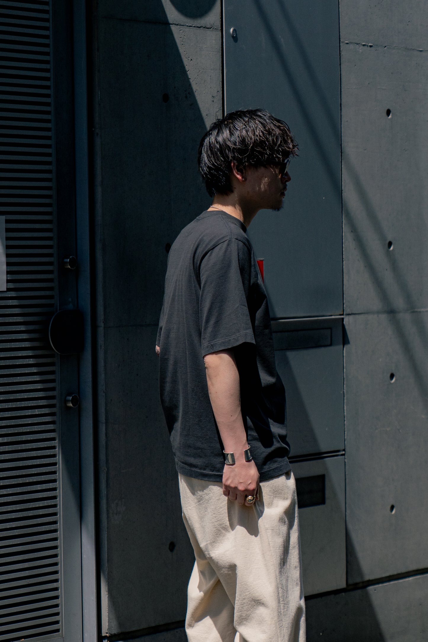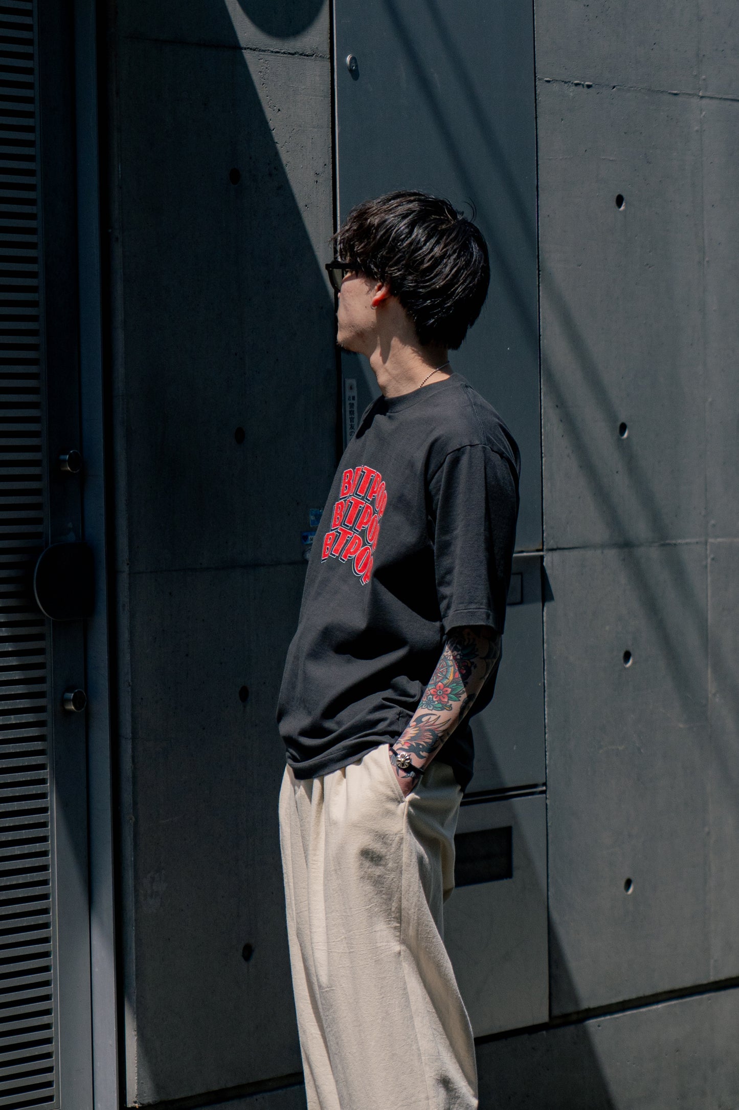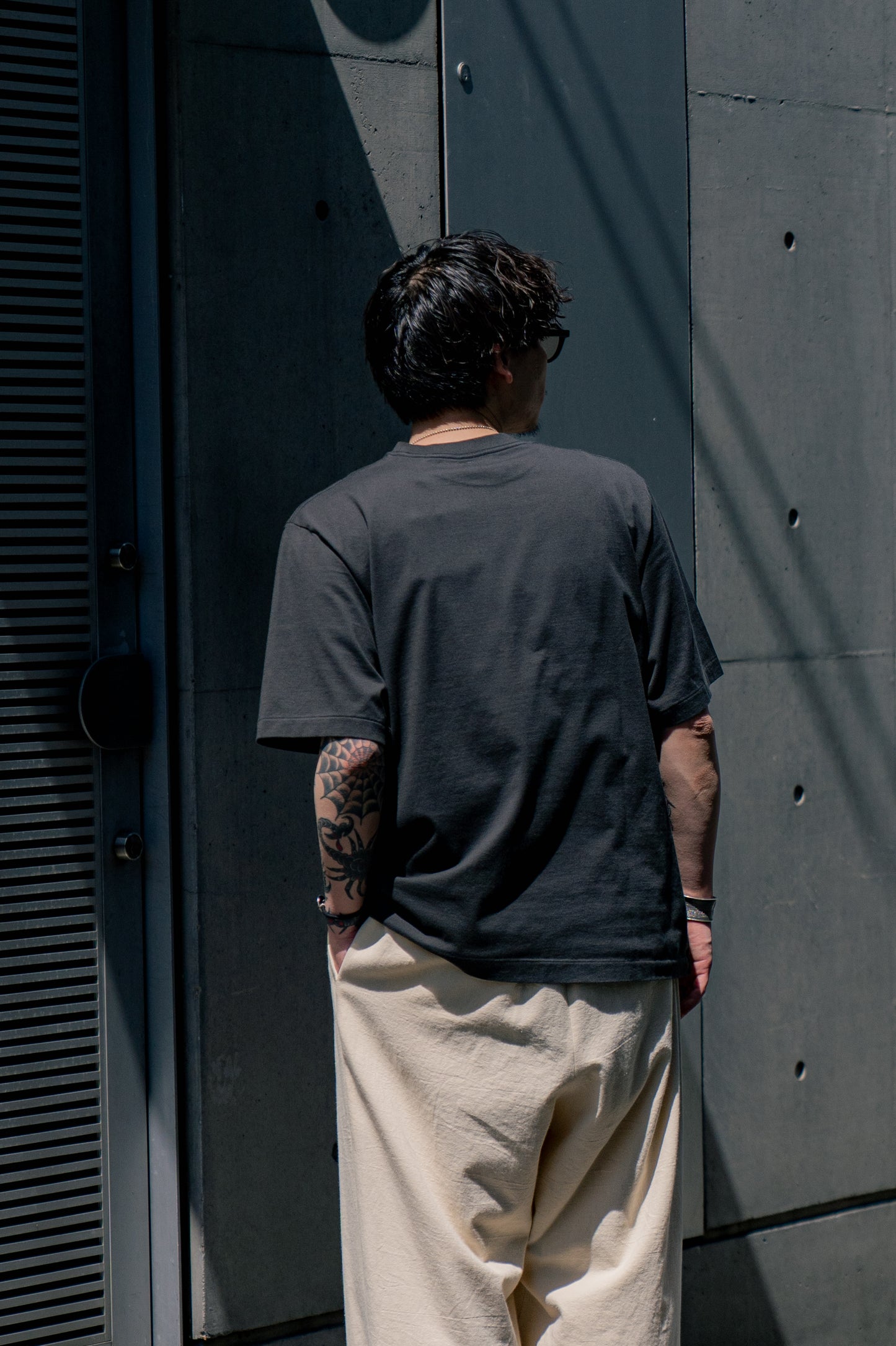 太番手の糸をハイゲージで編んだ天竺を使用した”Print Tee”。プリント後に何度も洗い、ソフトで着心地の良い風合いに仕上げています。