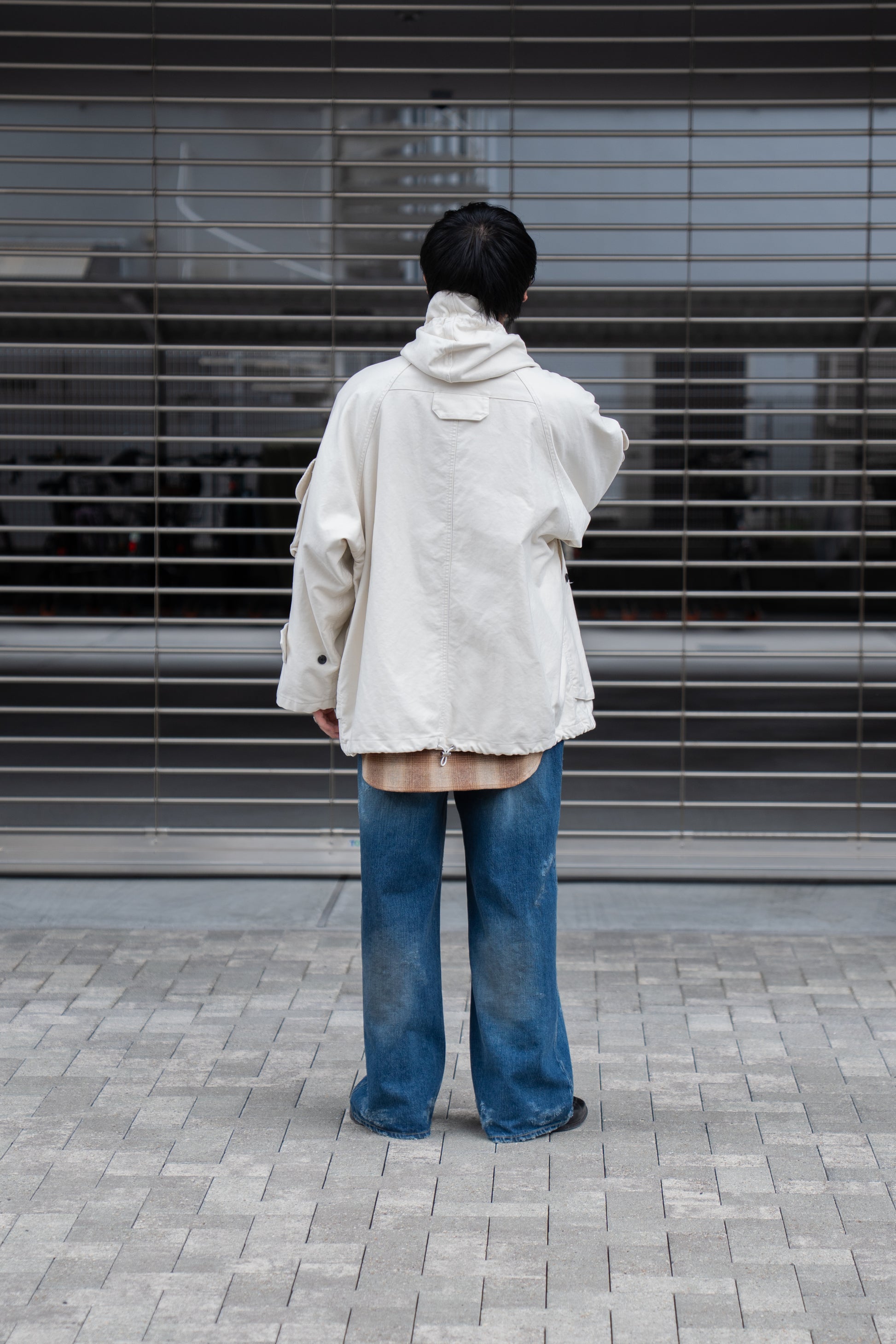 高密度に織り上げた日本製オーガニックコットン・モールスキンを硫化染めし、大きなフーデッドジャケットに仕立てたアイテム。