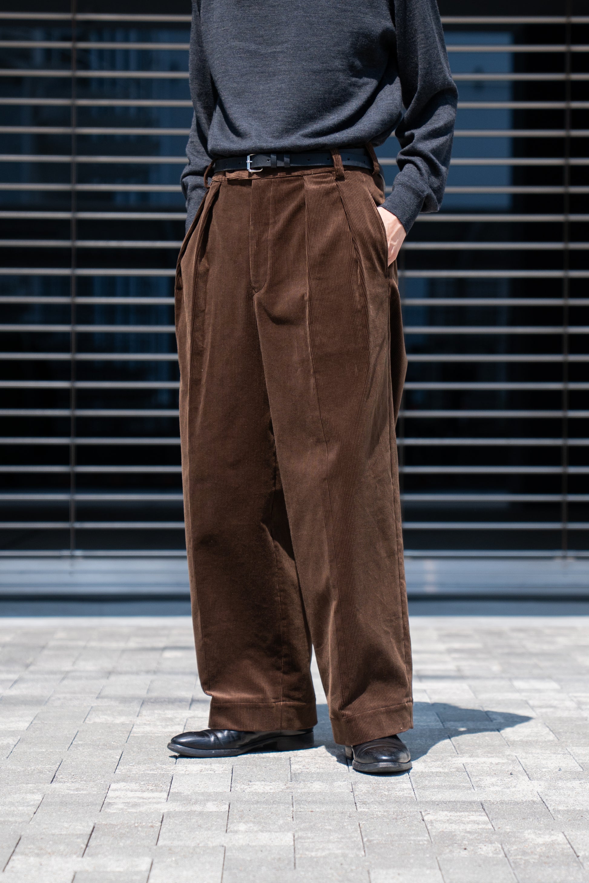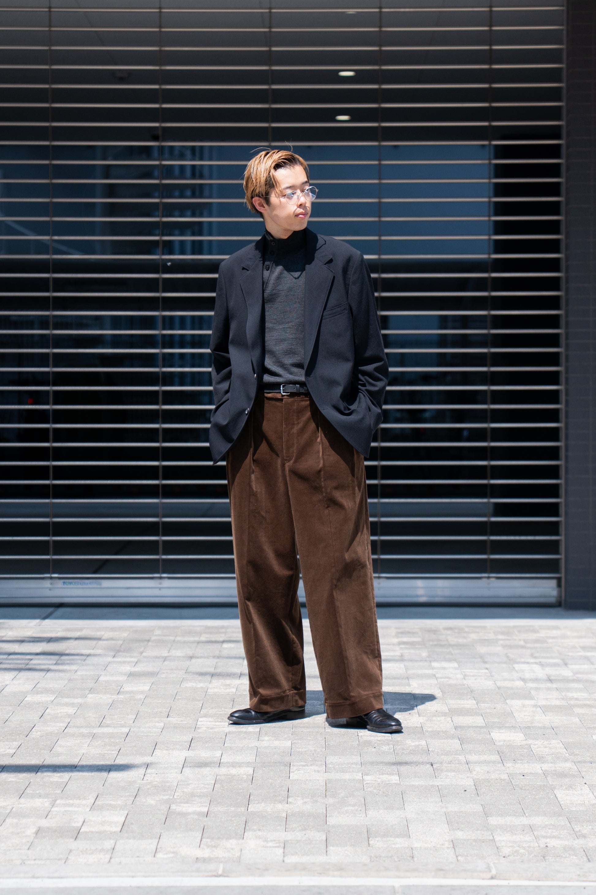 SS25のワイドチノよりやや裾巾を狭くした2タックワイドトラウザー。