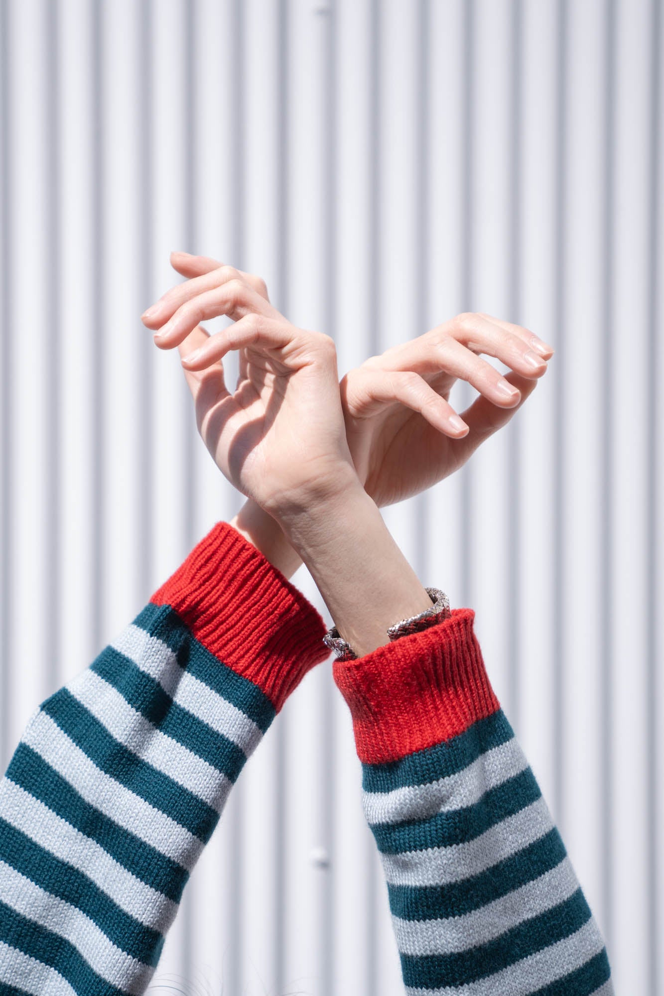 ポリエステルと混紡することで形状を安定させると共に、ハリ感と伸縮性も出しています。