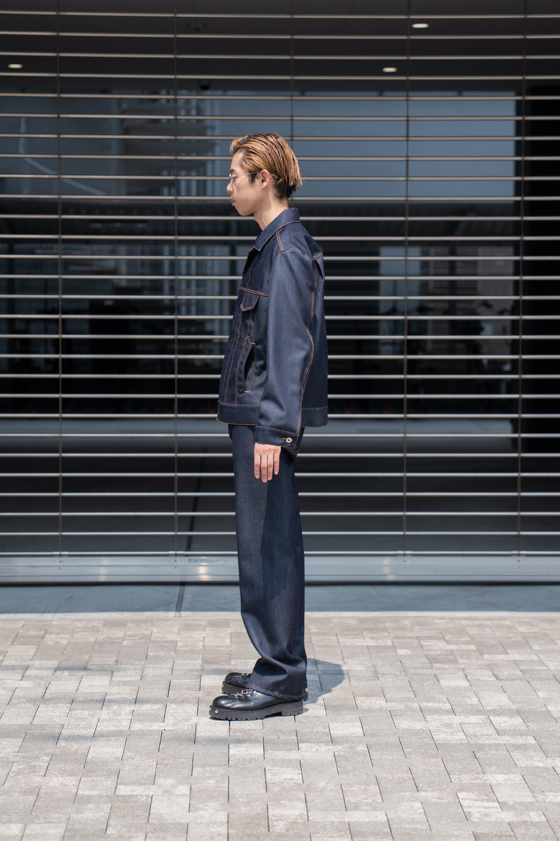 特殊なハード加工を施すことでパリッとした質感を表現しており、より一層デニムらしい風合いに近づけ、デニムでありながらウールを用いることで経年劣化や色が変わることがなく、また上品さも兼ね備えた1着です。