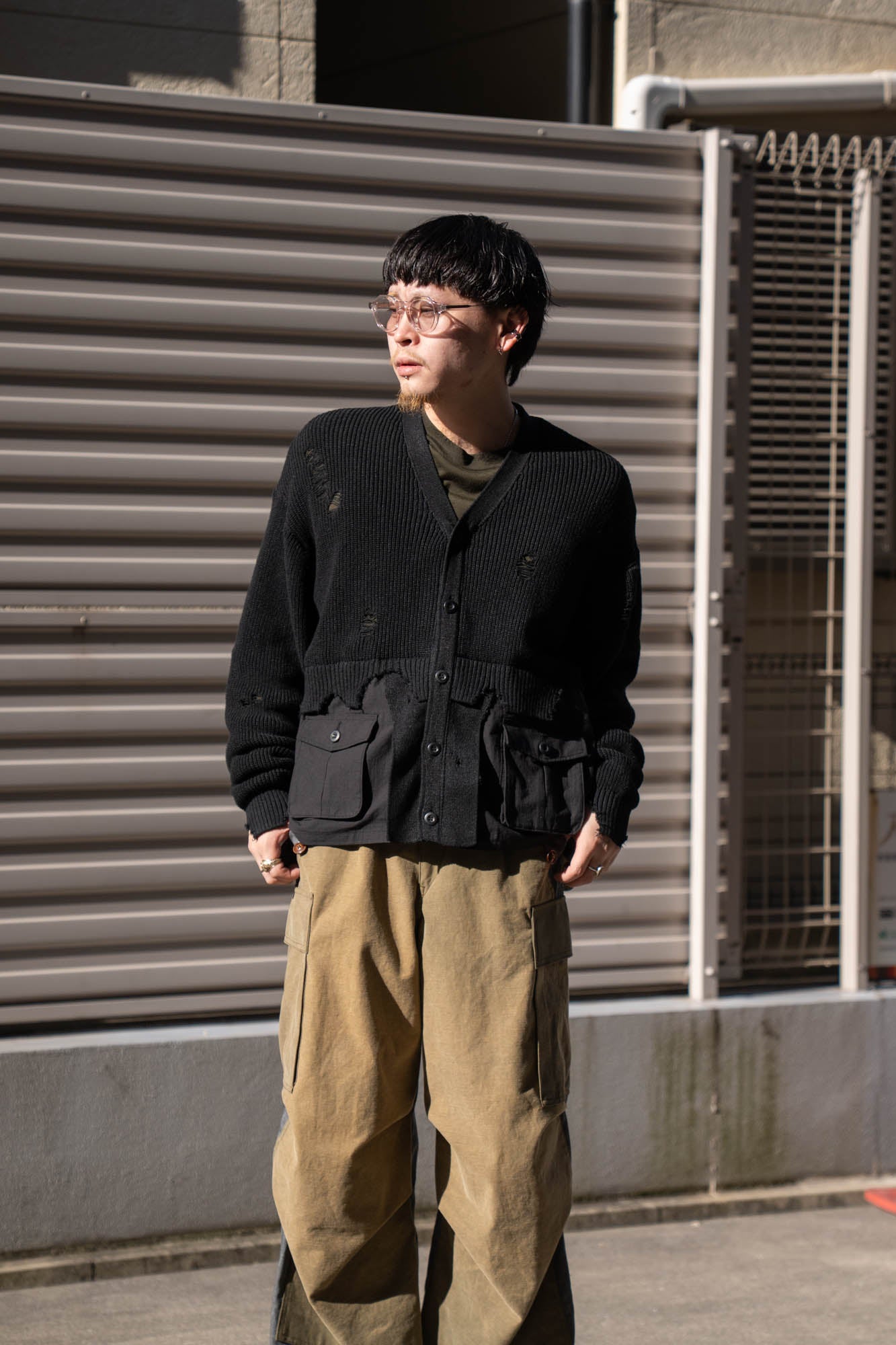 ニットカーディガンとミリタリーウェアをドッキングさせた、異素材のコントラストが際立つ一着。