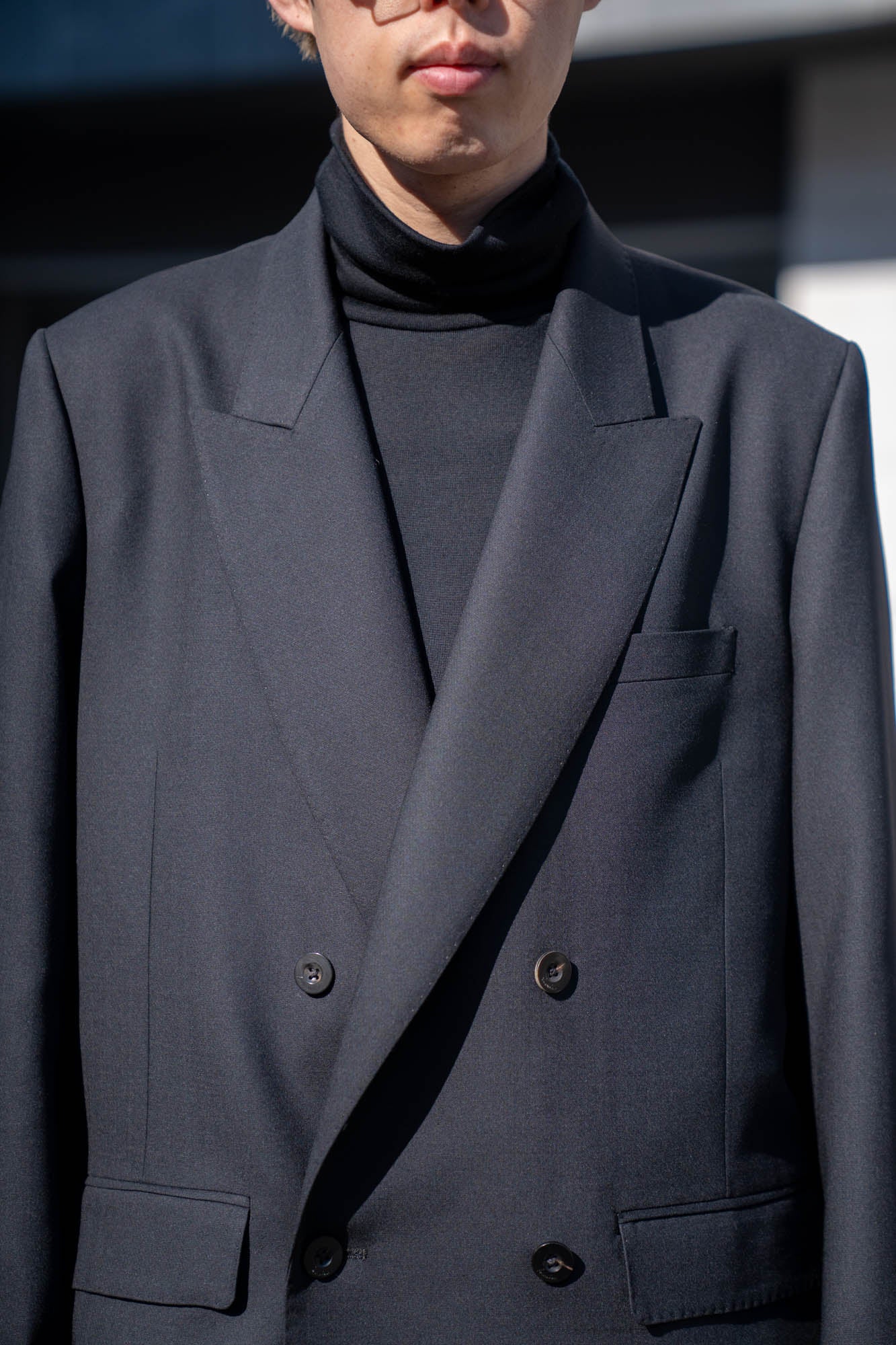 二重織のウールナイロン素材を使用した、 ピークドラペルのダブルブレストジャケット。