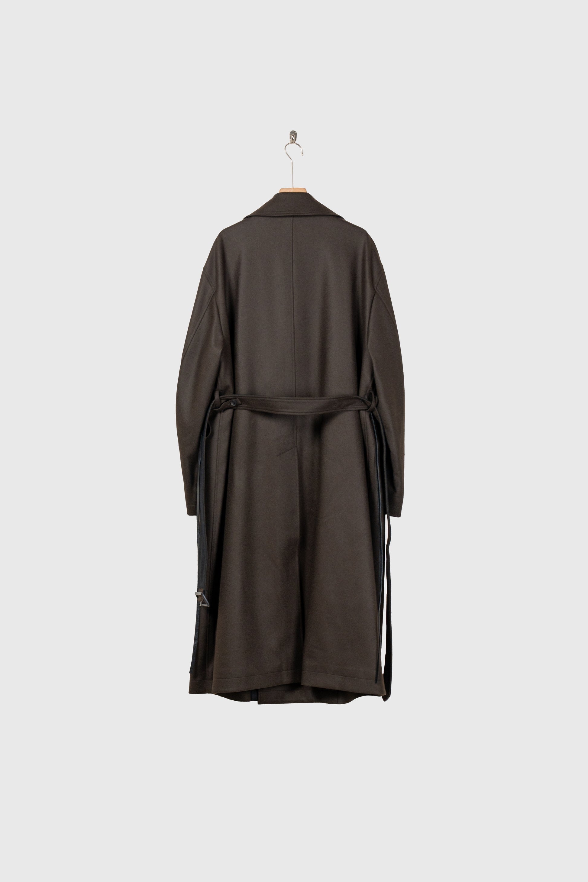 内側ラペルを立てたときの印象が特徴的デザインに、ウエストにはレザー紐が縫い込まれているので様々な着こなしを楽しめます。