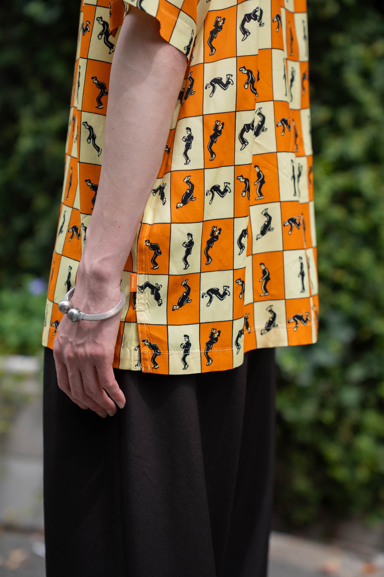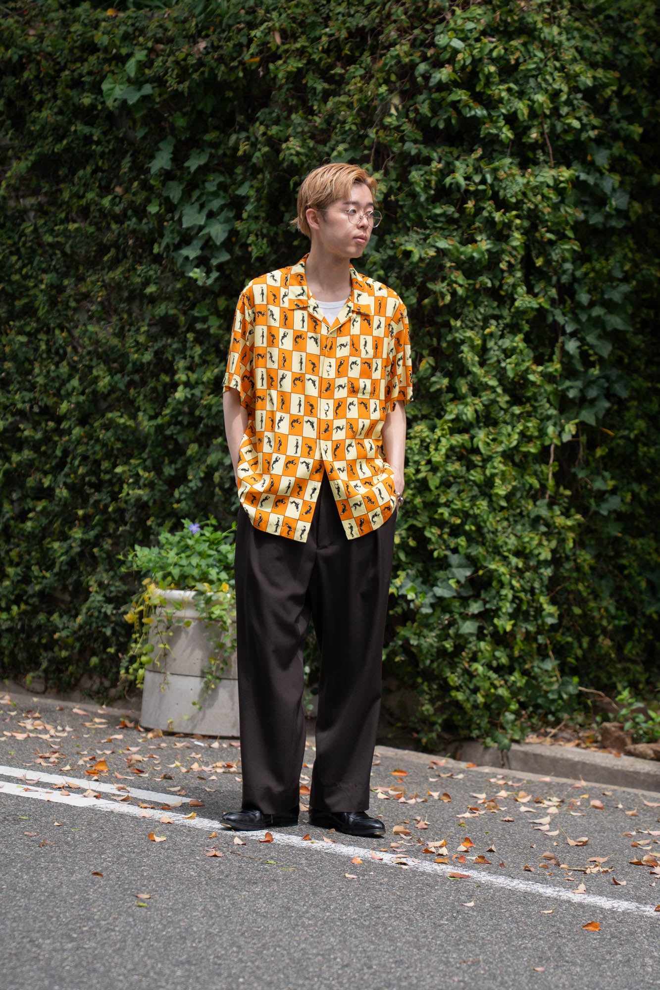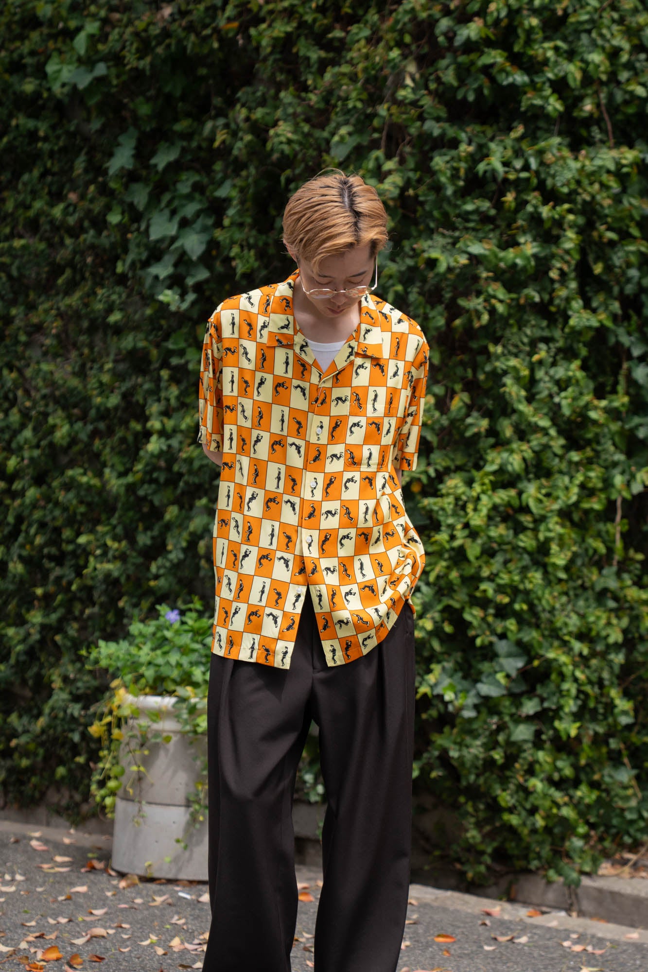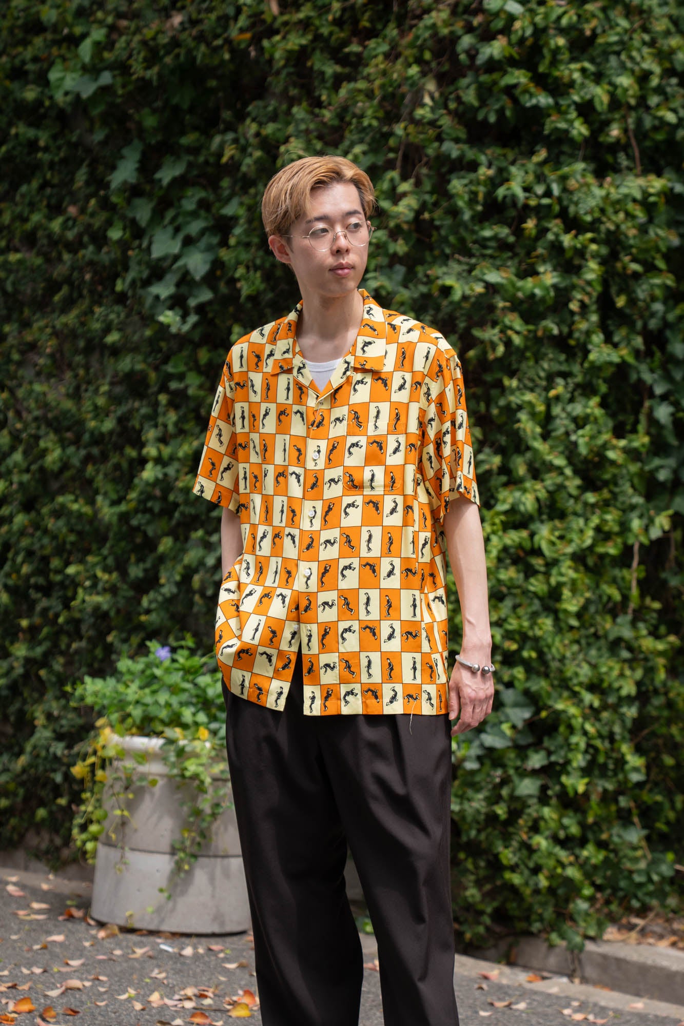 アイコンがバク宙をしている、上品な肌触りが特徴的なレーヨンエット生地を使用したオープンカラーシャツ。