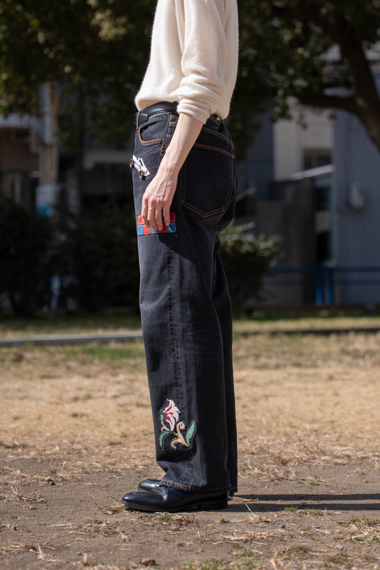 KHOKIの象徴的な手刺繍が施されたデニムパンツ。