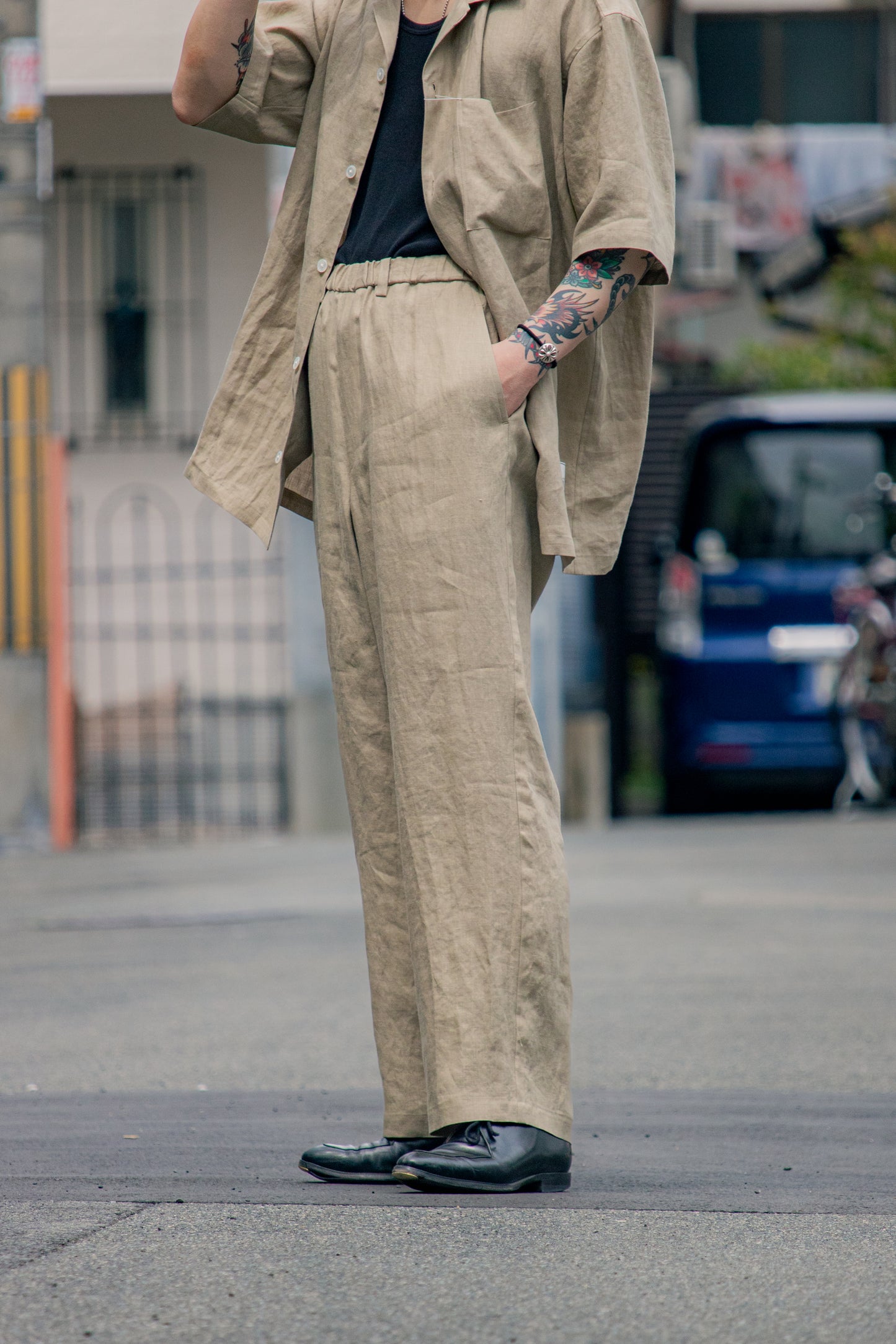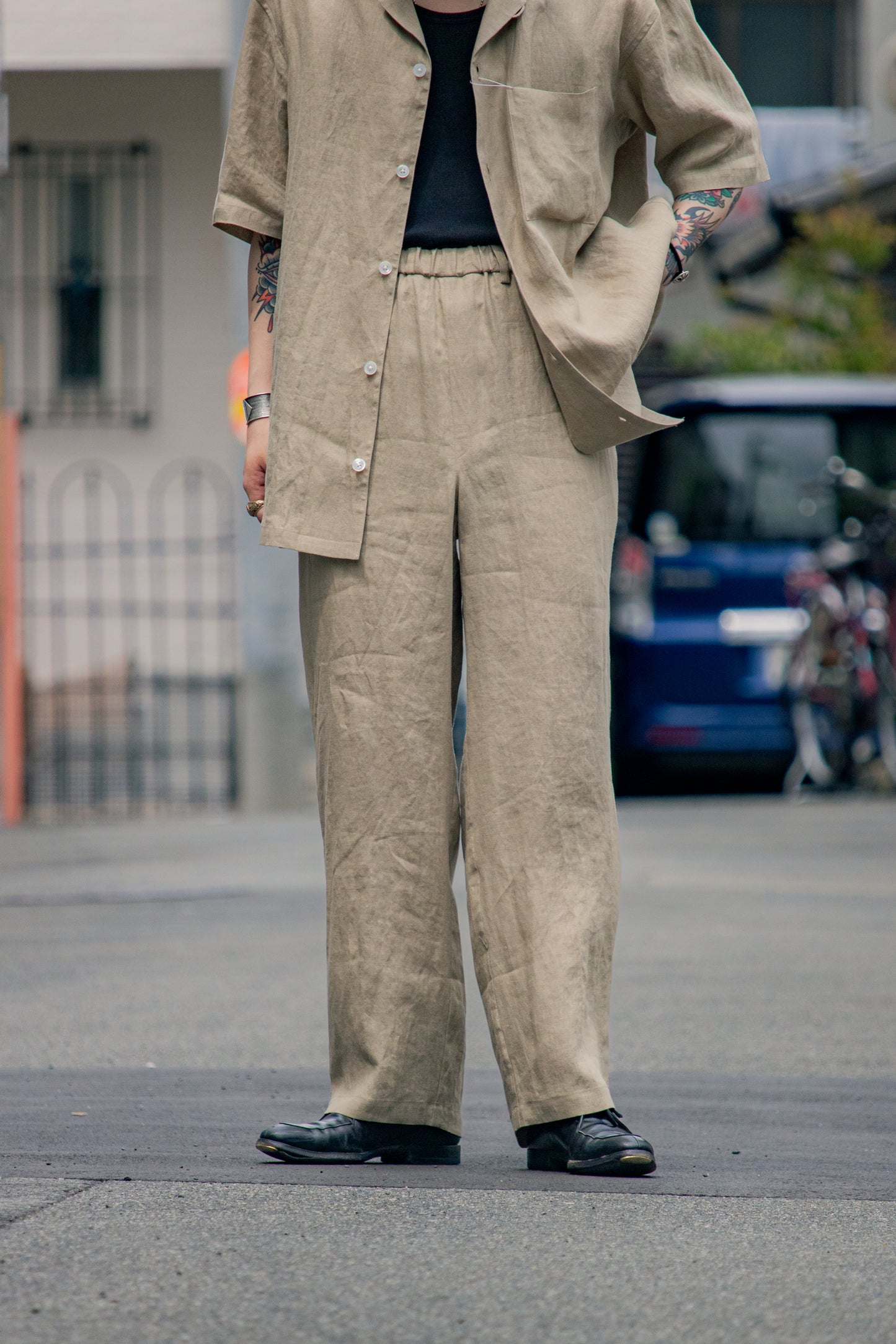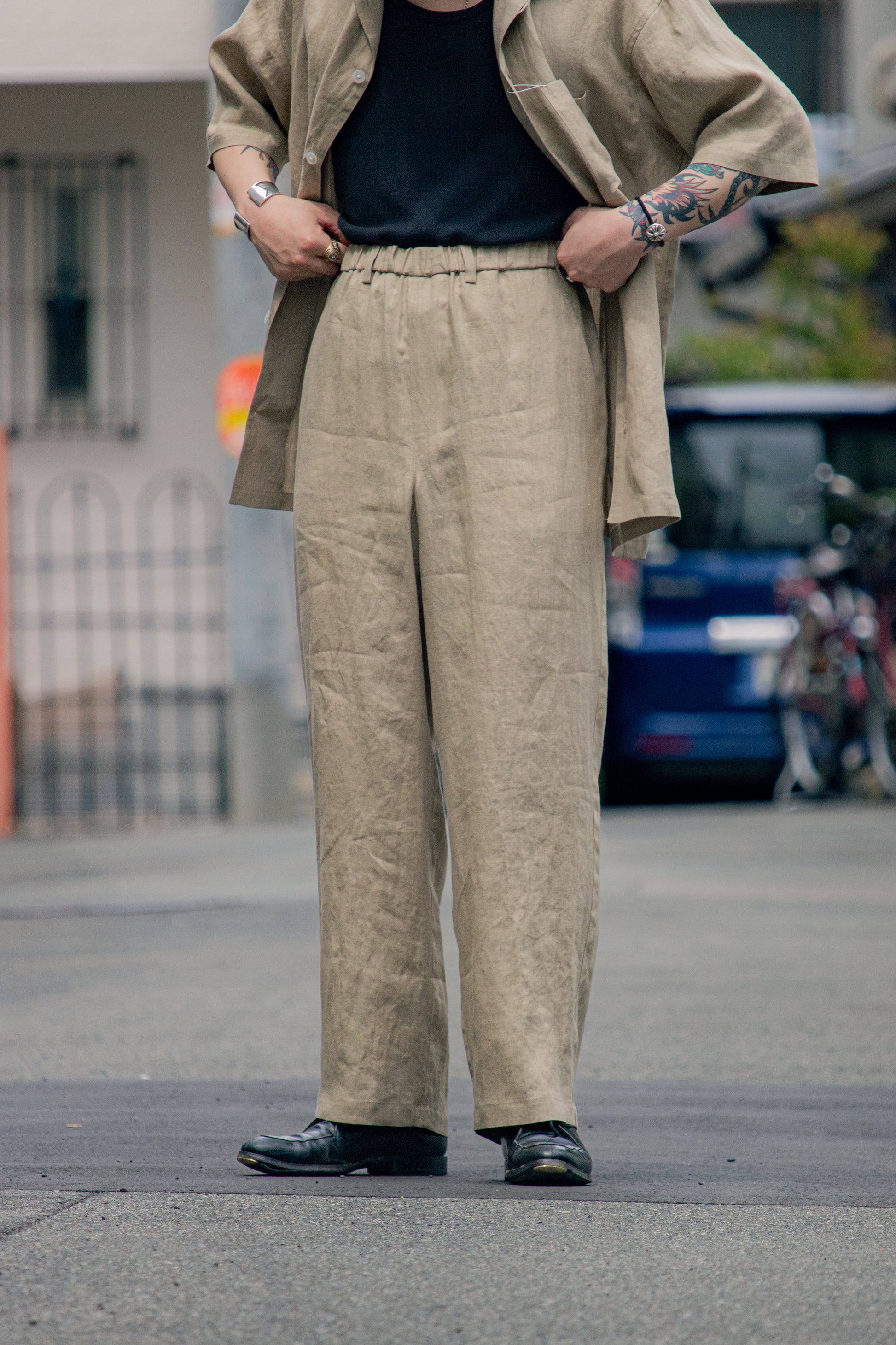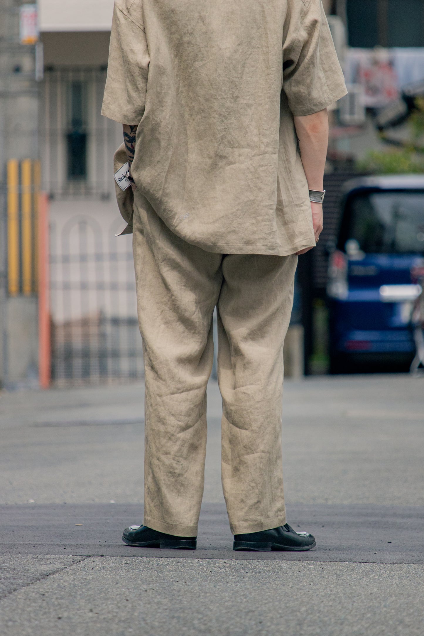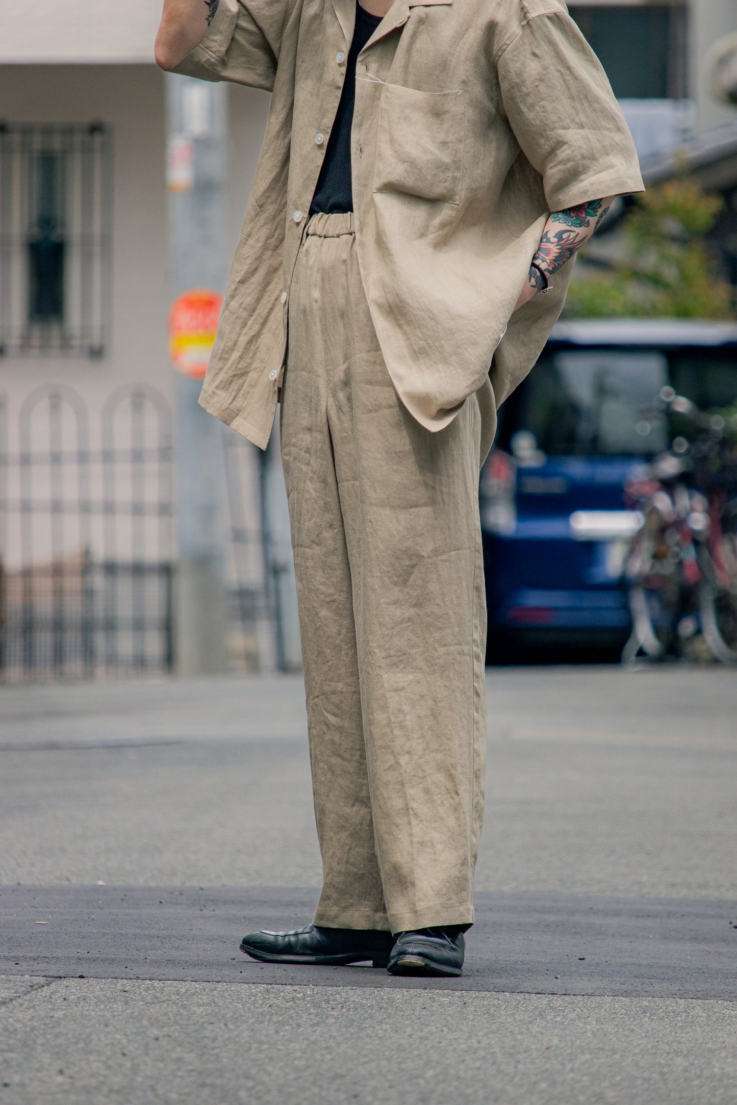 また綿などに比べ少ない水量でも育つため、環境配慮型の素材でもあり、その原料を60番手の繊細な糸にして織り上げ、加工で洗いざらし風のワッシャー感が出ています。