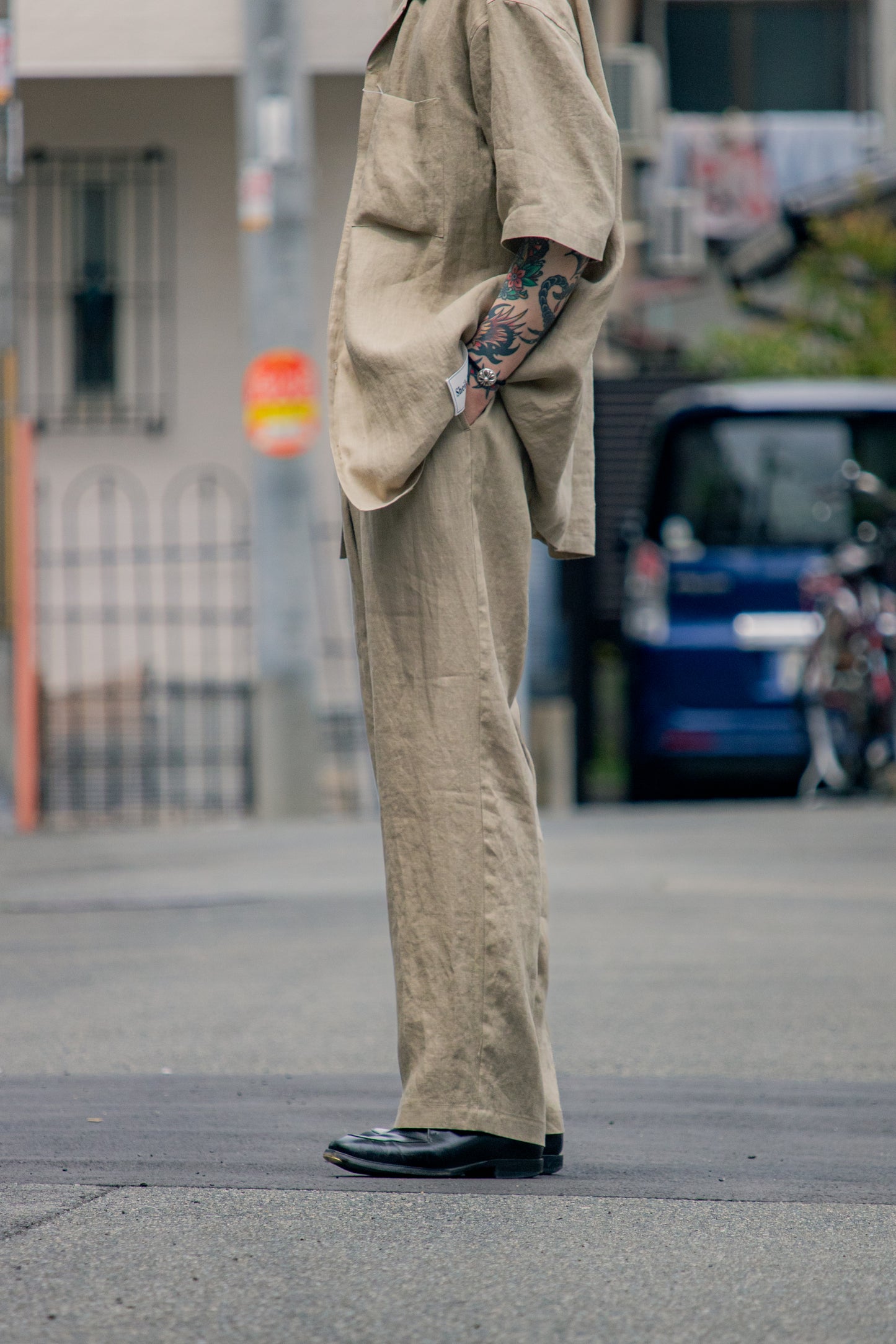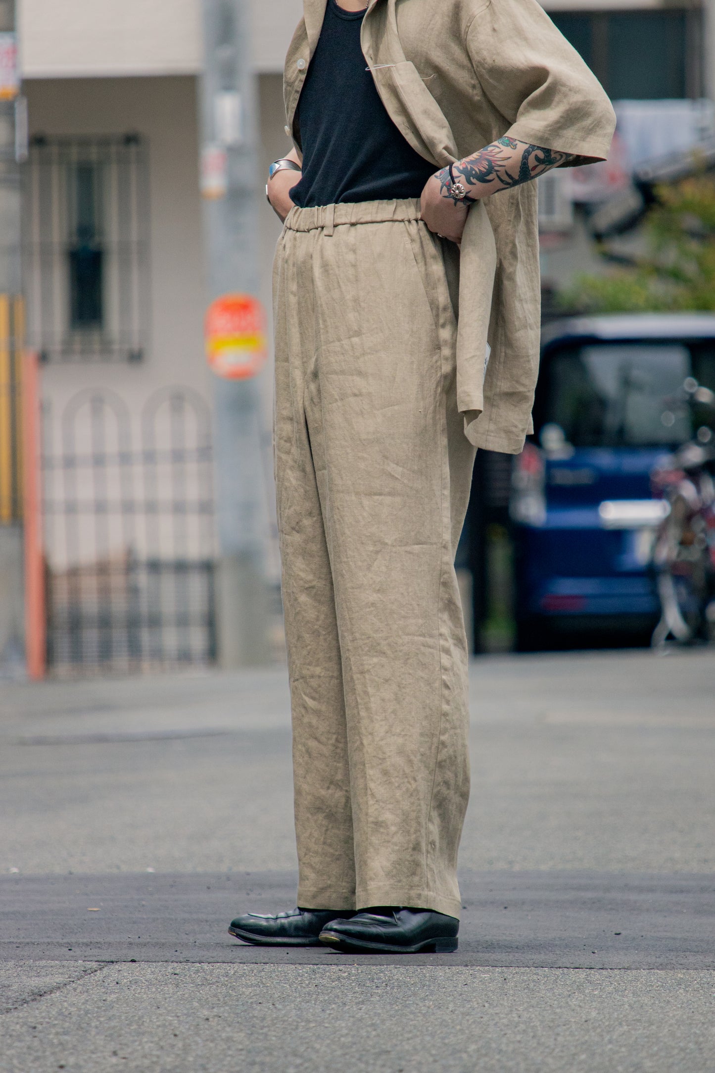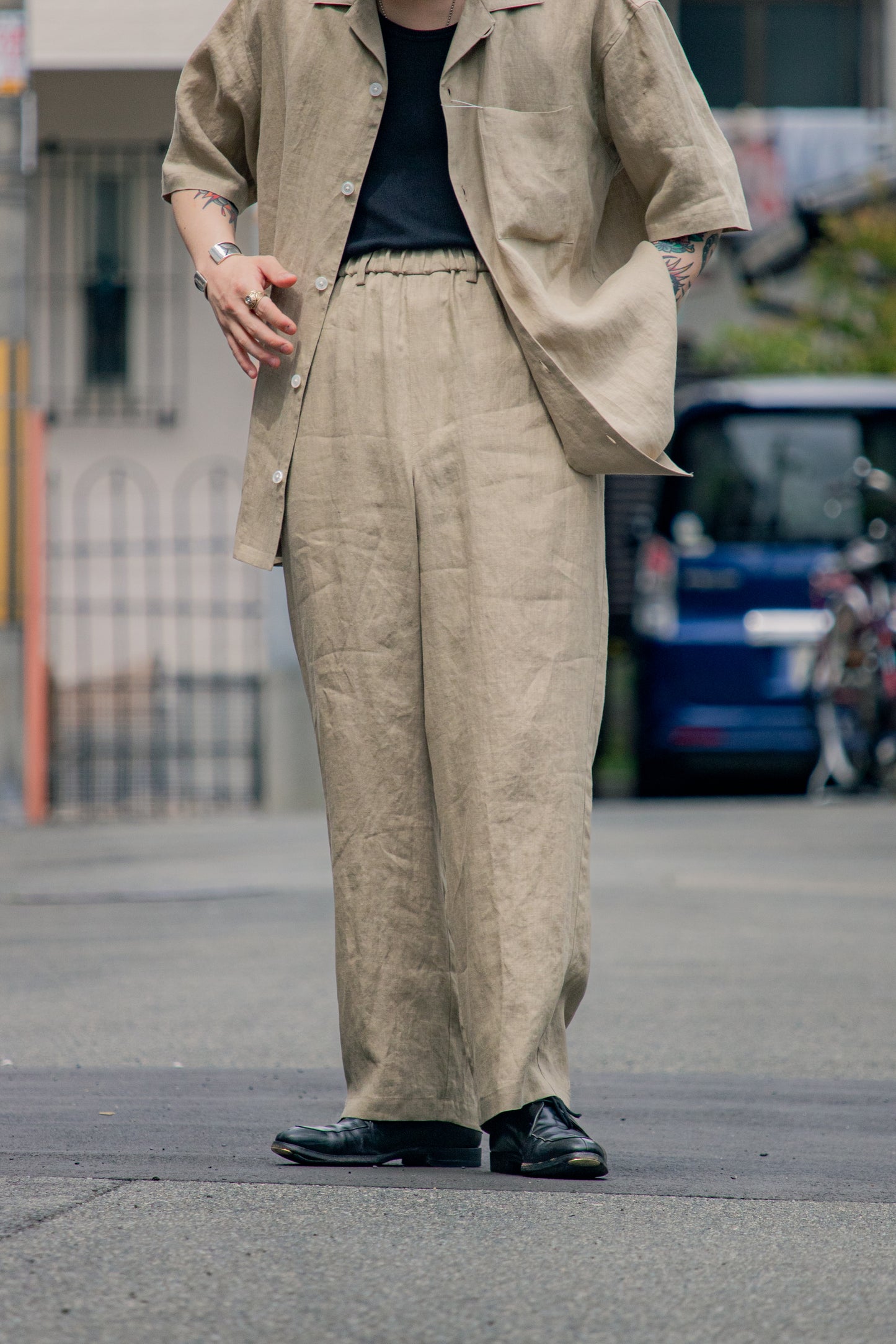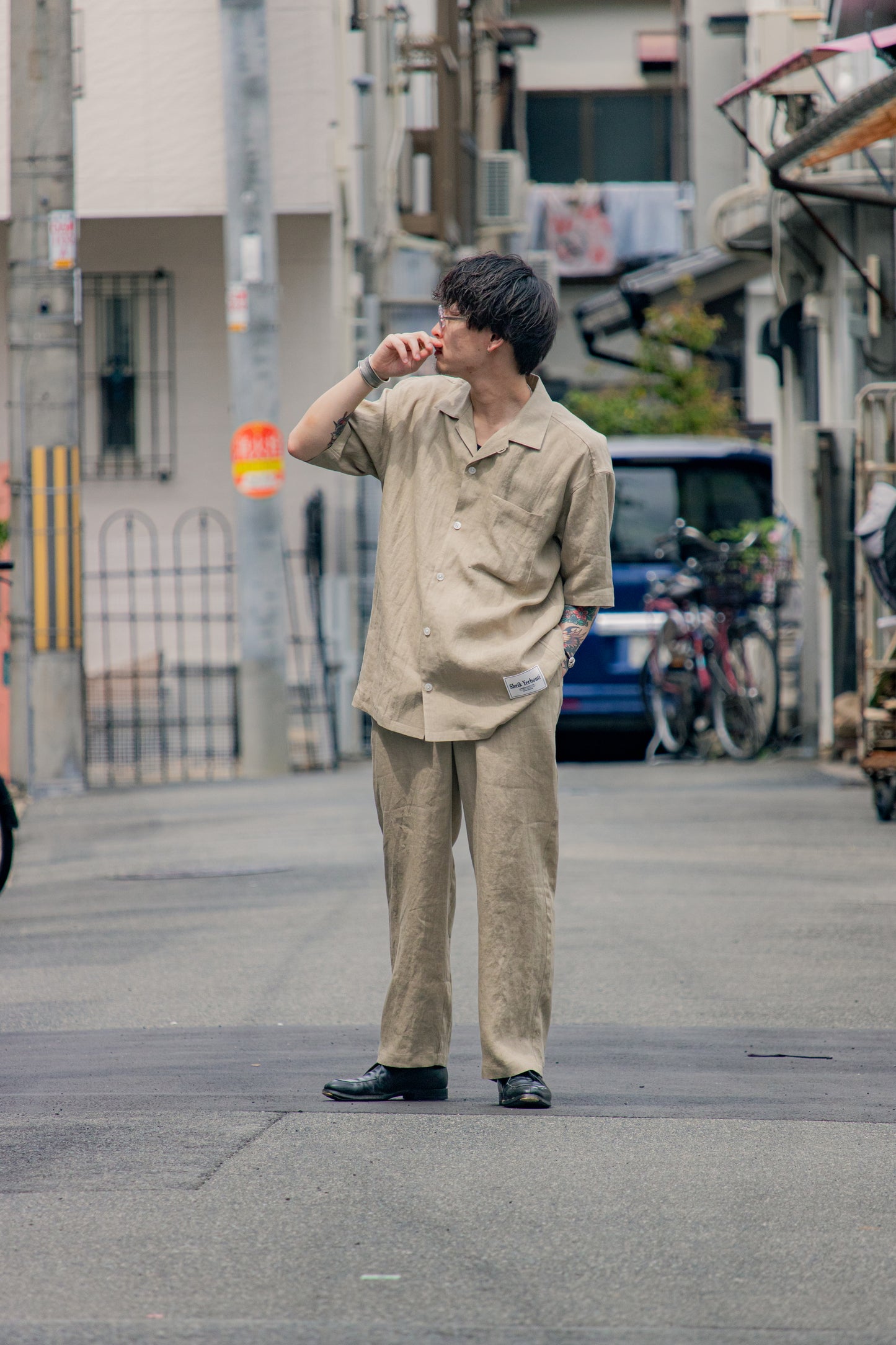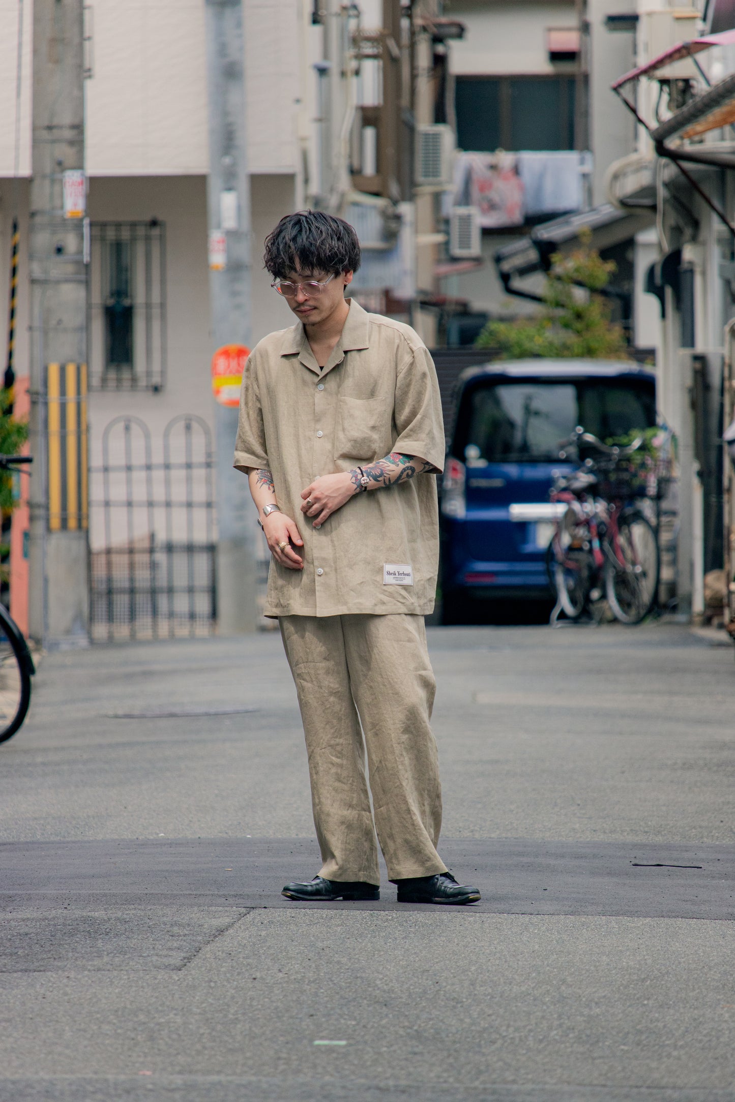 また綿などに比べ少ない水量でも育つため、環境配慮型の素材でもあり、その原料を60番手の繊細な糸にして織り上げ、加工で洗いざらし風のワッシャー感が出ています。