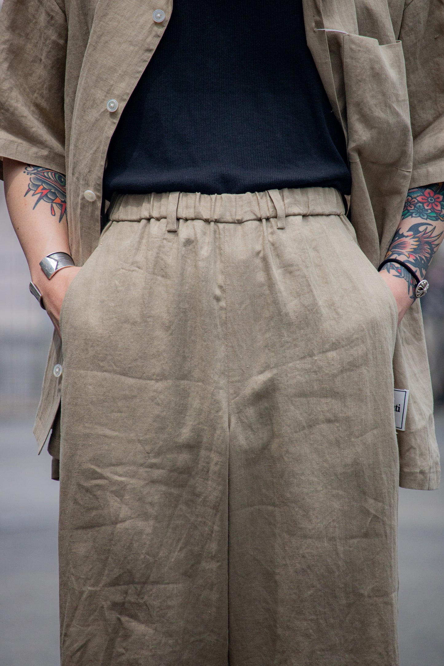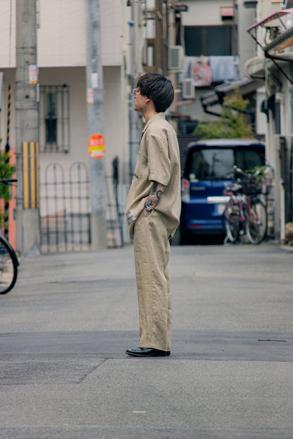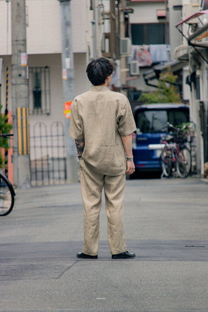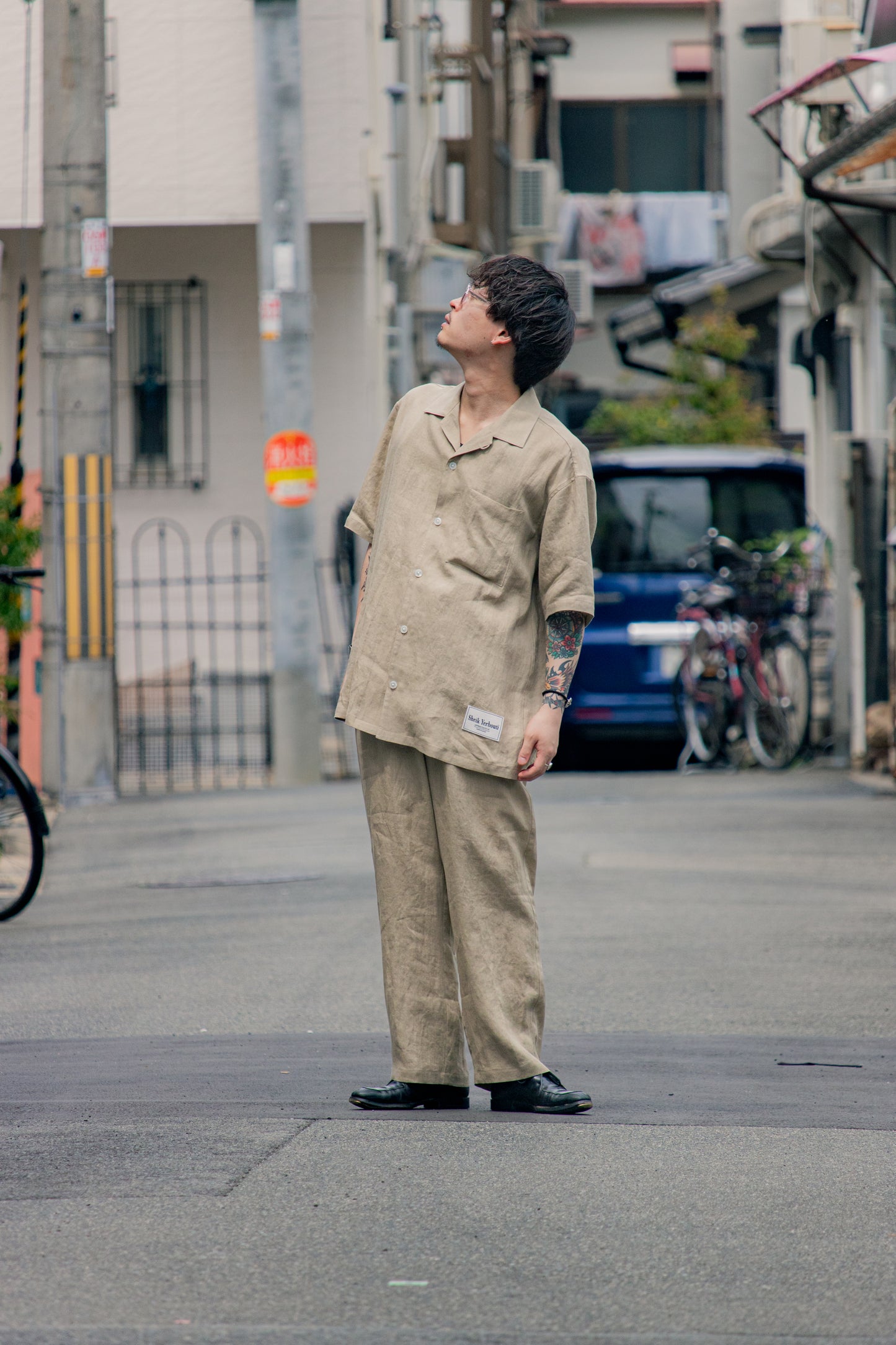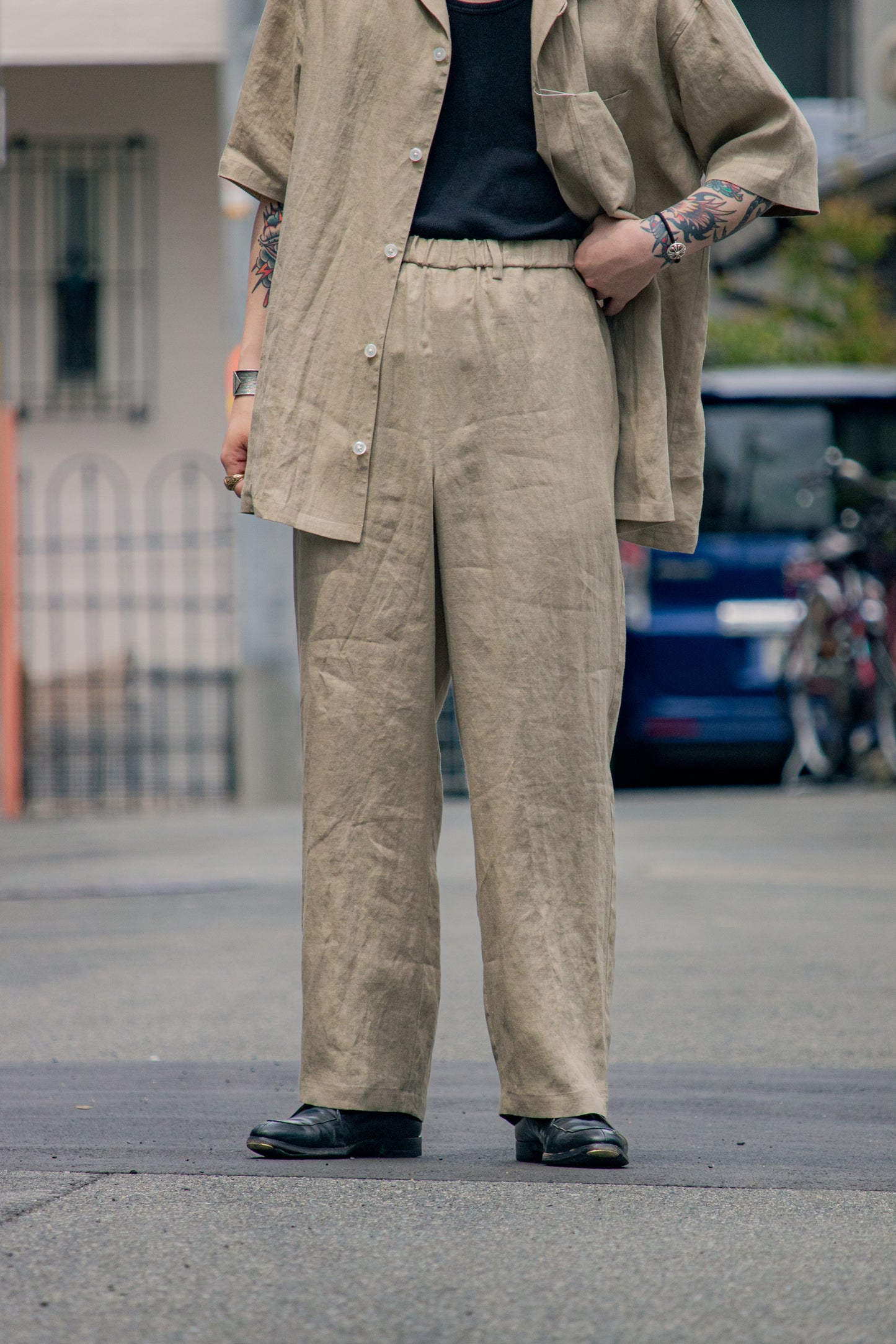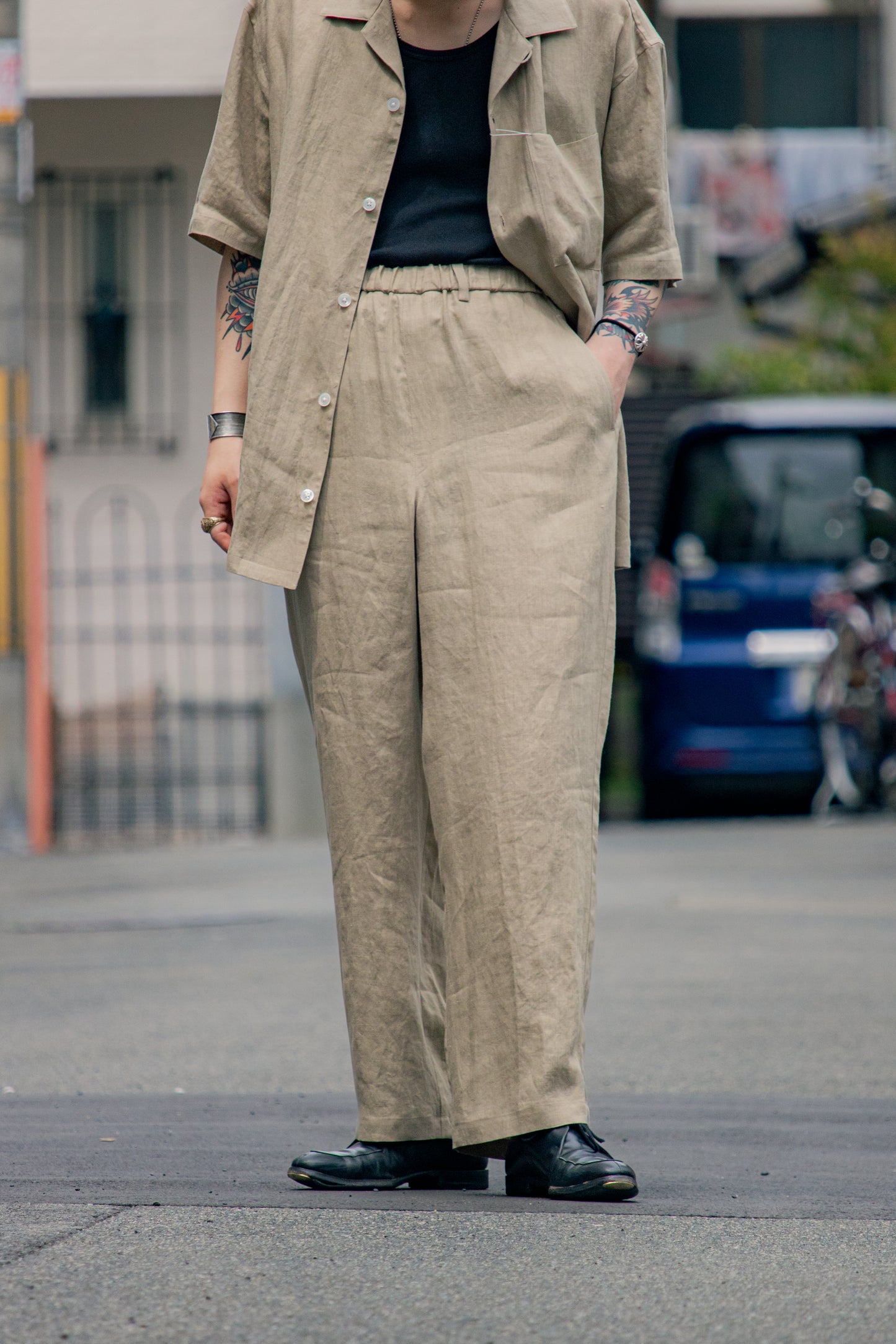 また綿などに比べ少ない水量でも育つため、環境配慮型の素材でもあり、その原料を60番手の繊細な糸にして織り上げ、加工で洗いざらし風のワッシャー感が出ています。