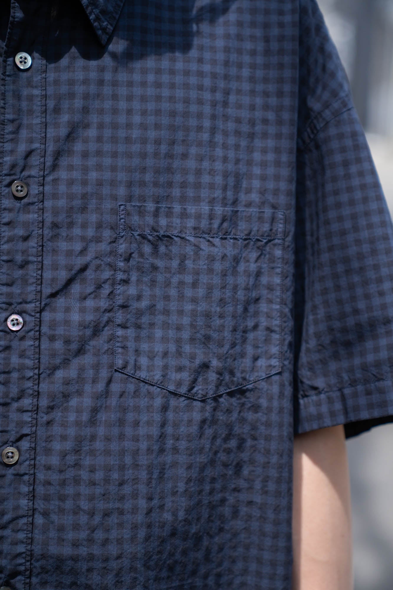 染色されていない生地の生地で製品の縫製を終えた後、染色と洗濯作業をする ガーメントダイイング技法で完成したシャツです。
