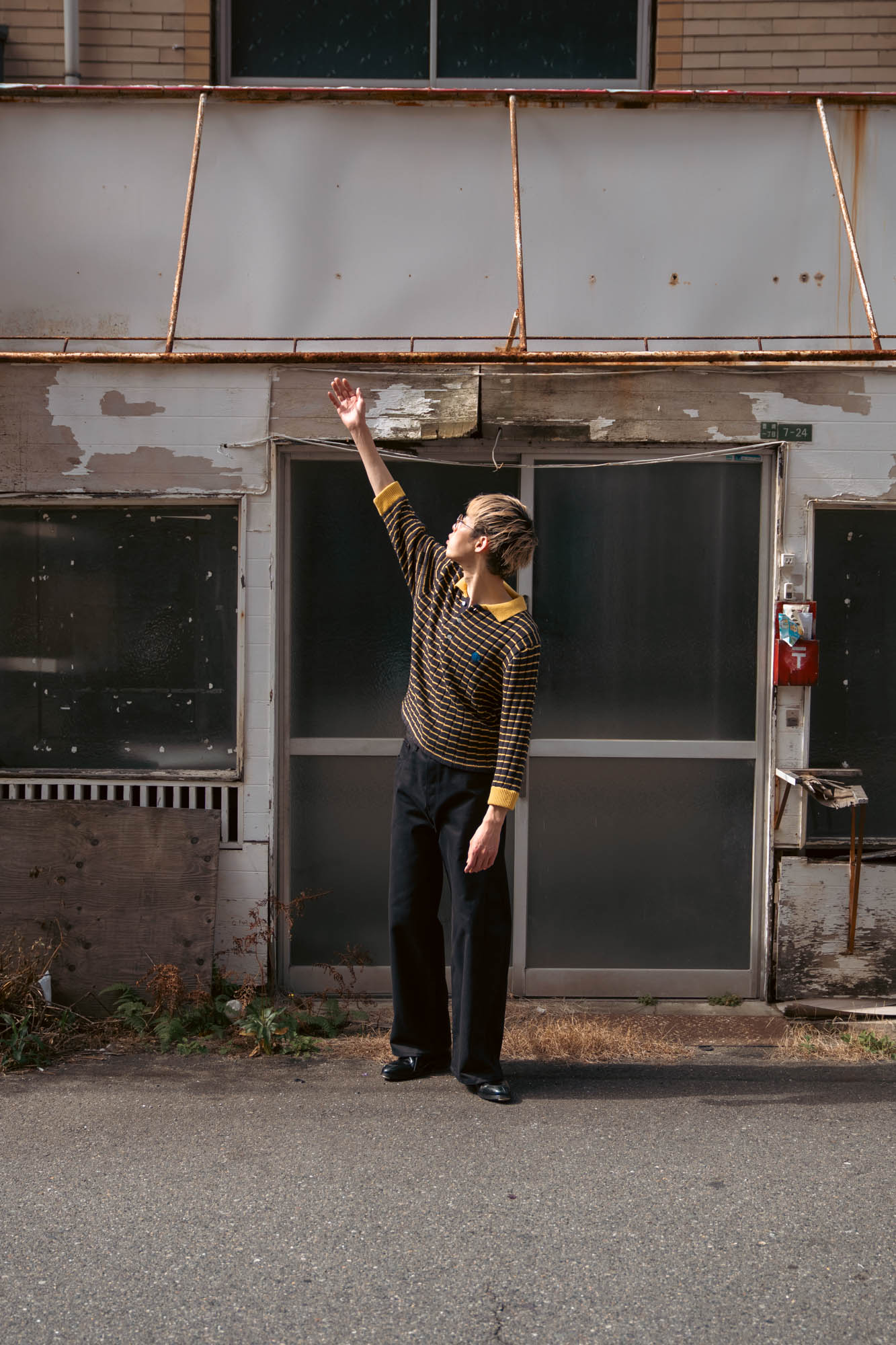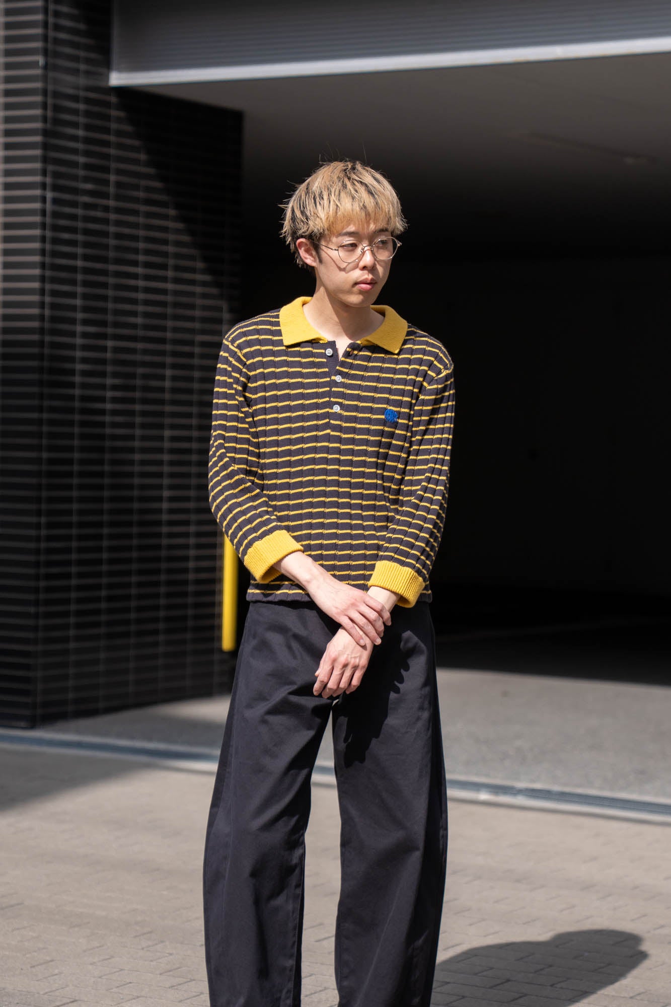 リブ編みのマルチボーダー柄のニットポロシャツ。