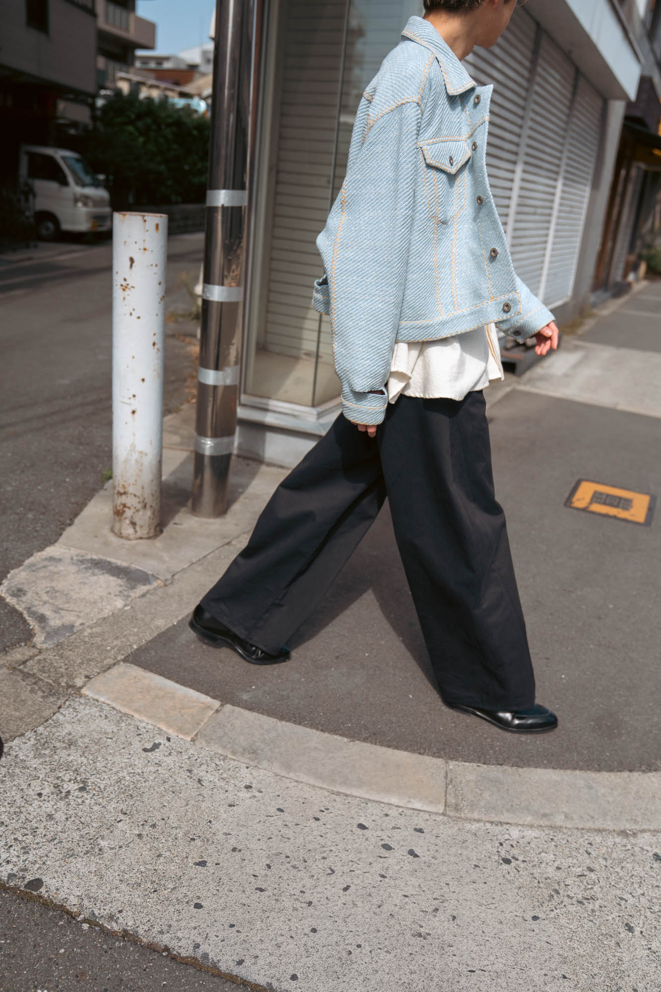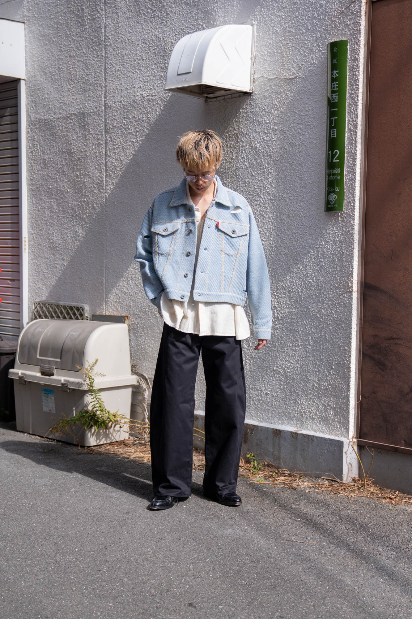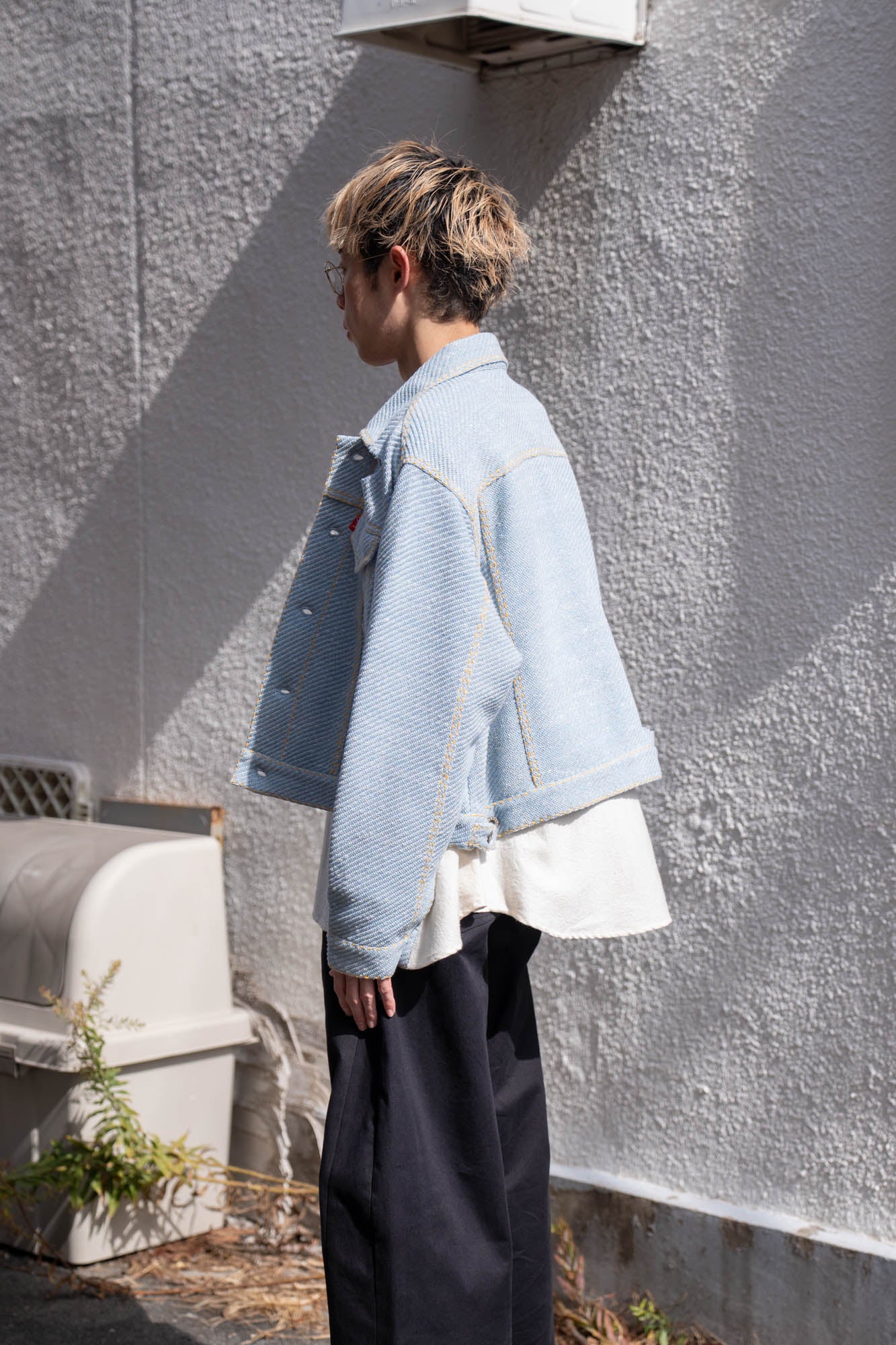 リーバイス3rd型ジャケットをニットで再構築しました。5種以上の糸を使い、綾織り風の質感を特殊な編み機で表現。