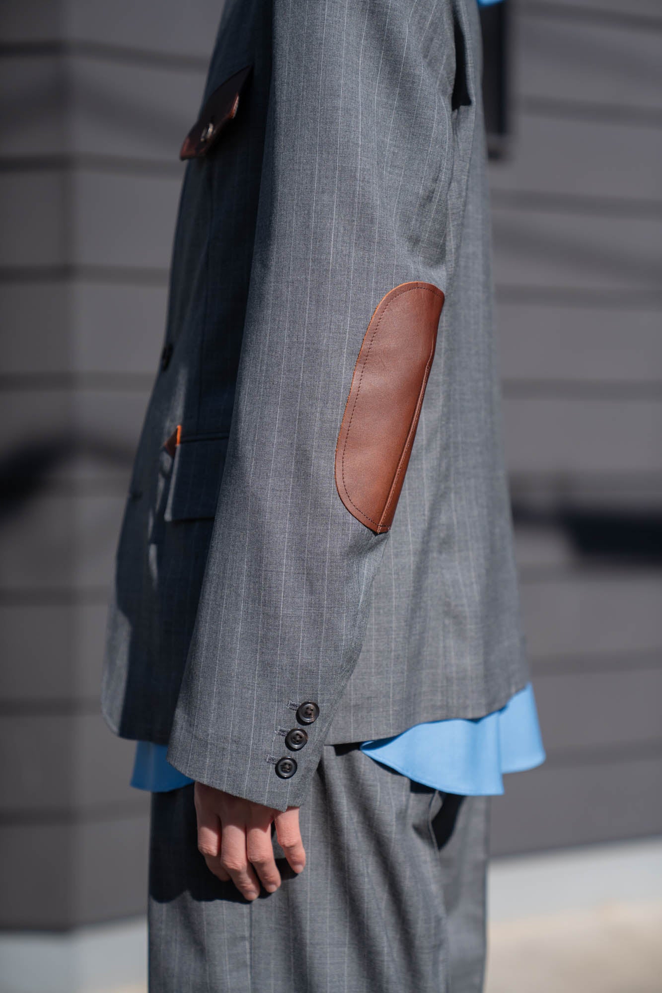 クラシックなテーラードをベースにしながらも、異素材のコントラストによって独自の存在感を放つ一着に仕上がっています。