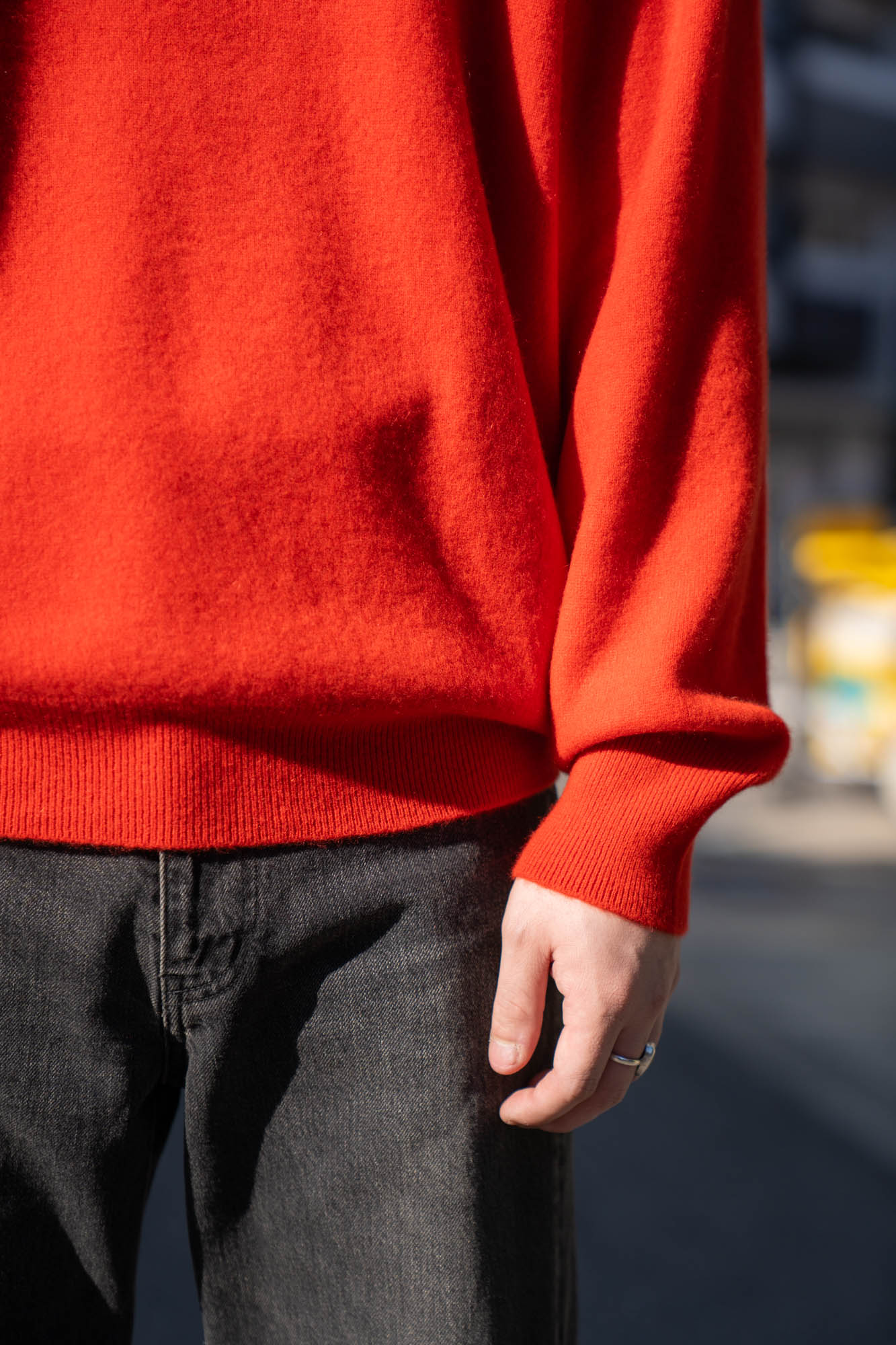 緩めに編んで加工で原料の良さが際立つようふんわりとふくらみを出し、 カシミヤ特有の上質なやわらかい着心地、自然な光沢感のある美しい編地が特徴。