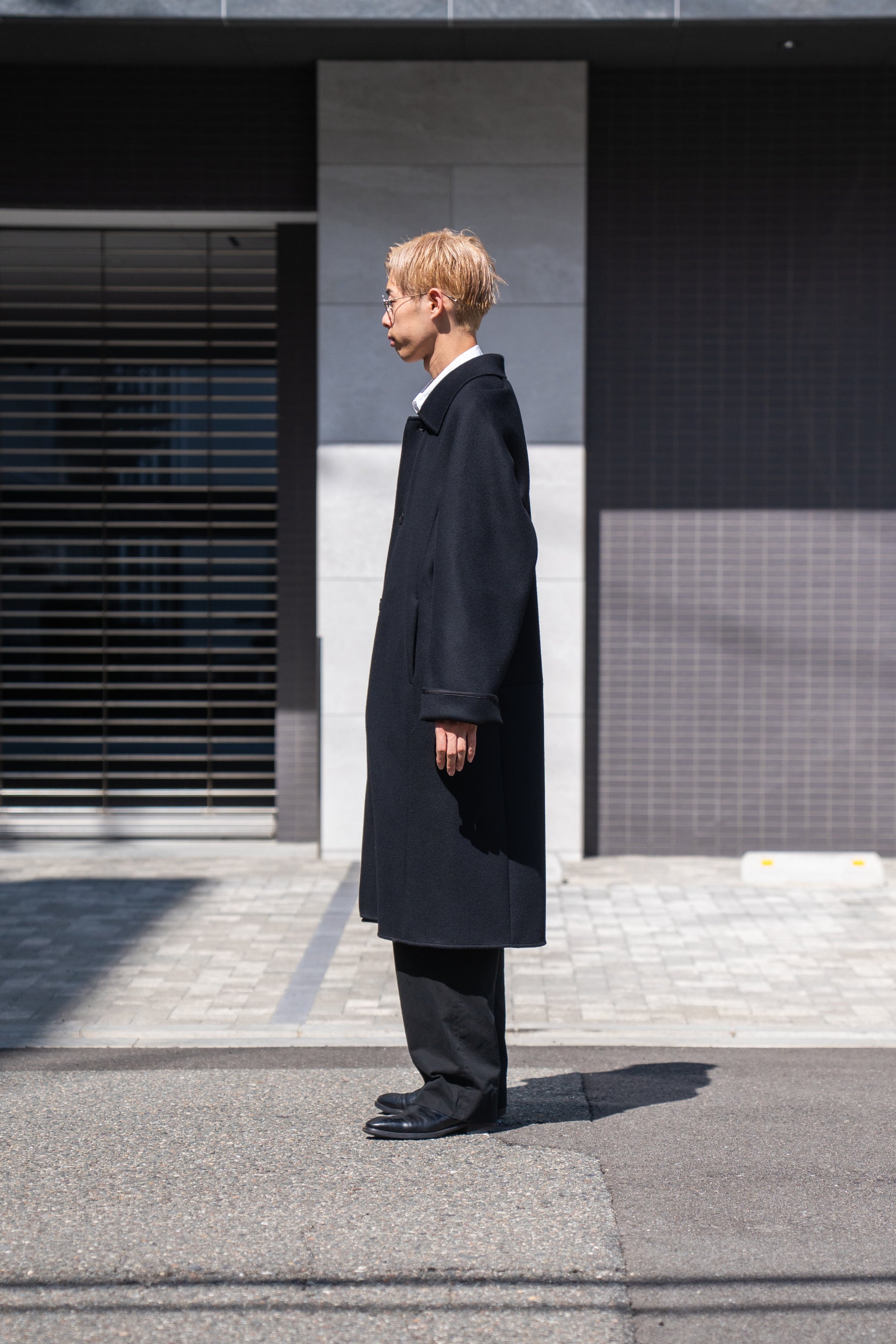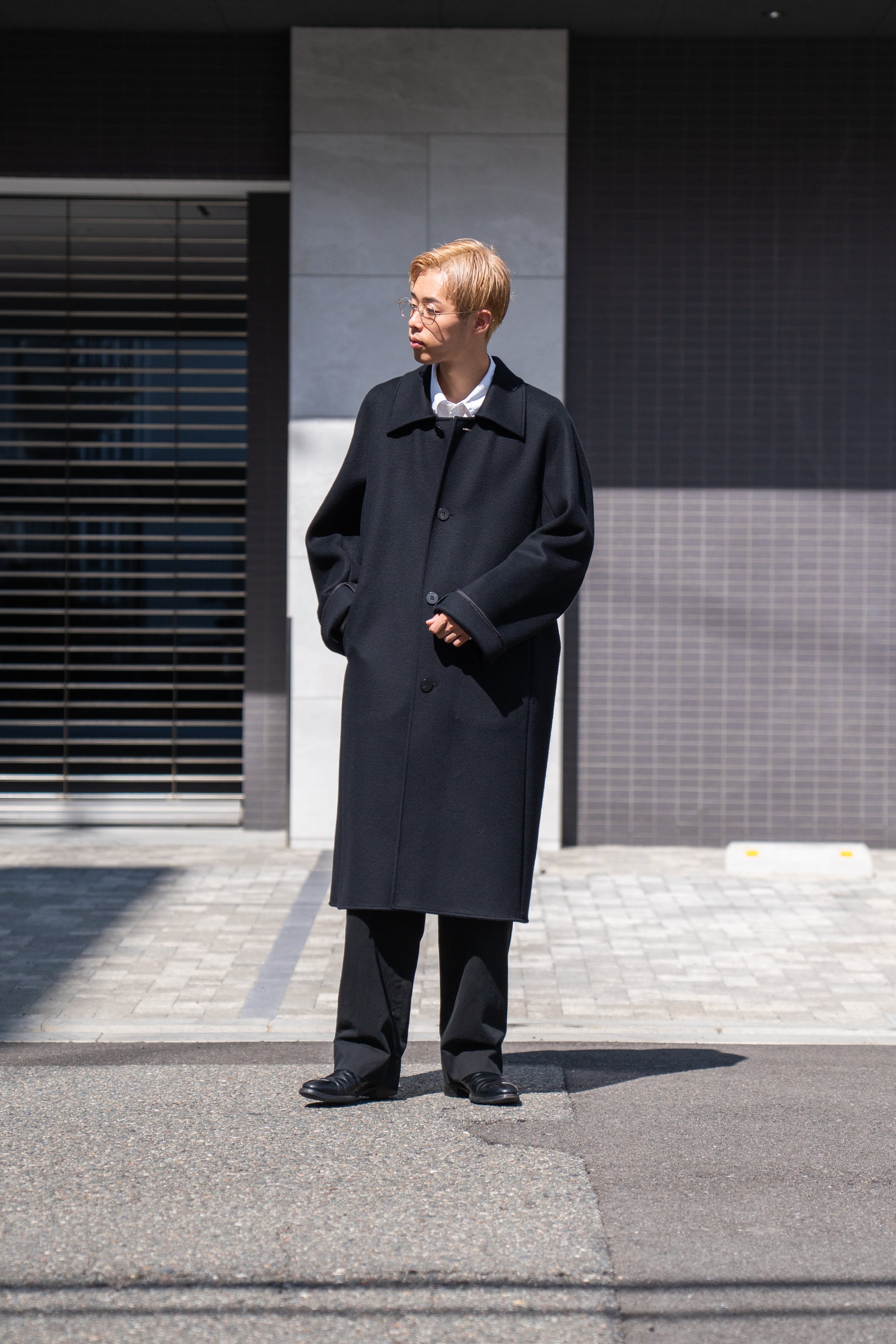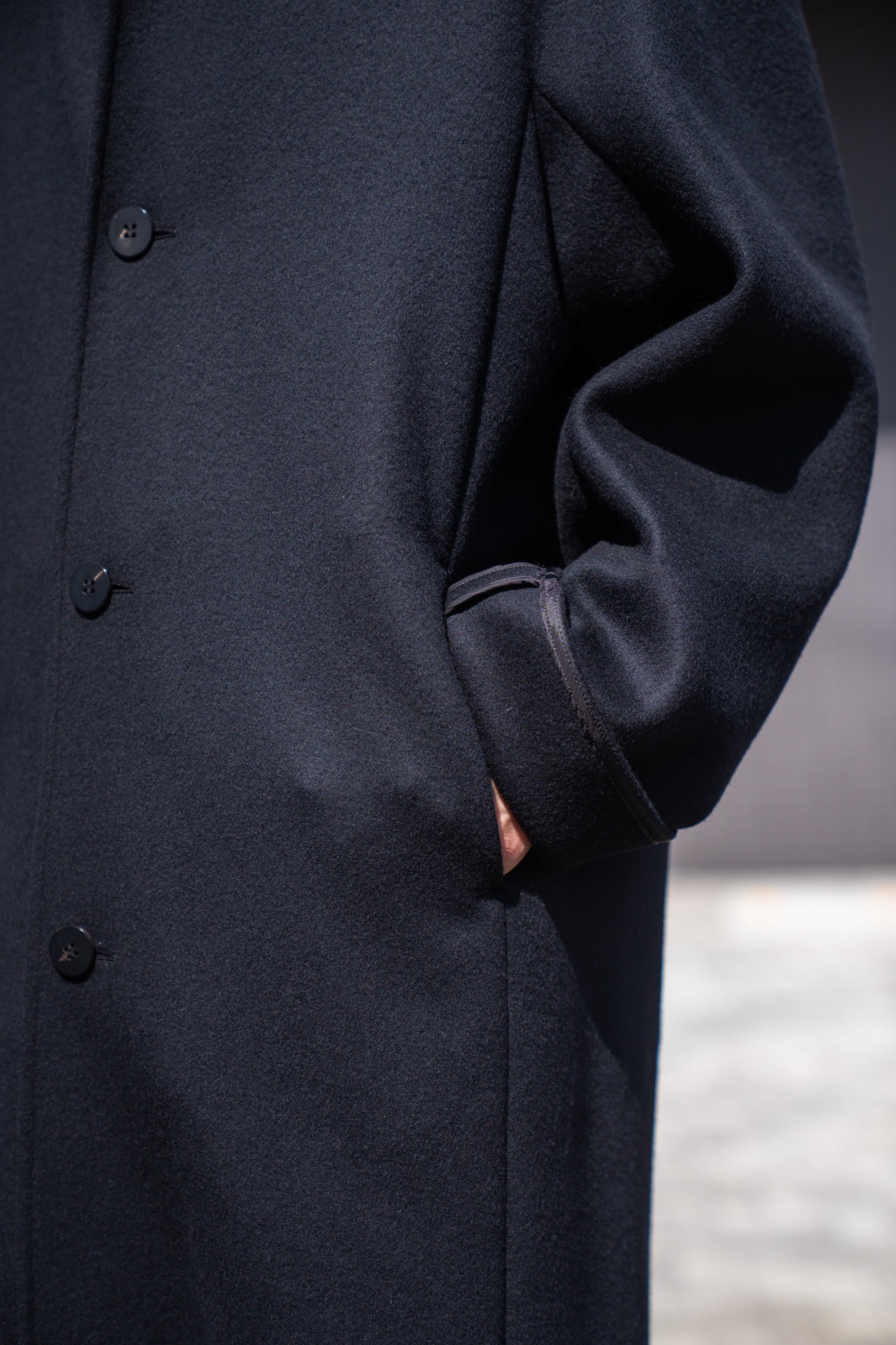 滑らかなビーバー素材を使用した、ステンカラータイプのオーバーコート。