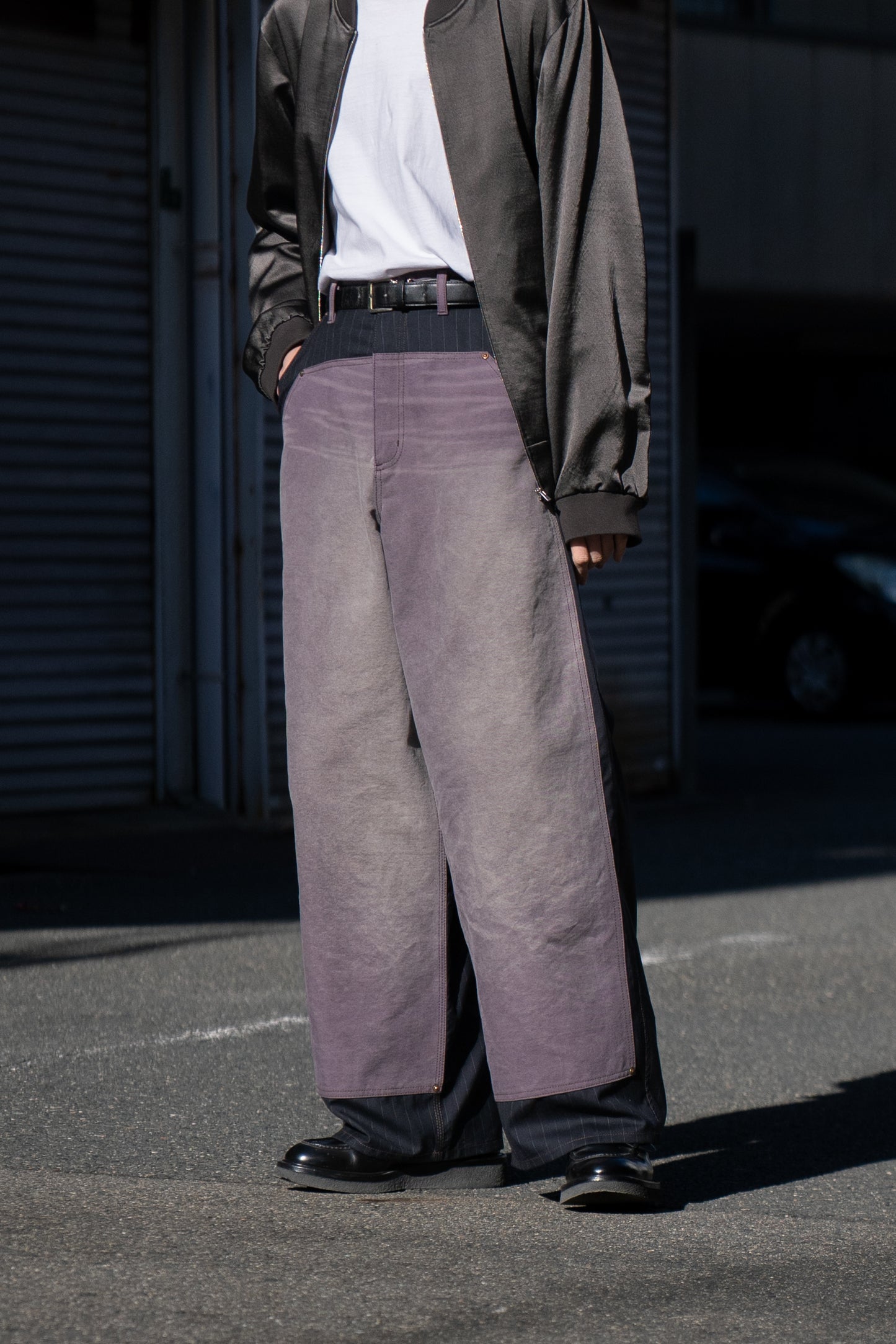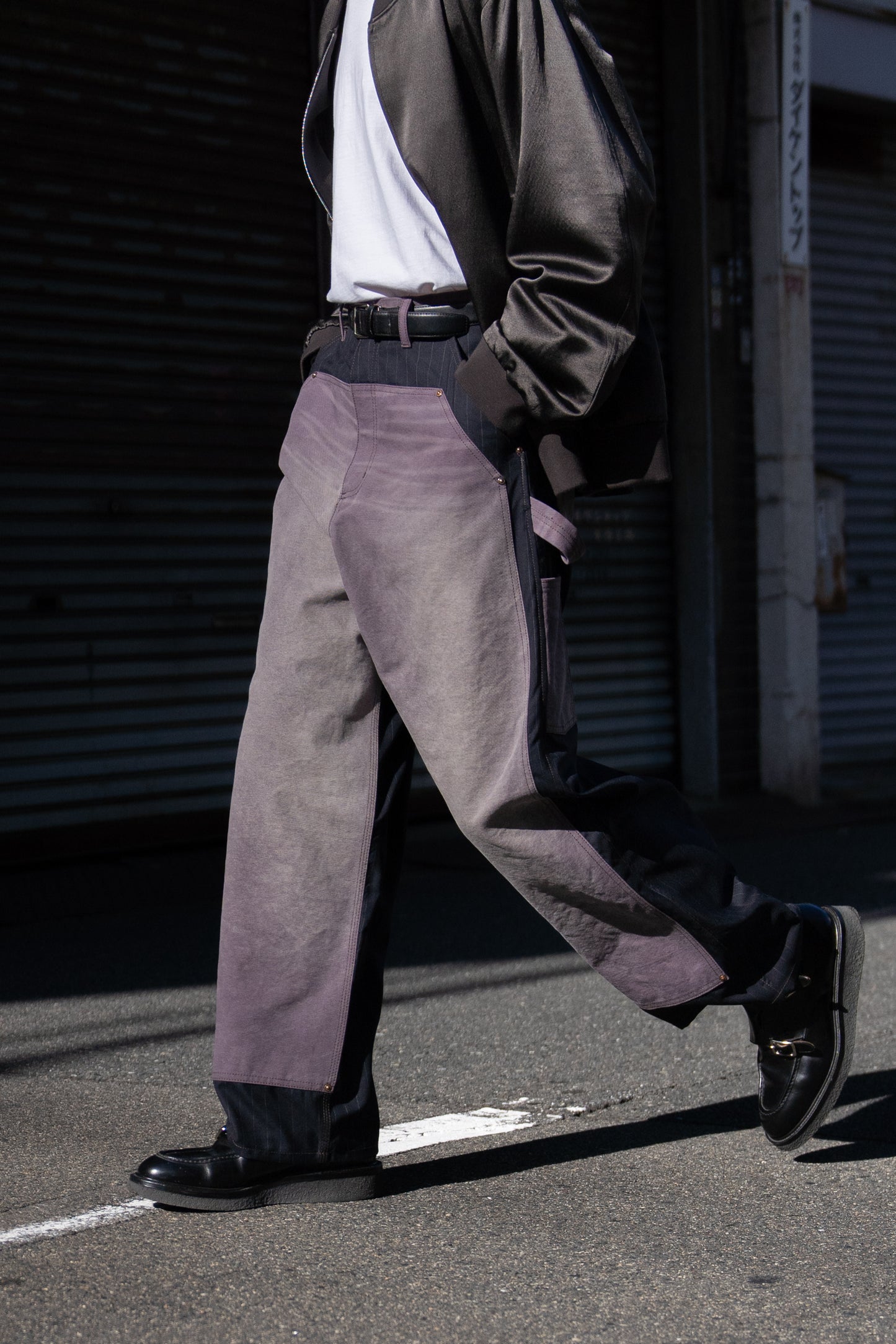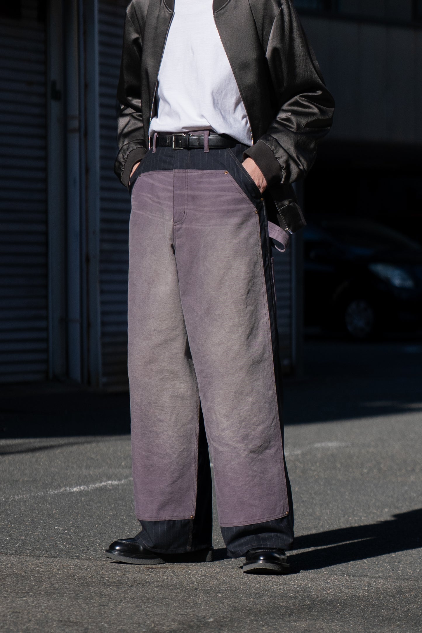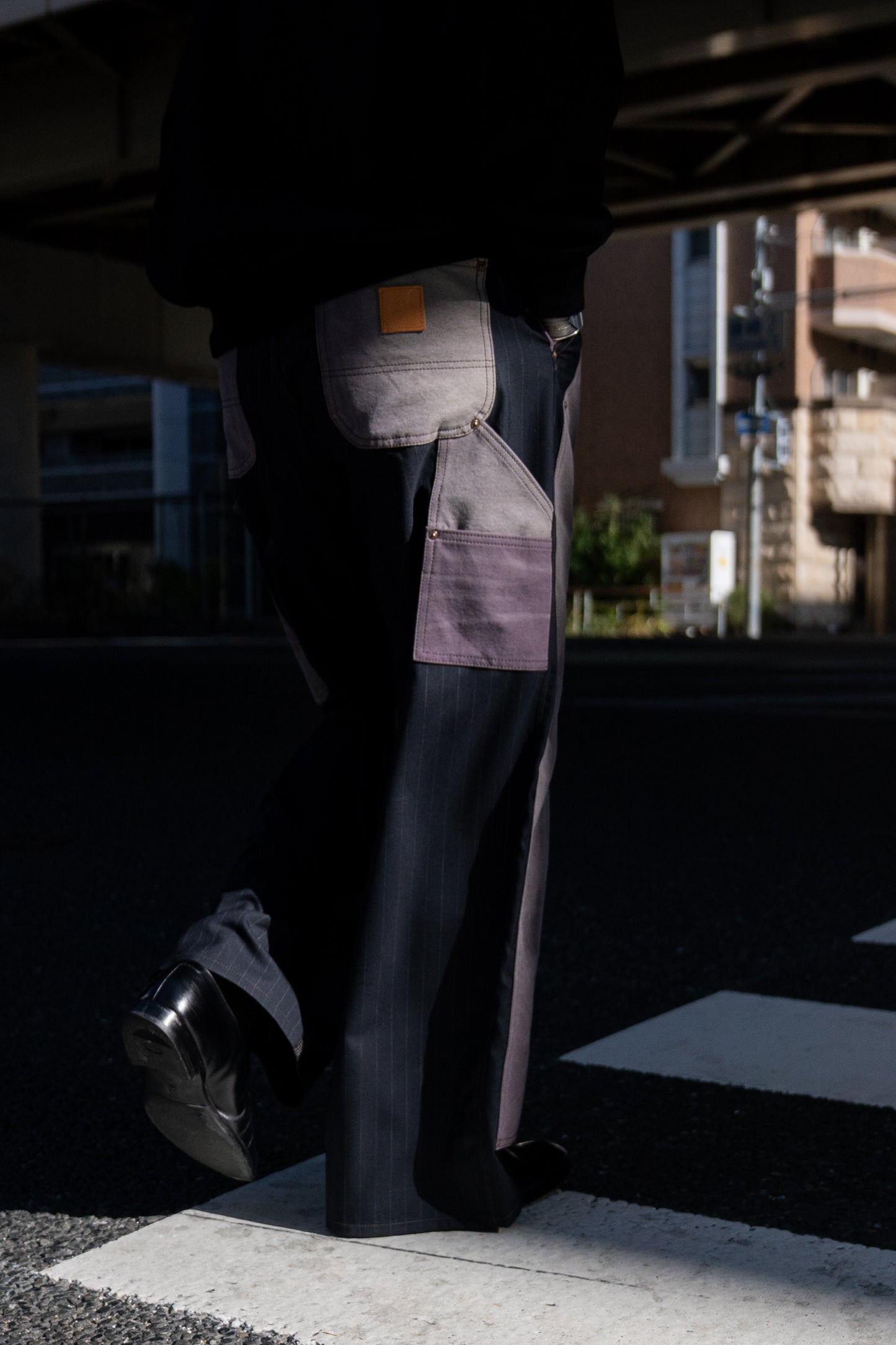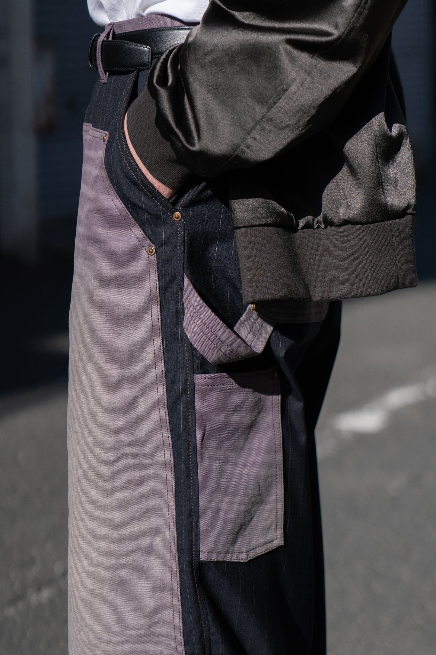 ヴィンテージの加工を施した前身頃の生地に対してペインターパンツ形のカッティングでストライプウールを組み合わせました。