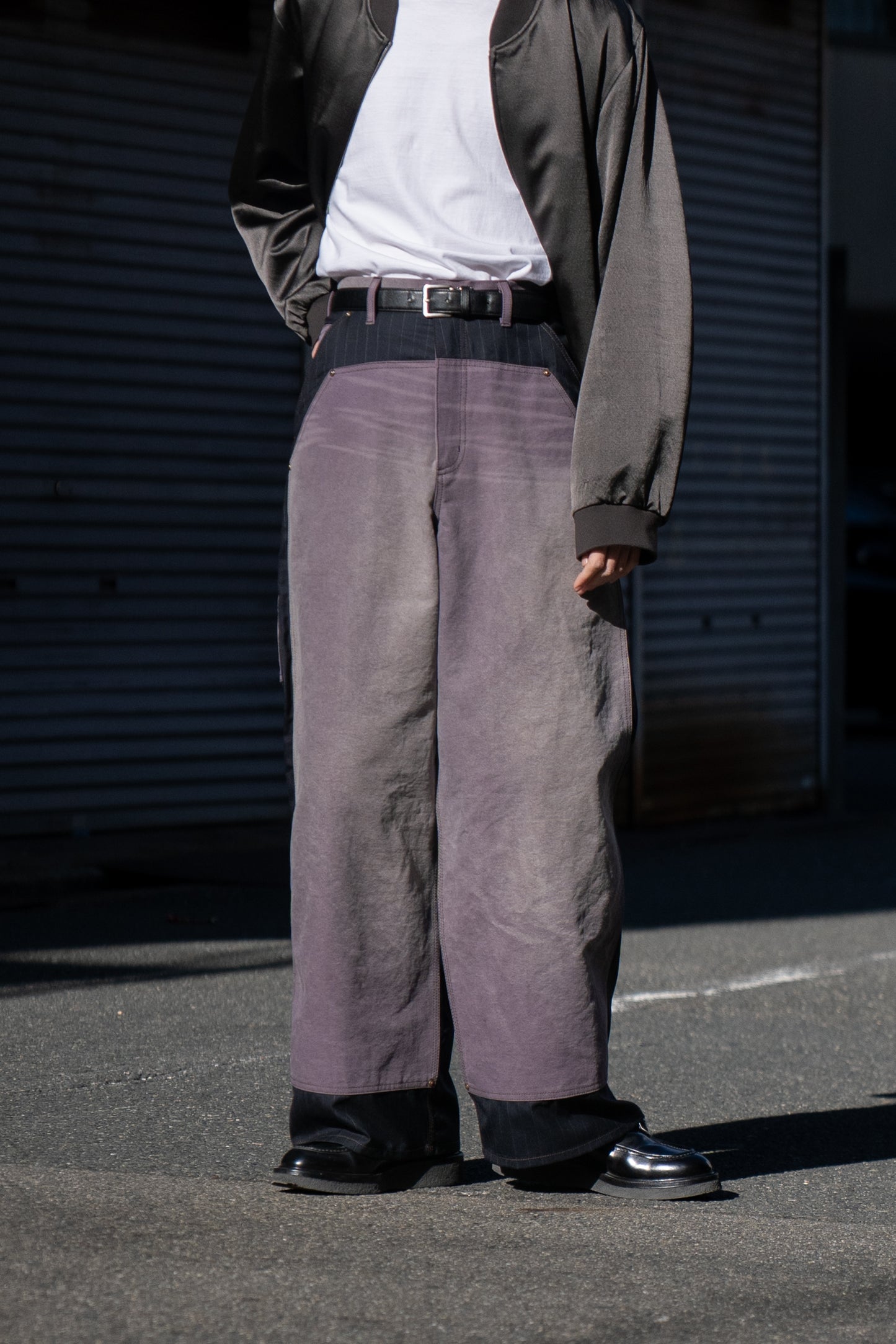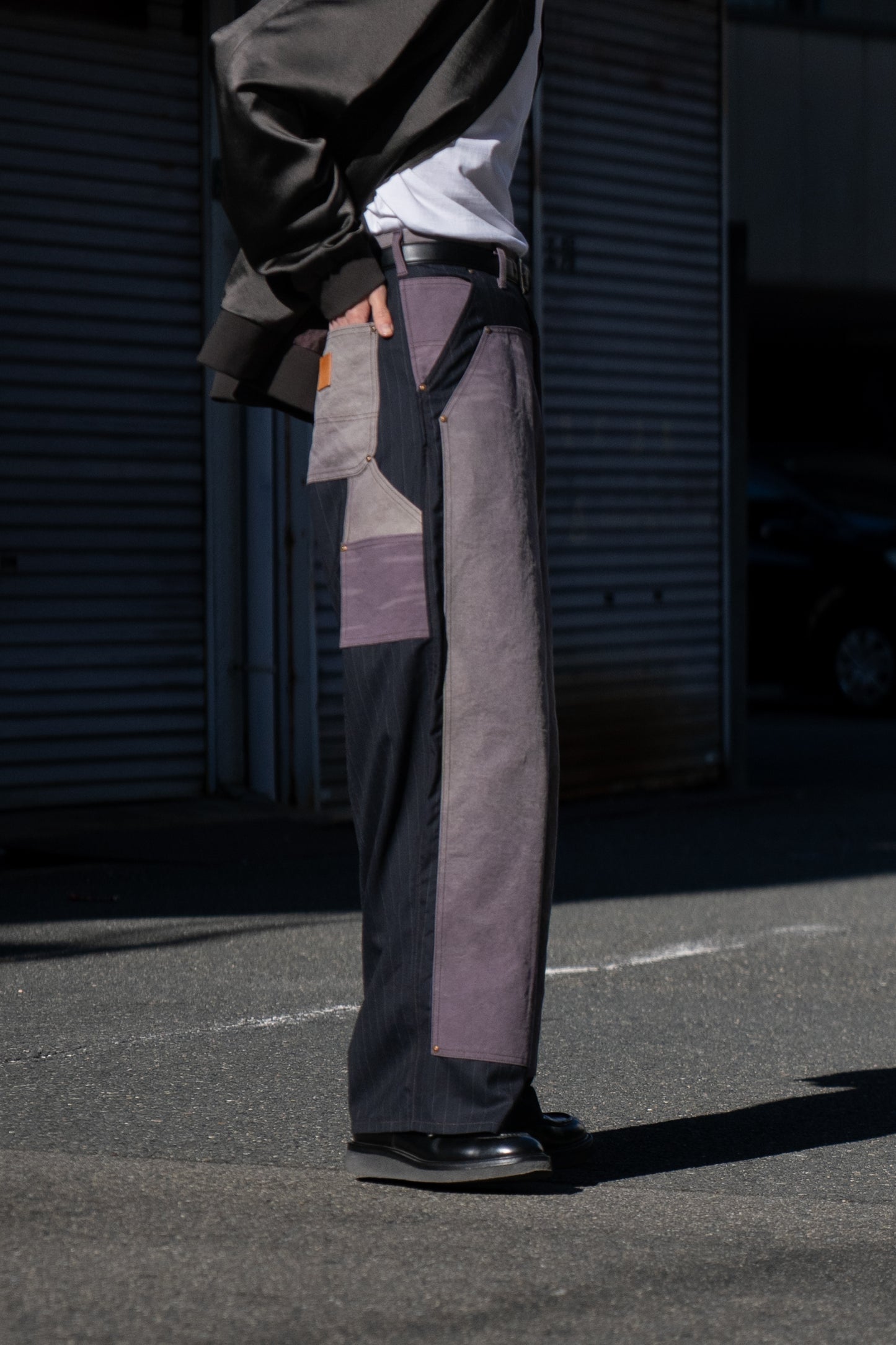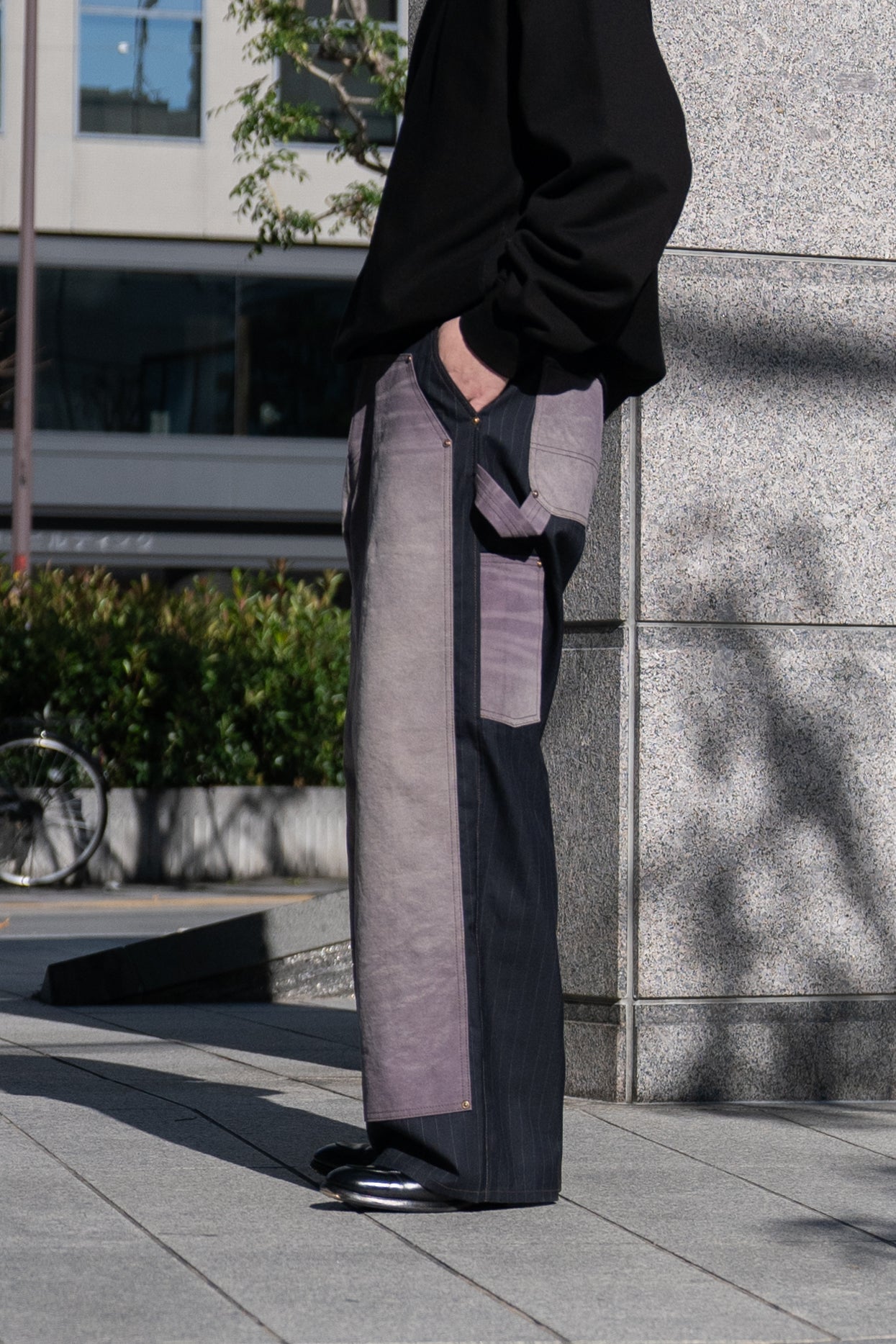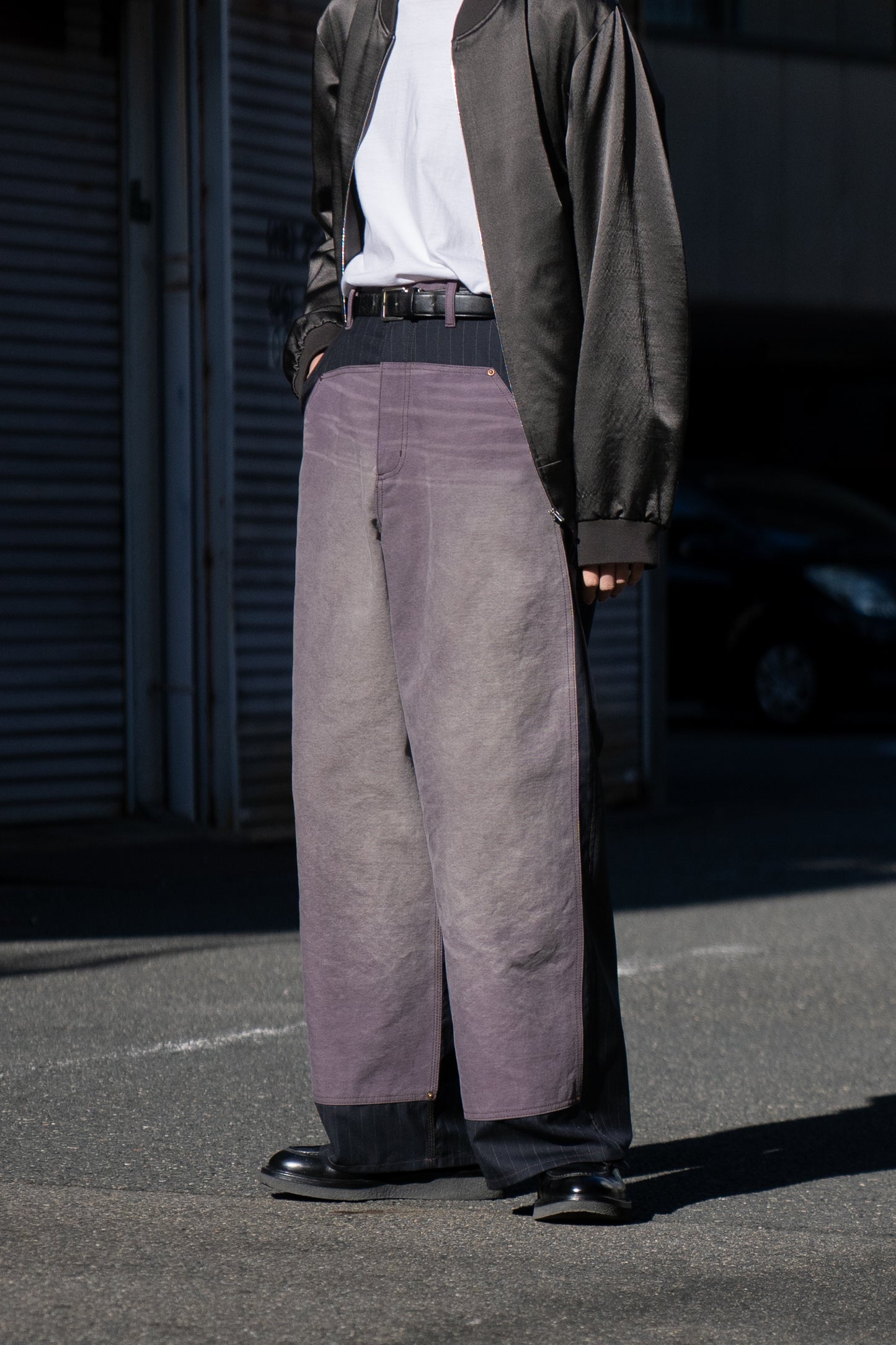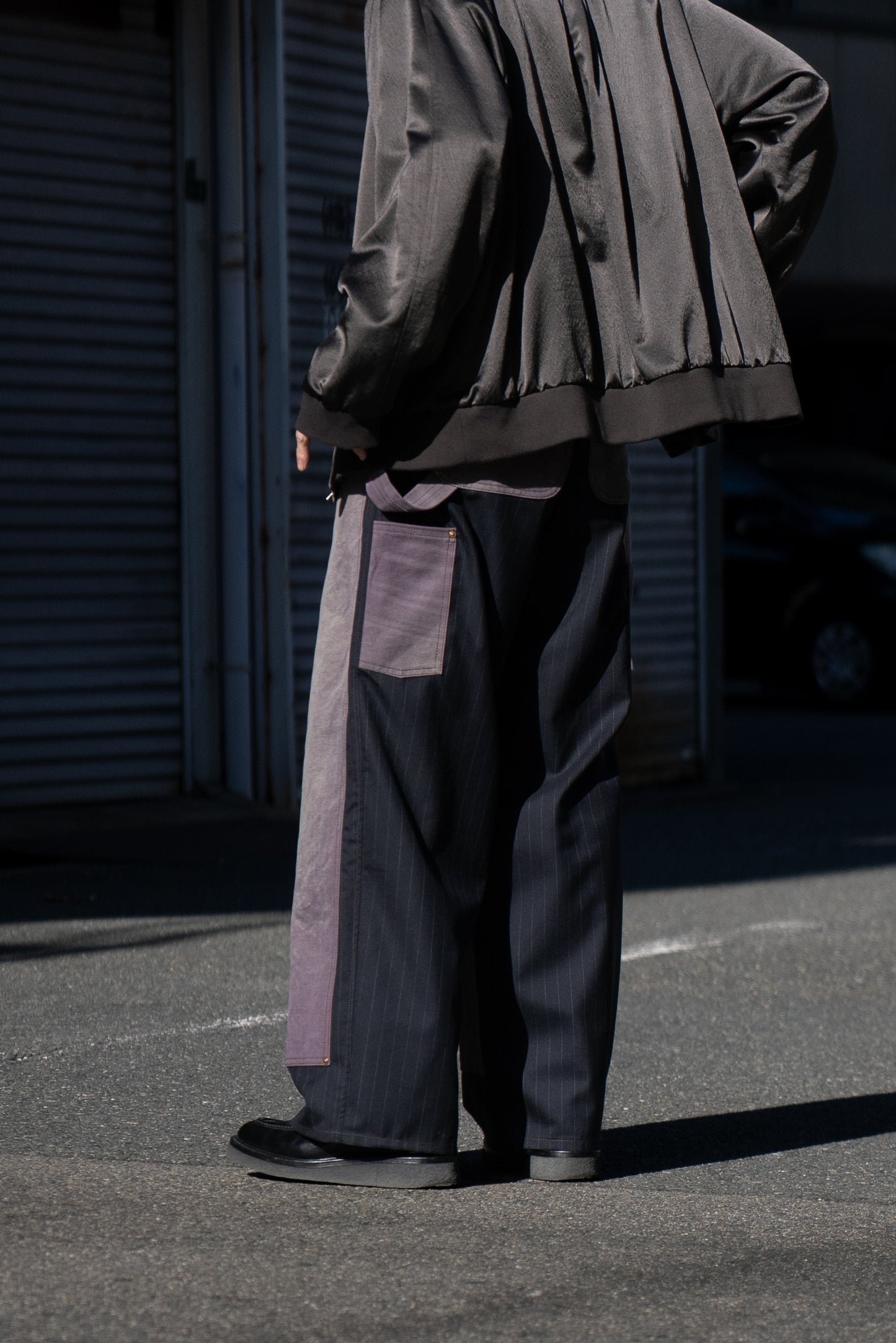 ヴィンテージの加工を施した前身頃の生地に対してペインターパンツ形のカッティングでストライプウールを組み合わせました。