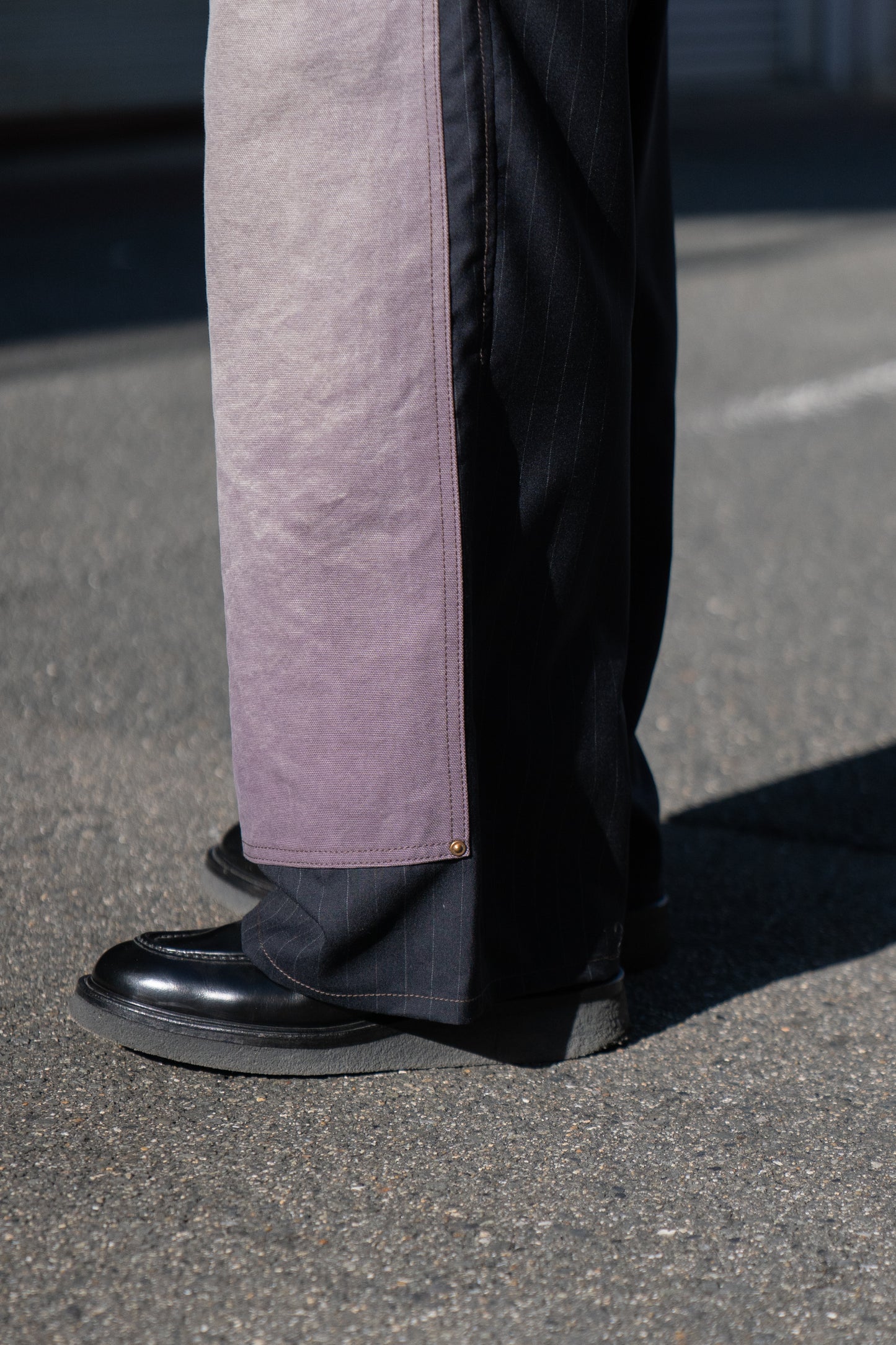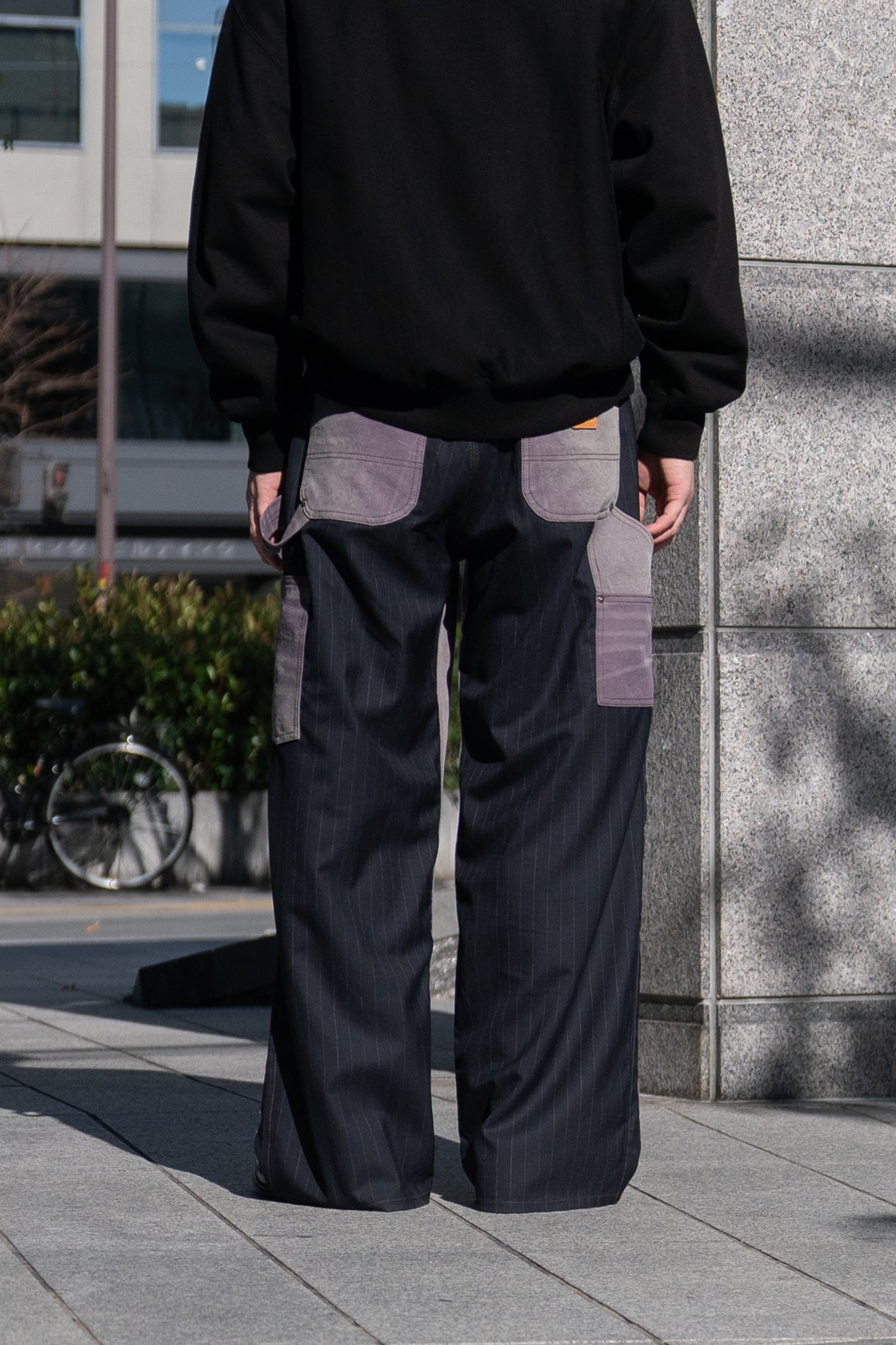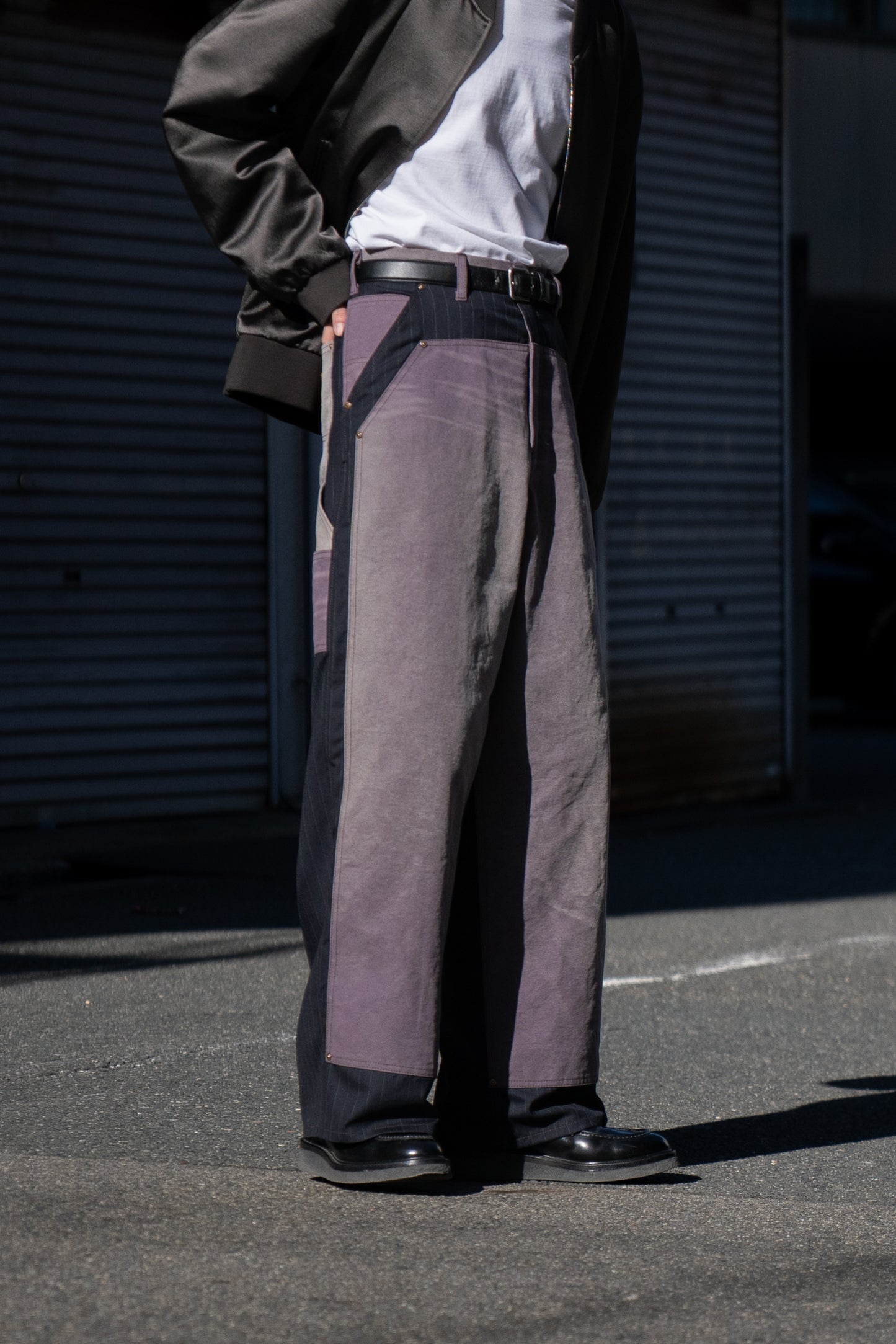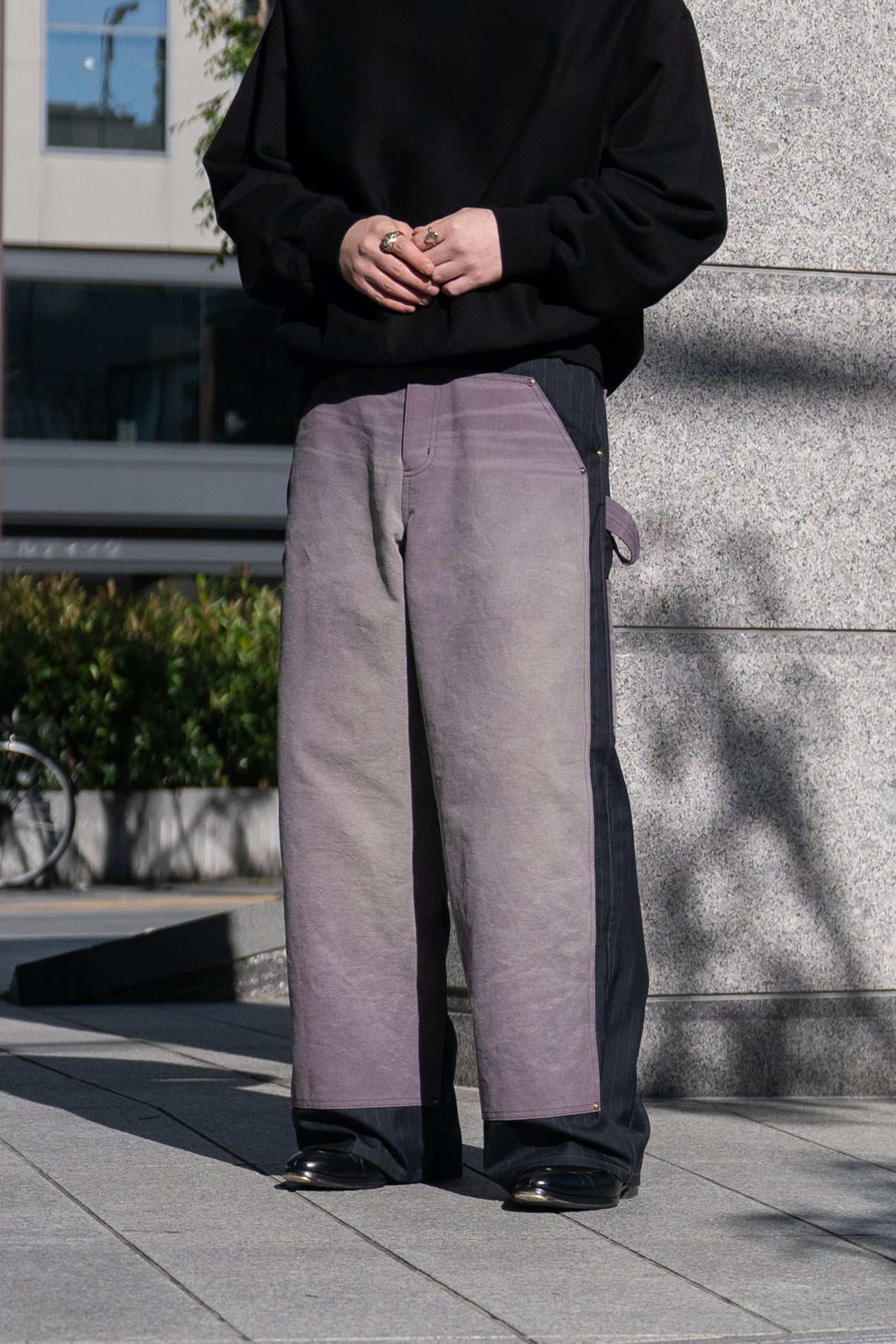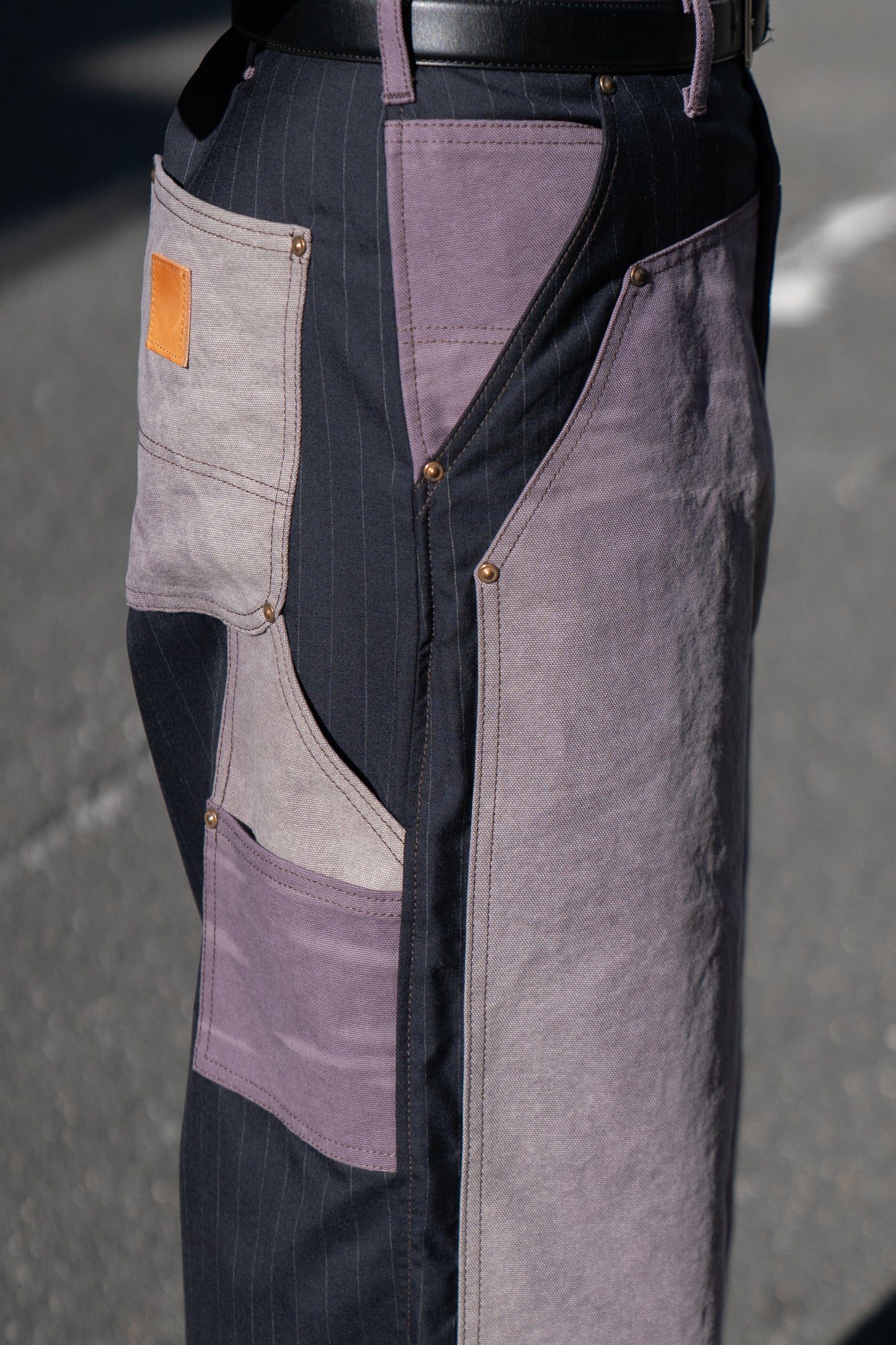 ヴィンテージの加工を施した前身頃の生地に対してペインターパンツ形のカッティングでストライプウールを組み合わせました。