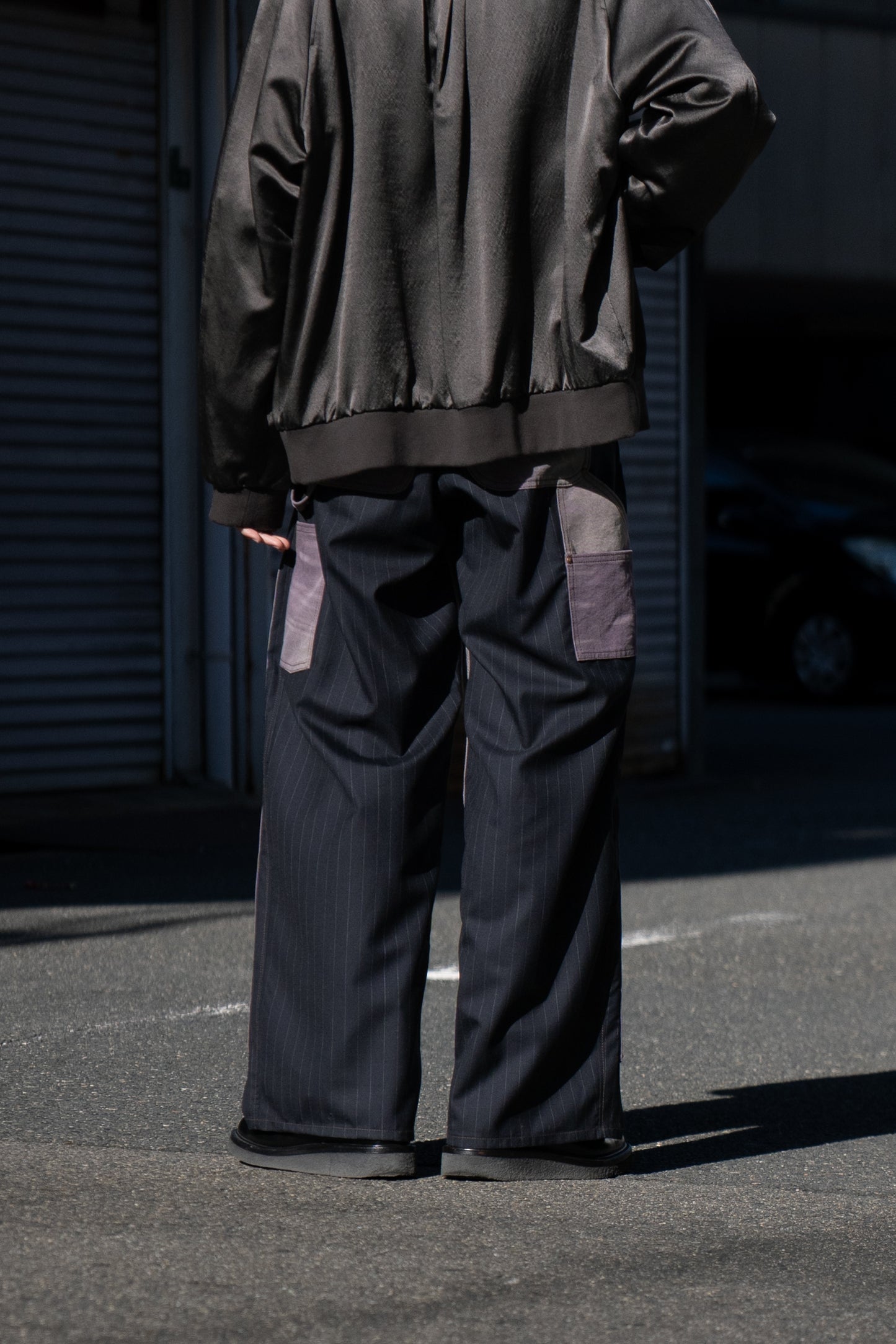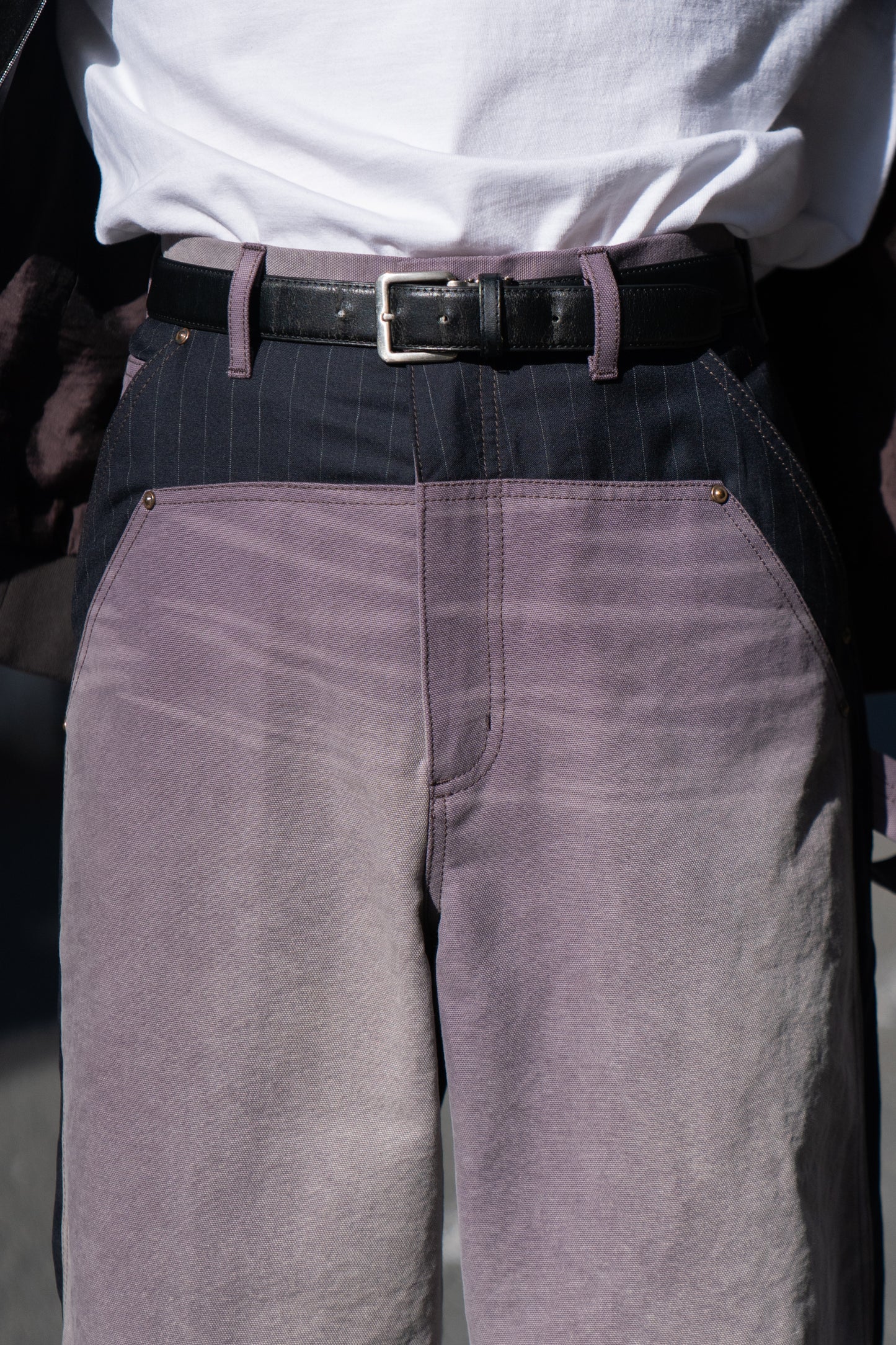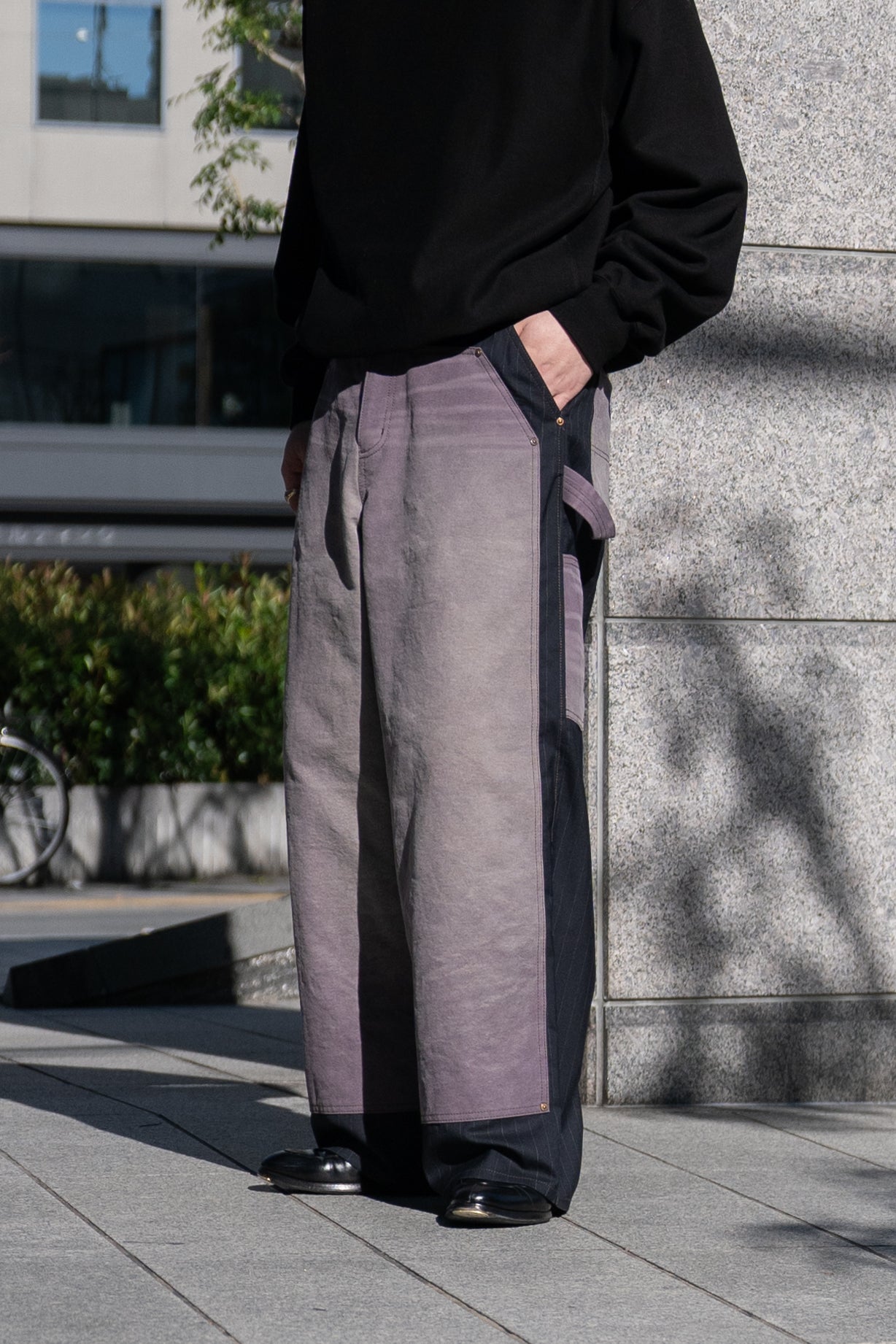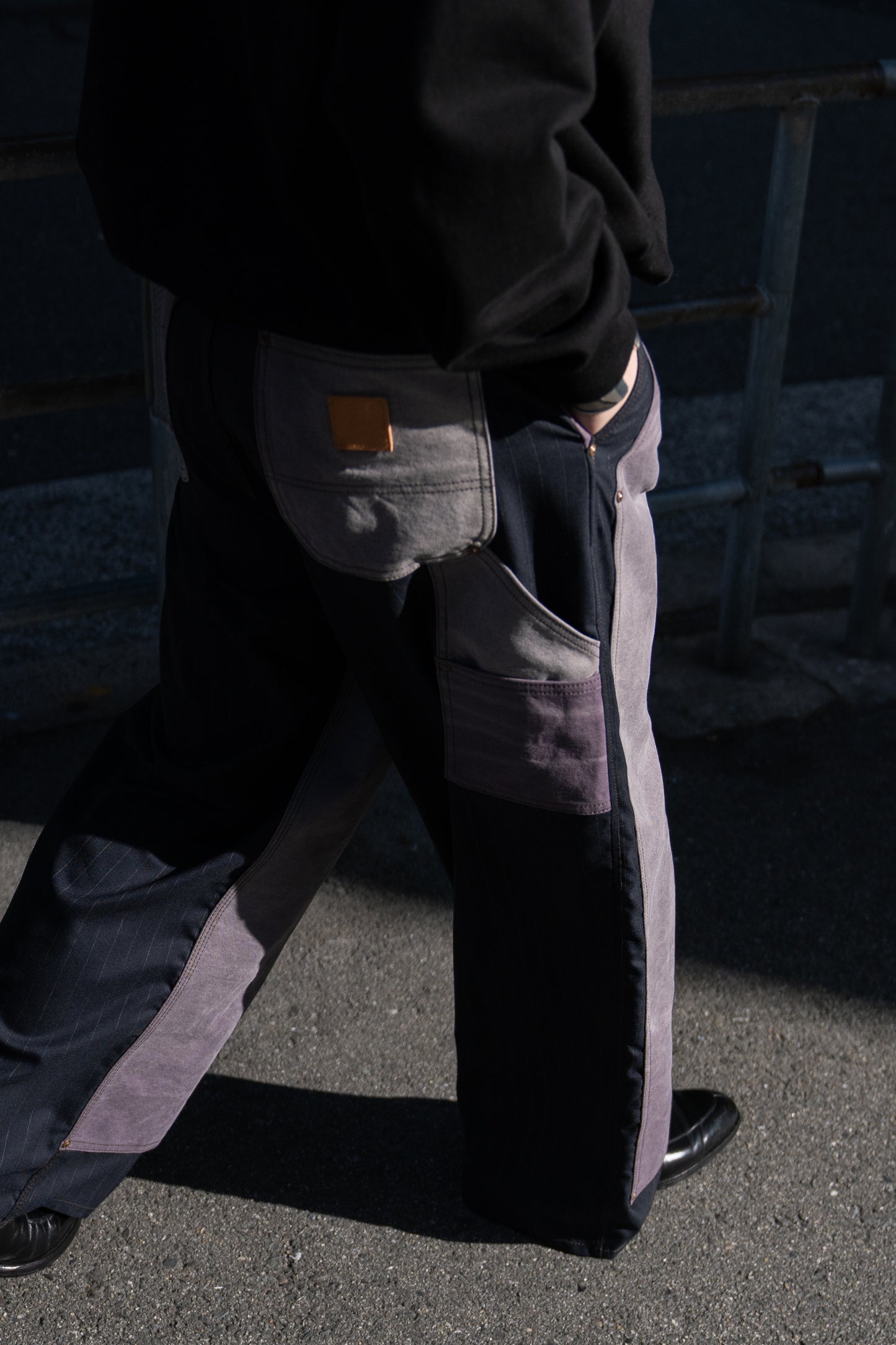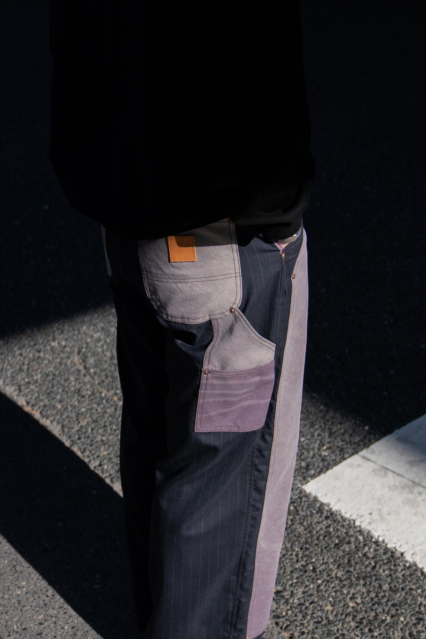 ヴィンテージの加工を施した前身頃の生地に対してペインターパンツ形のカッティングでストライプウールを組み合わせました。