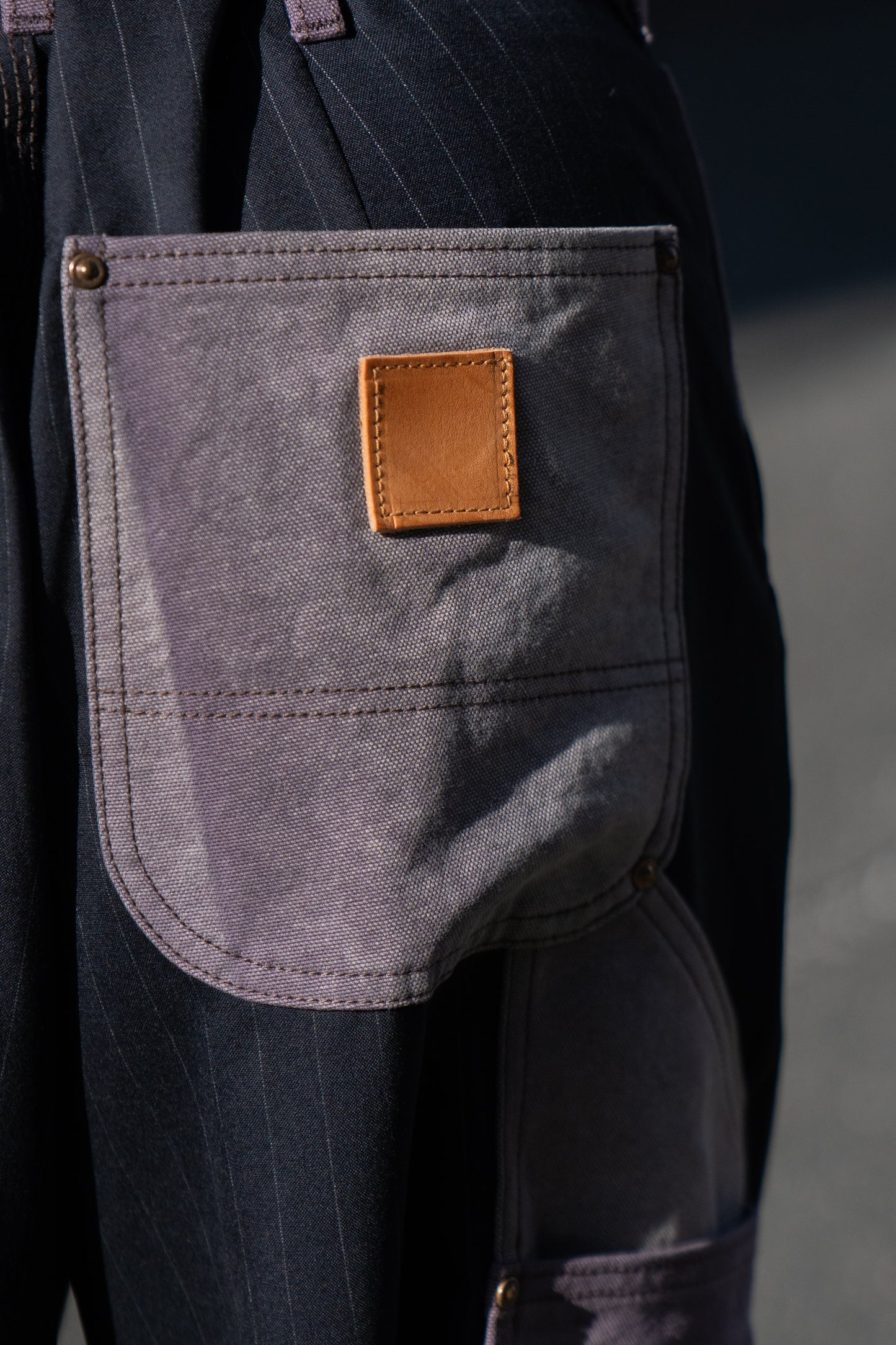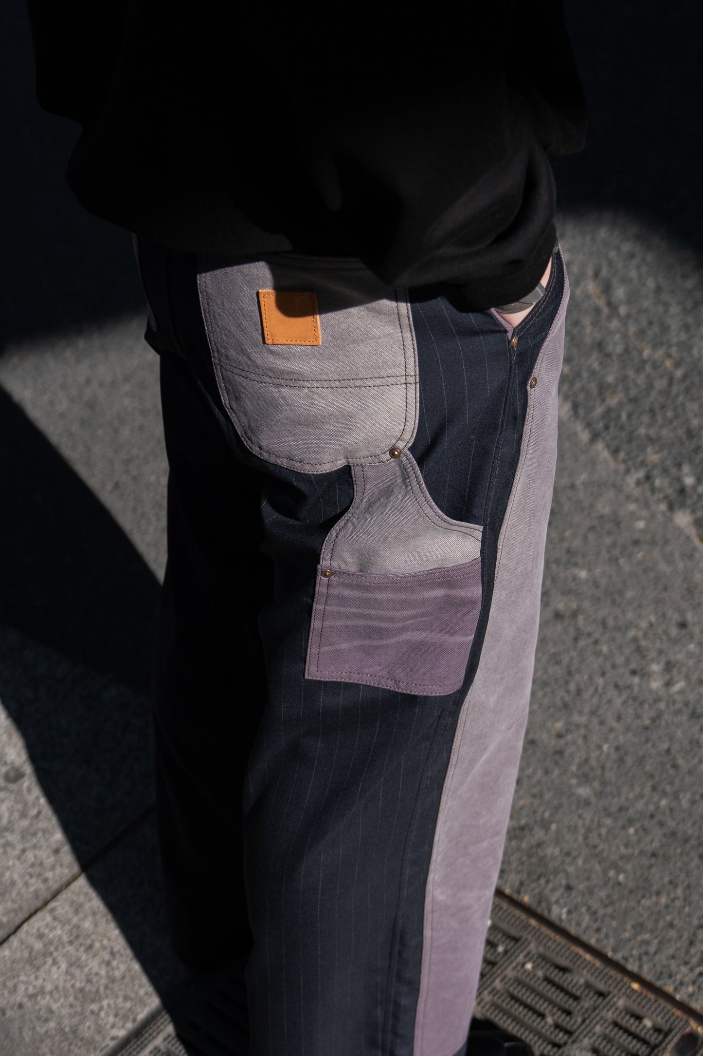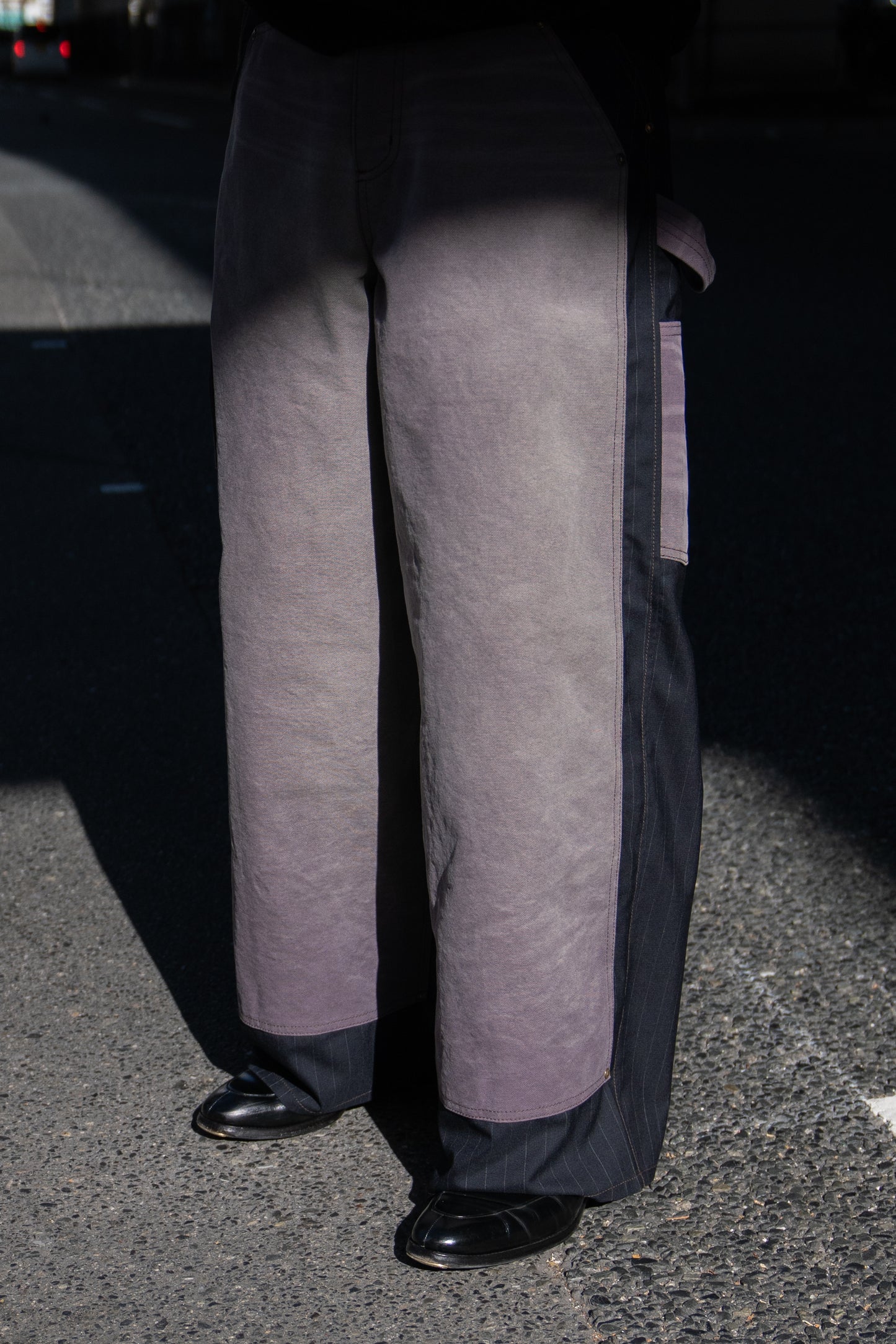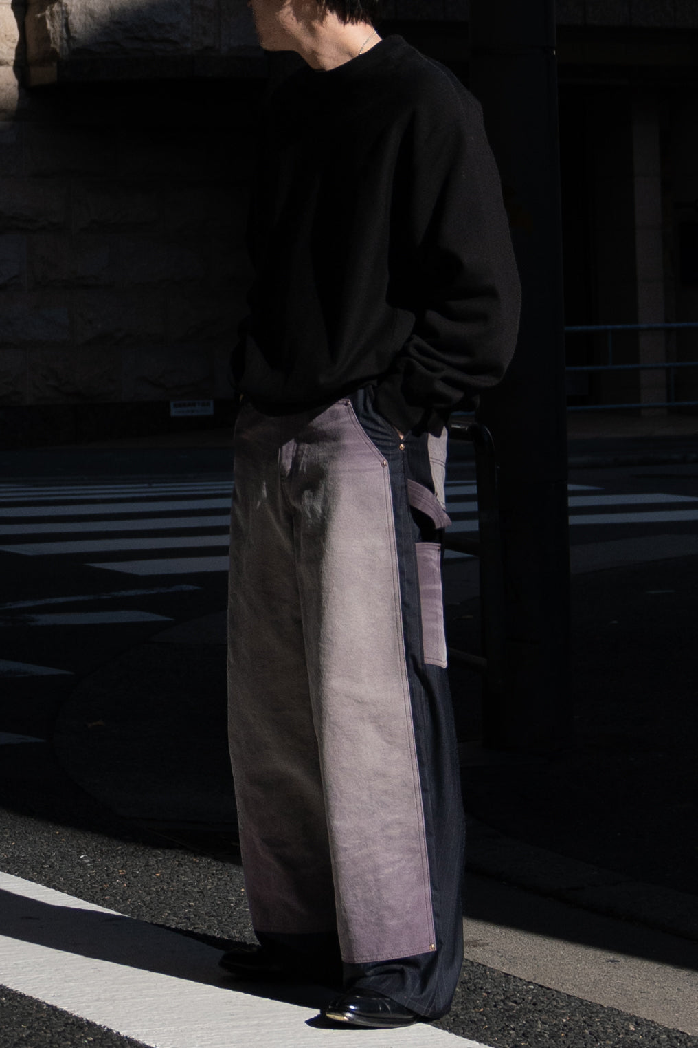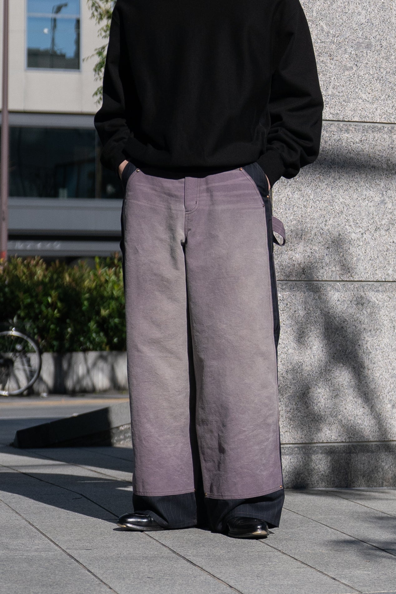 ヴィンテージの加工を施した前身頃の生地に対してペインターパンツ形のカッティングでストライプウールを組み合わせました。
