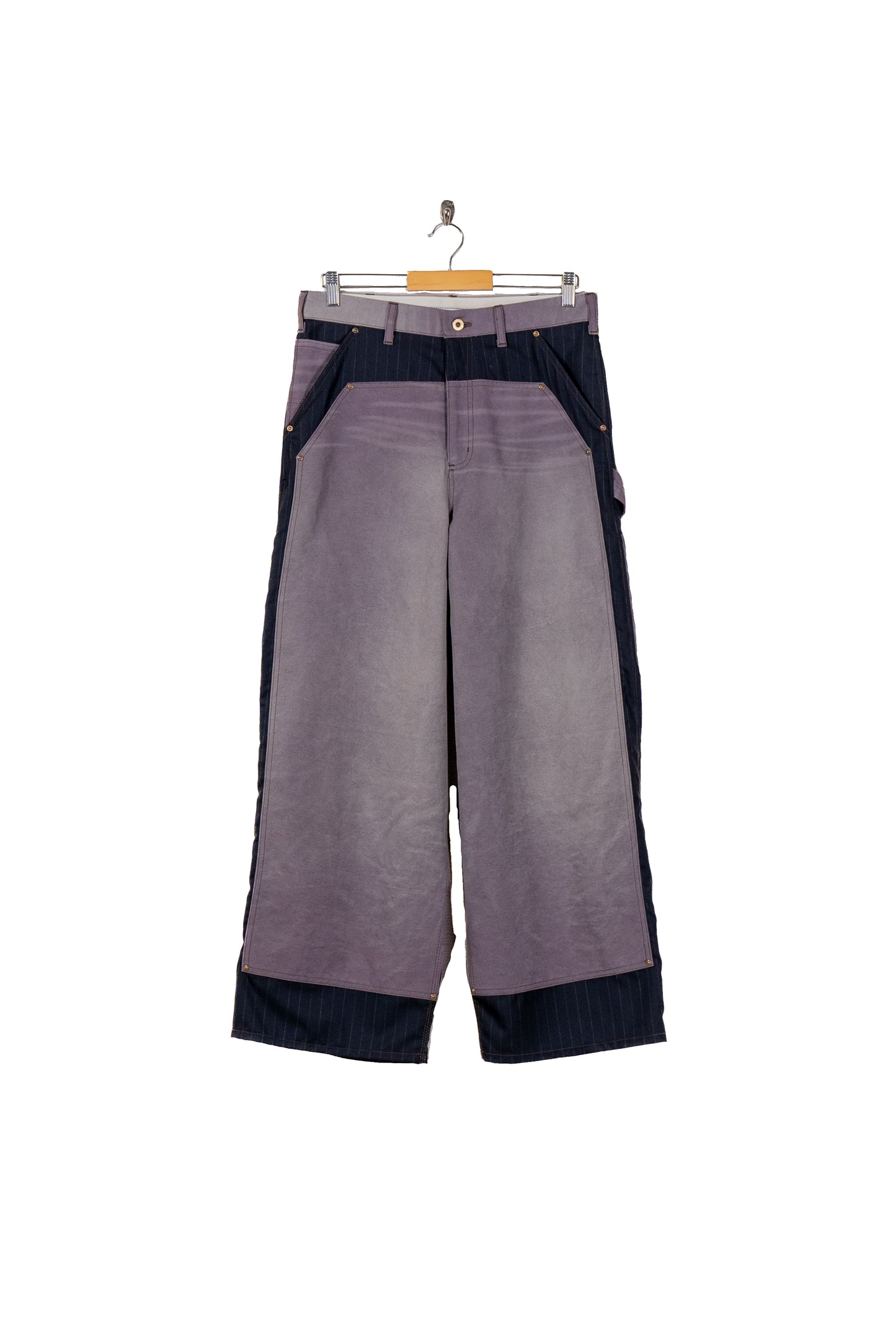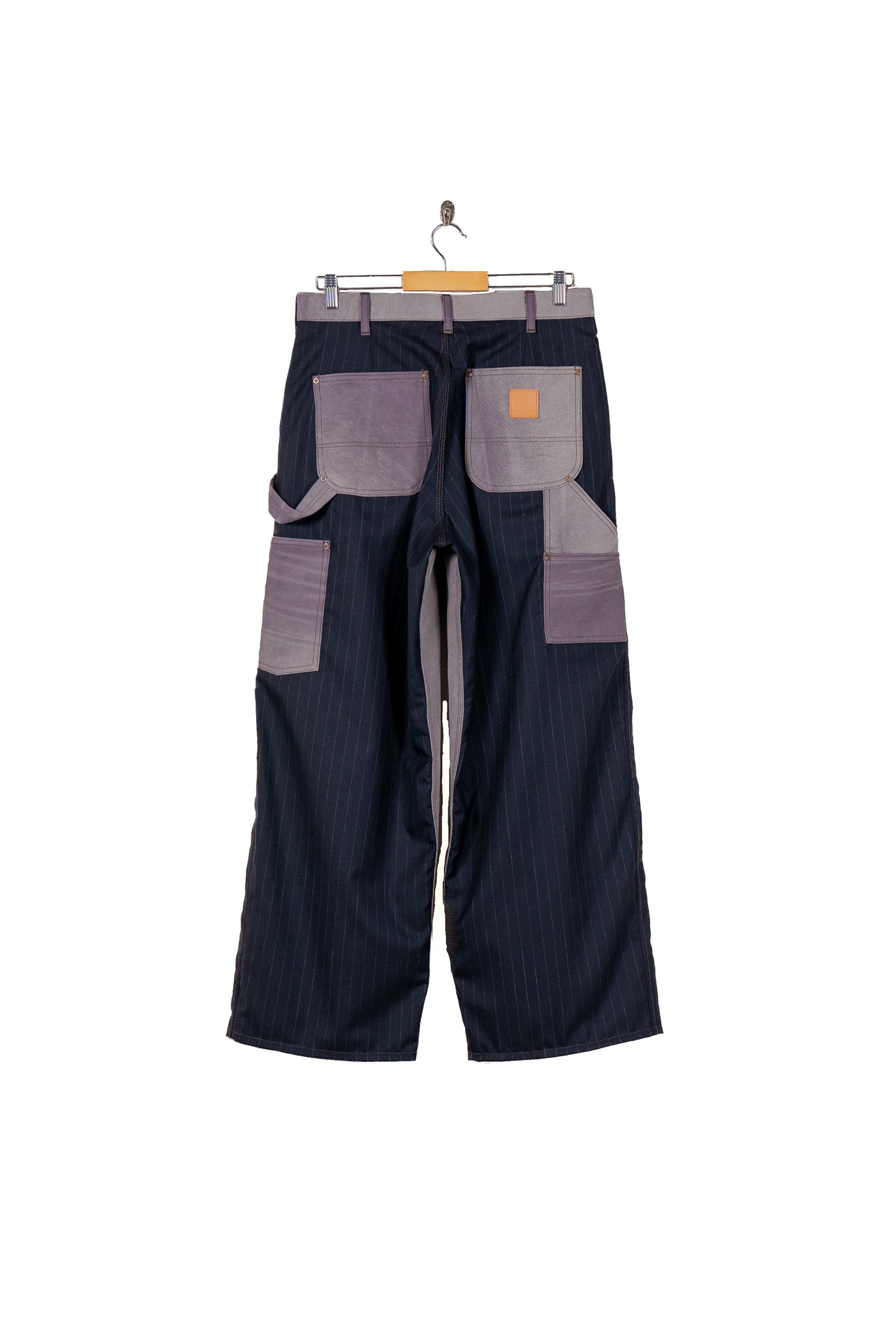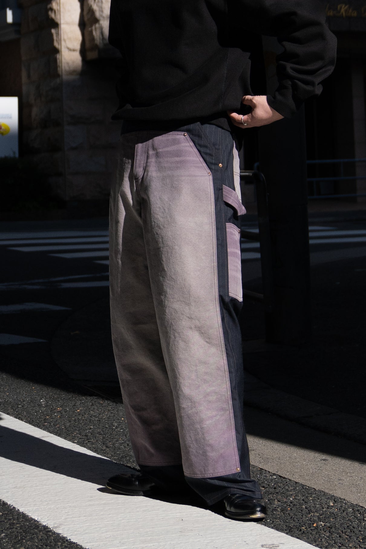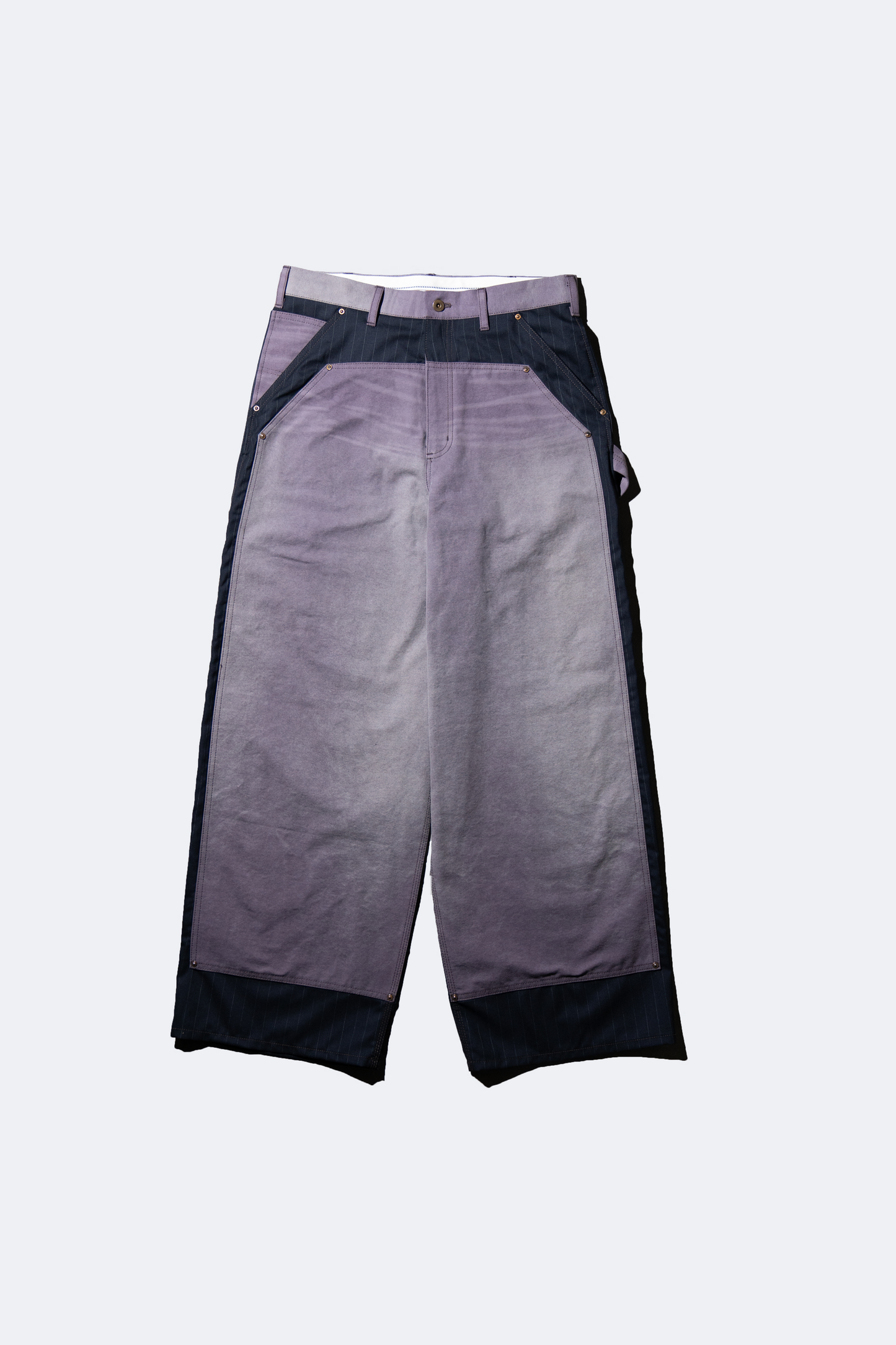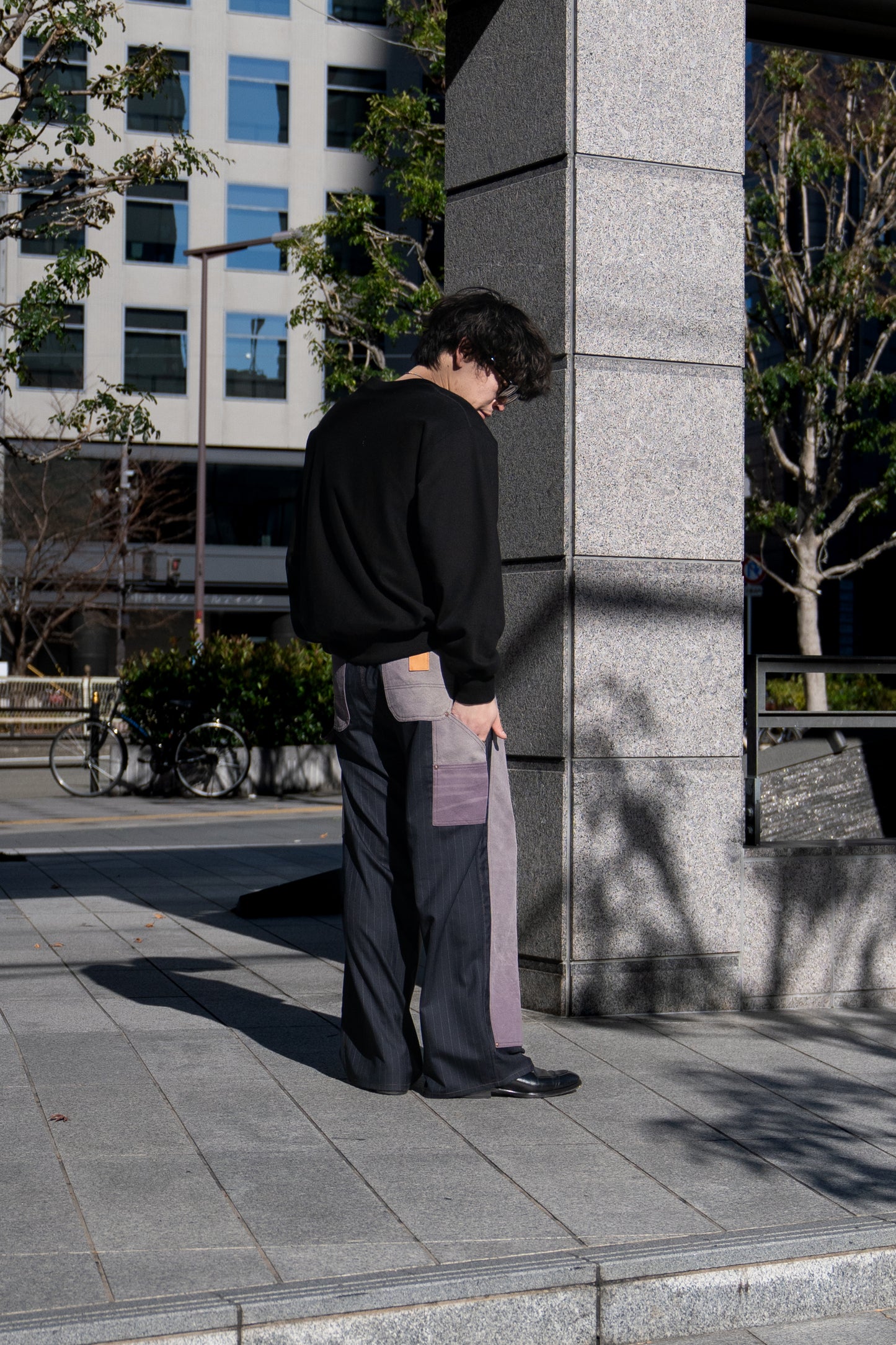 ヴィンテージの加工を施した前身頃の生地に対してペインターパンツ形のカッティングでストライプウールを組み合わせました。