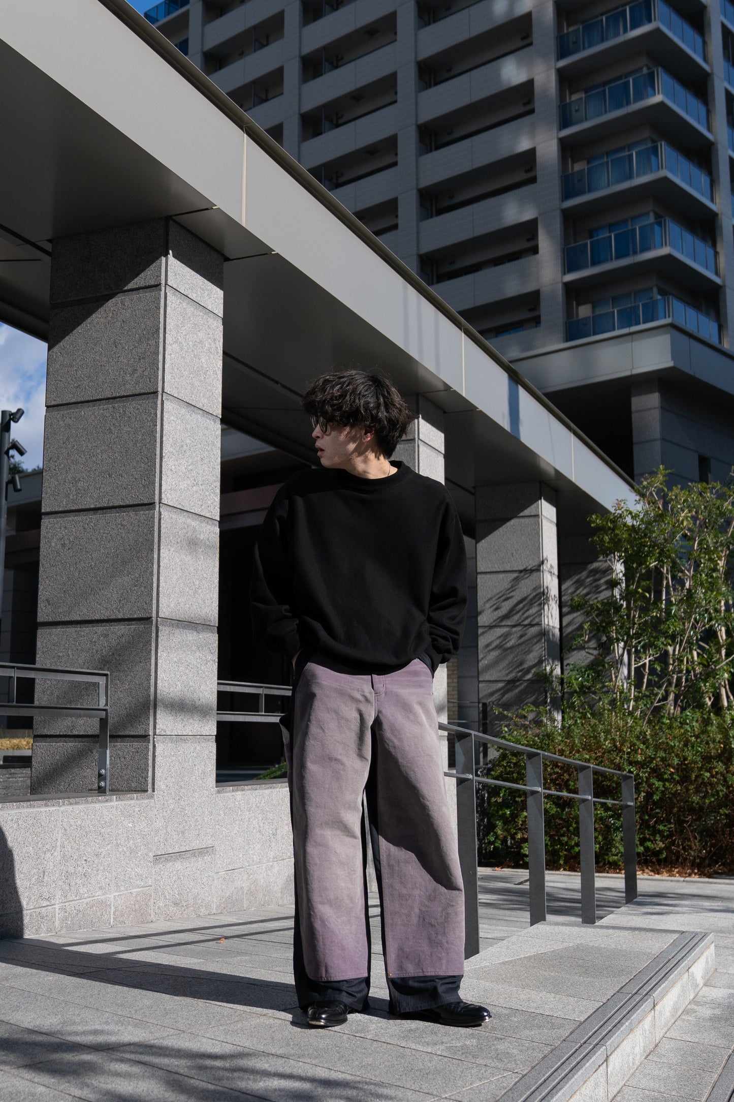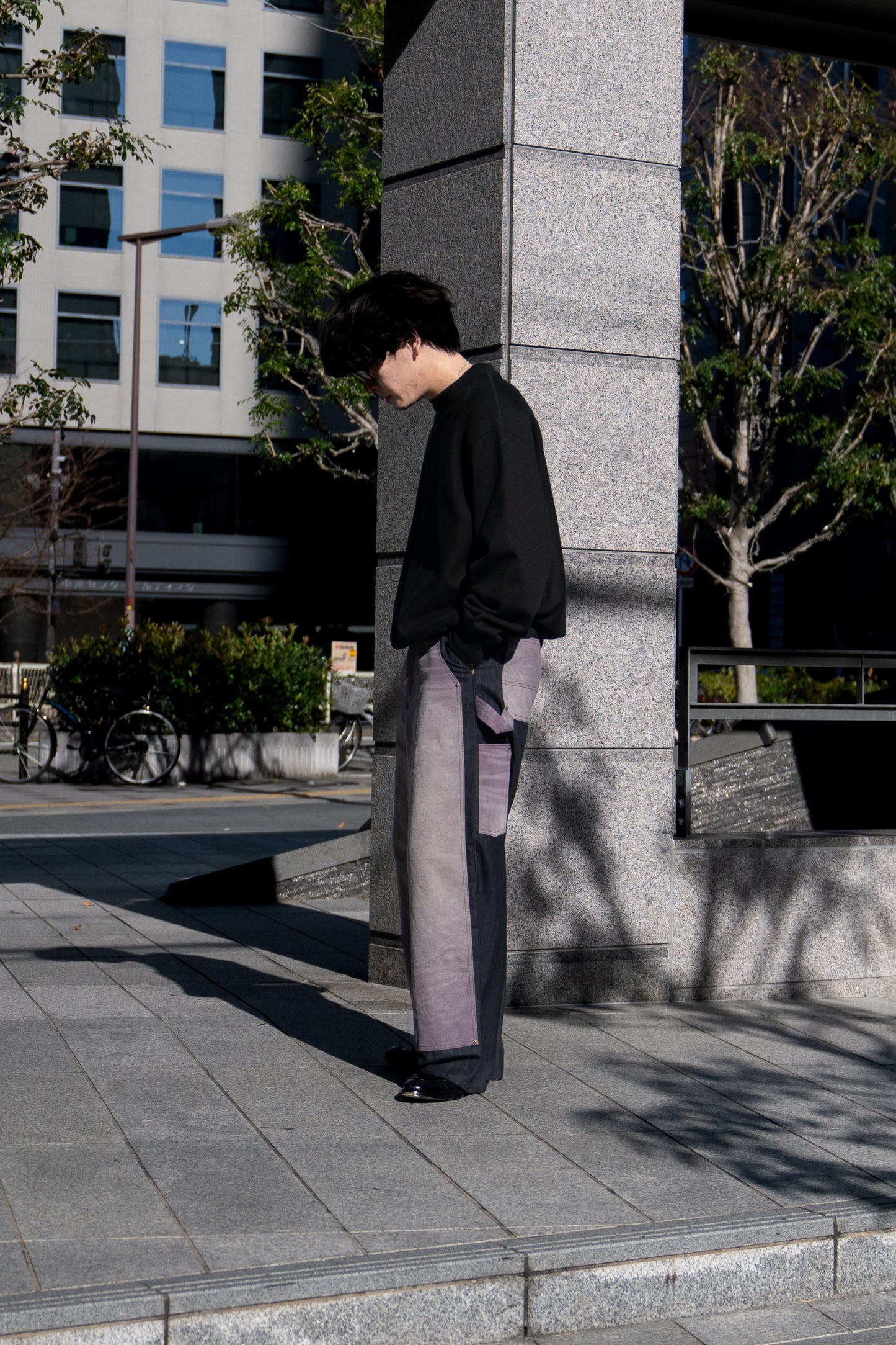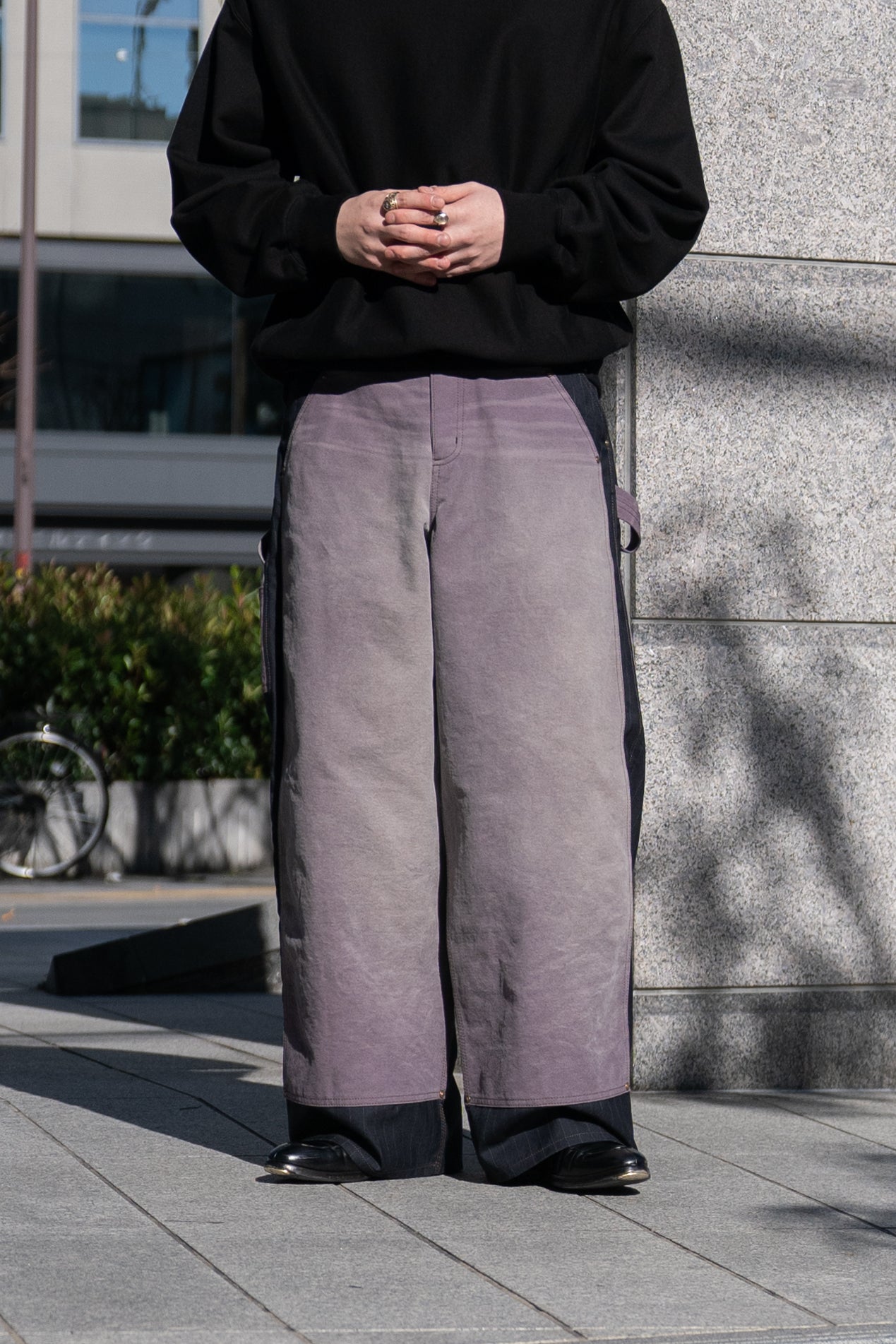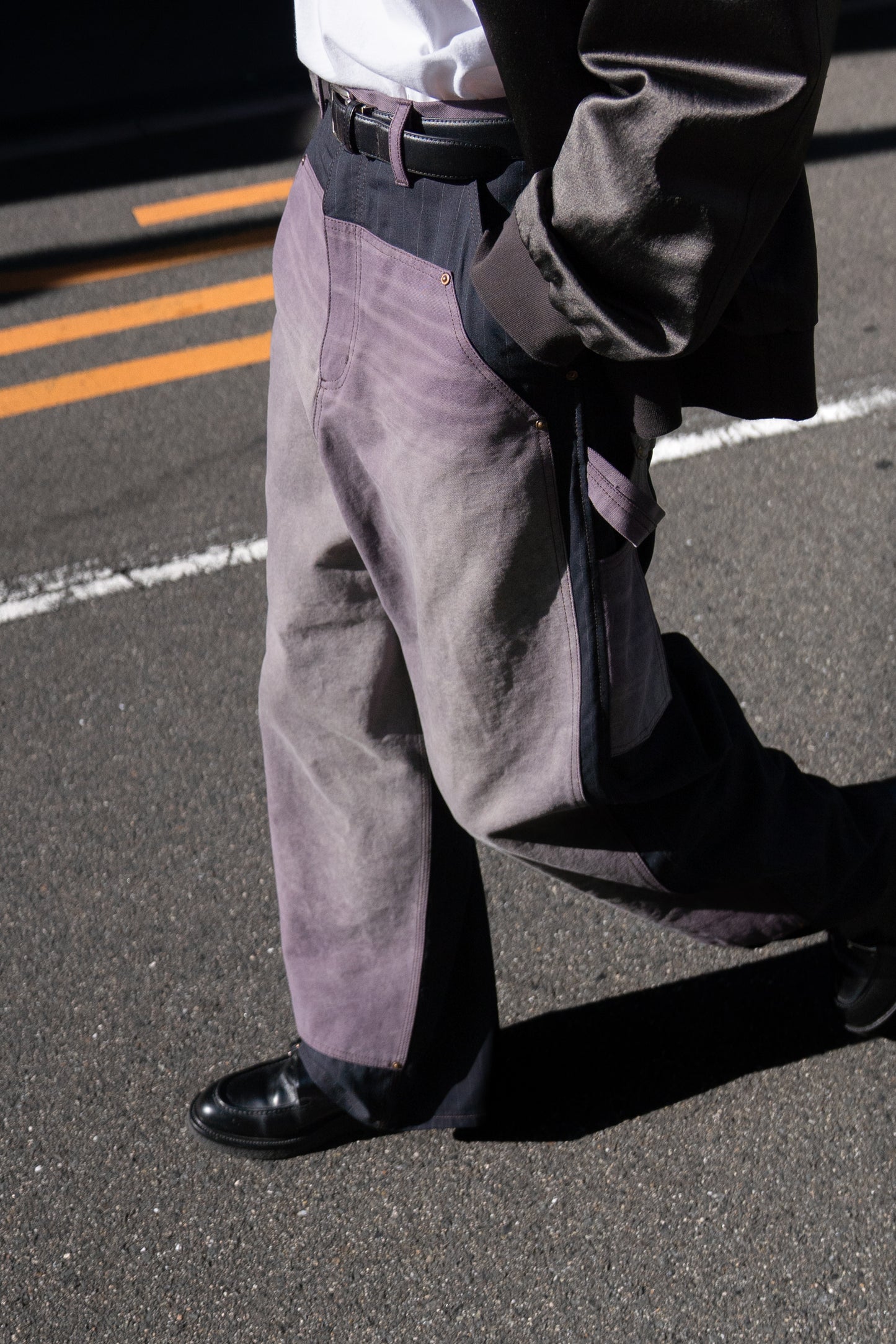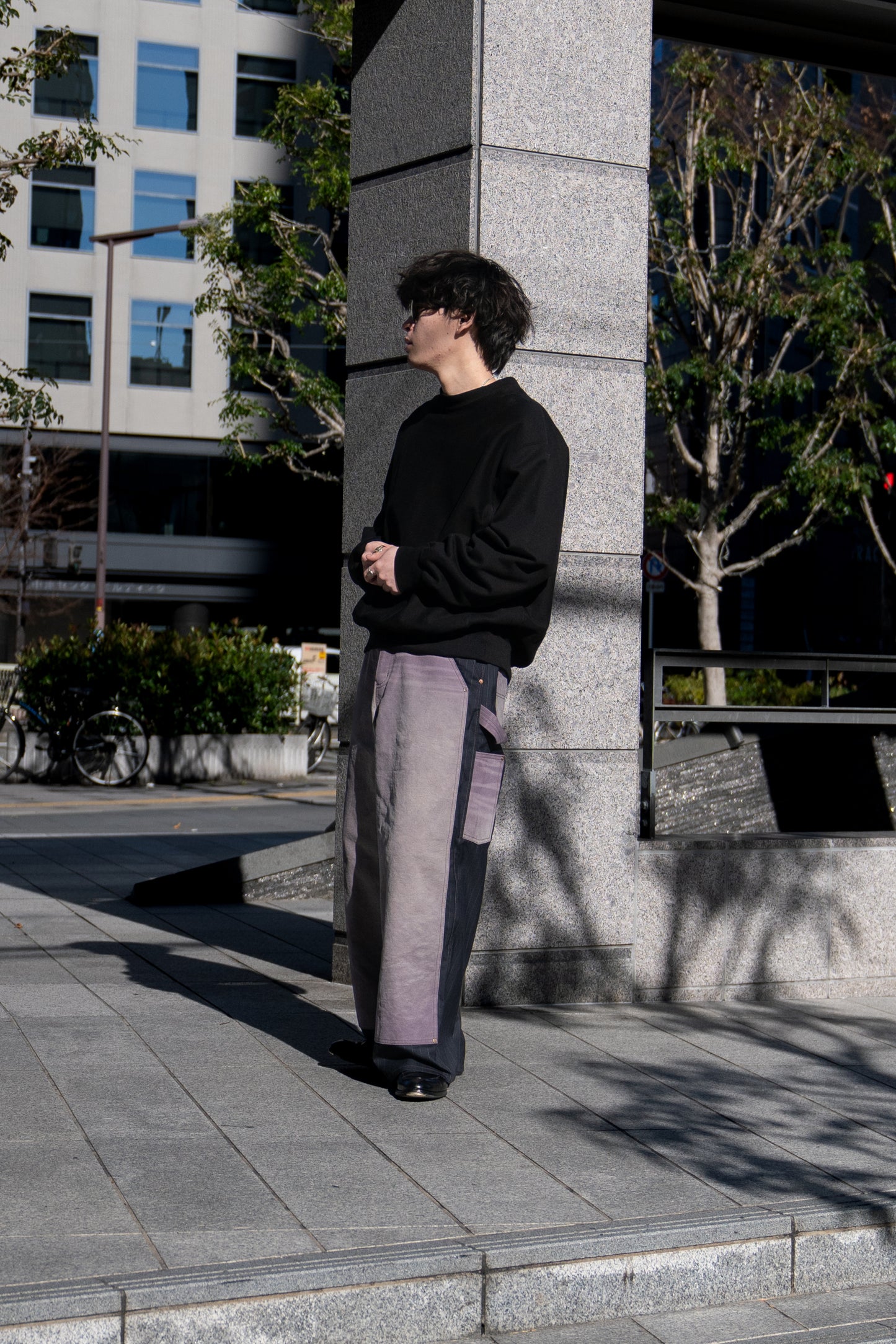 ヴィンテージの加工を施した前身頃の生地に対してペインターパンツ形のカッティングでストライプウールを組み合わせました。