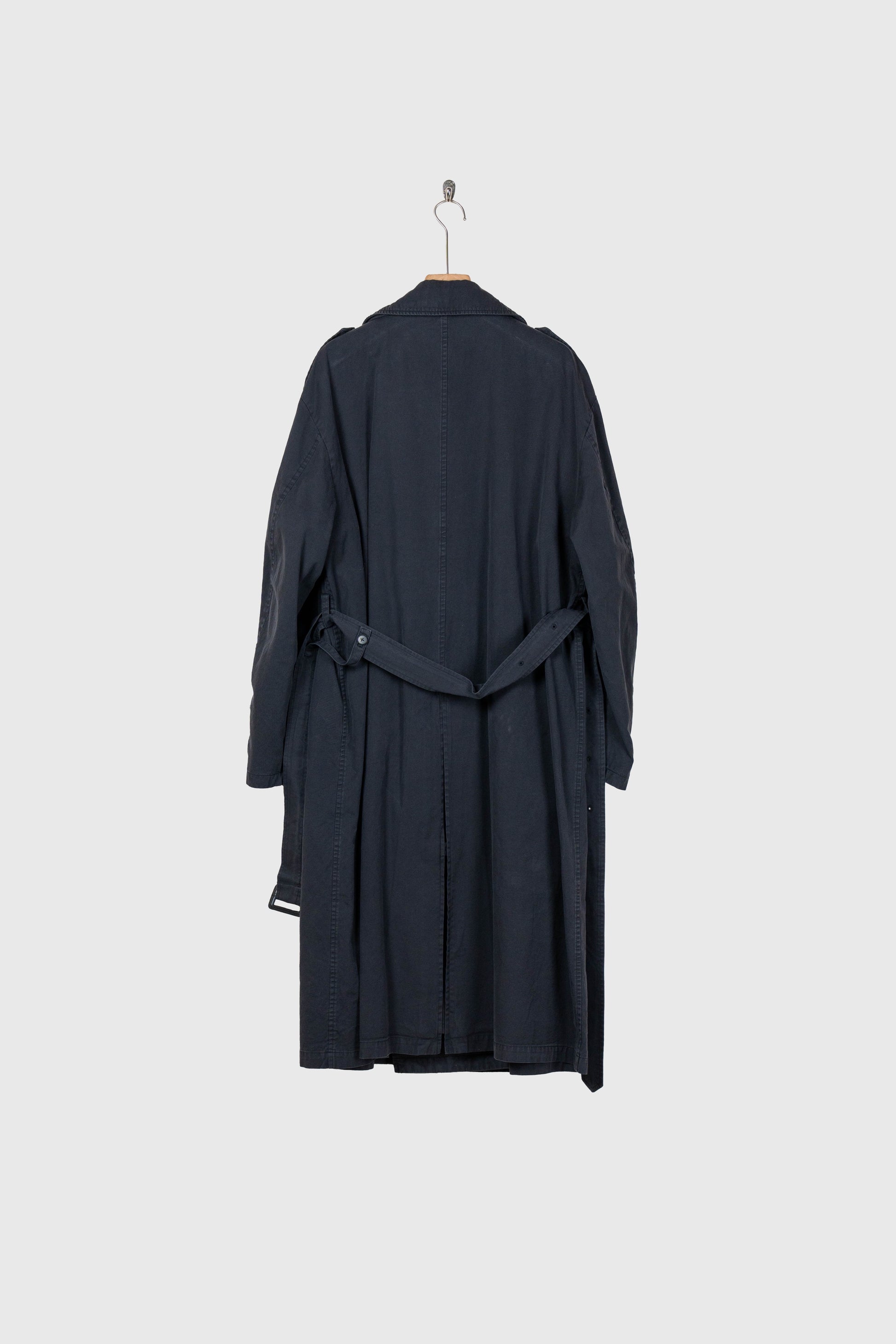 vintageのトレンチコートをベースに全体の表情、各ディテールを調整。 縫製後にボールバイオ、オーバーダイの加工を施し、パッカリング、タマムシの色味にニュアンスを出し、着古したような全体の印象に仕上げています。